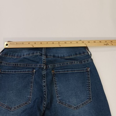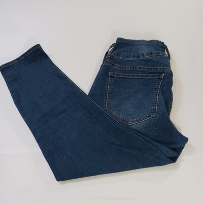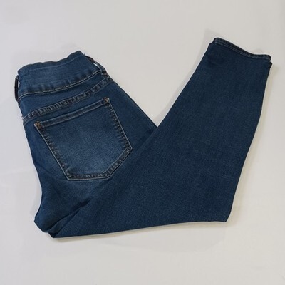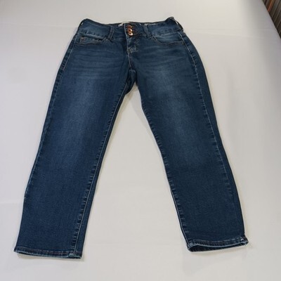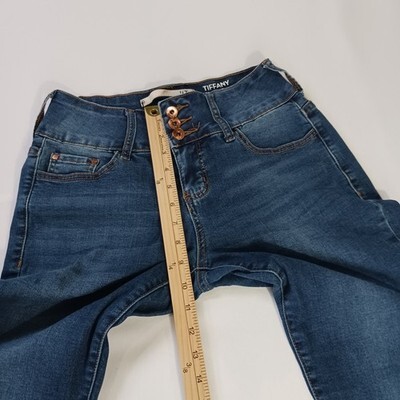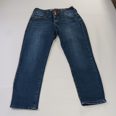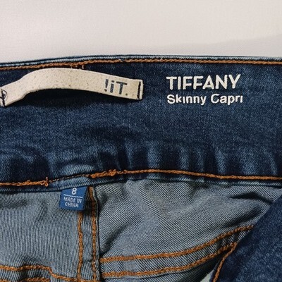 The !It Tiffany Skinny Capri Women's Jeans in size 8 feature a solid blue color with a button closure and mid-rise fit. Made from a blend of polyester, spandex, and cotton denim, these pants offer a comfortable regular fit with a 23-inch inseam. The skinny style and distressed detailing add a trendy touch to this fashionable and versatile wardrobe essential for women.