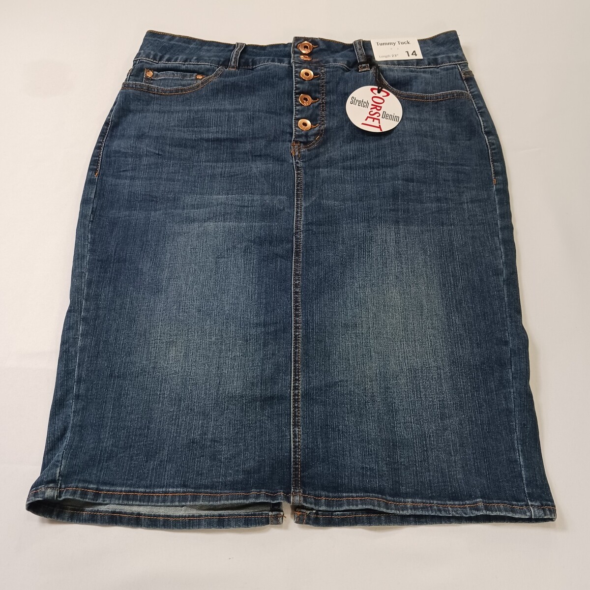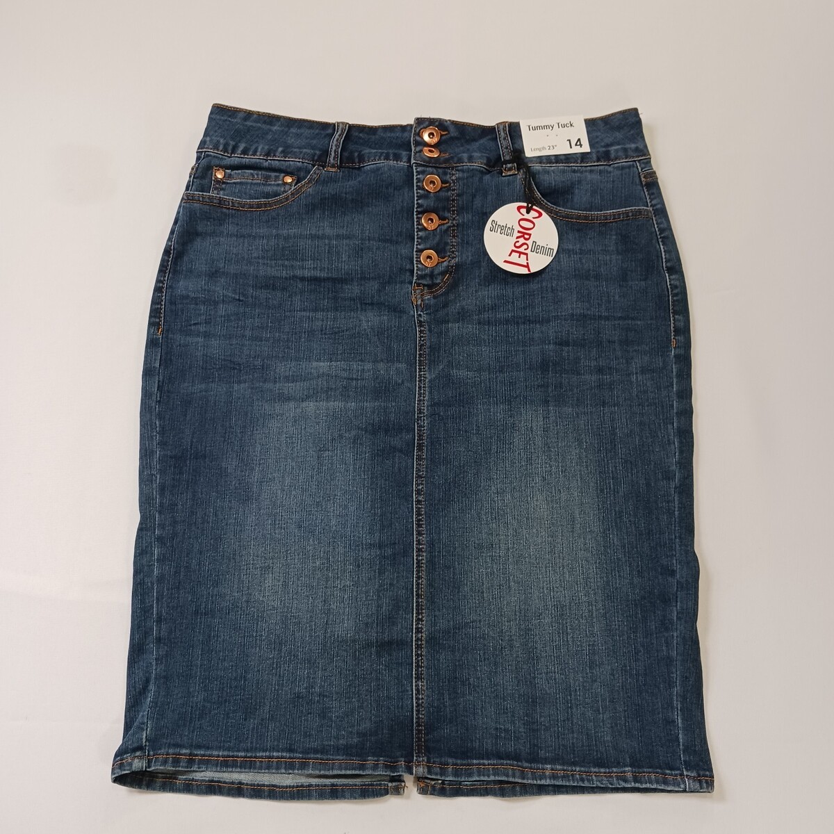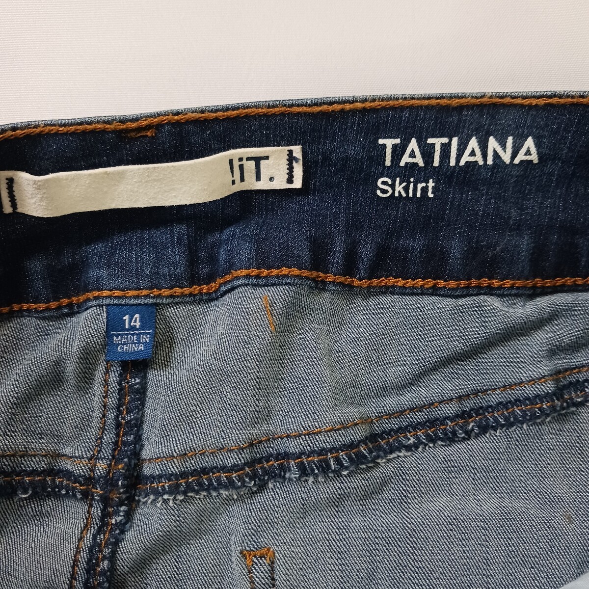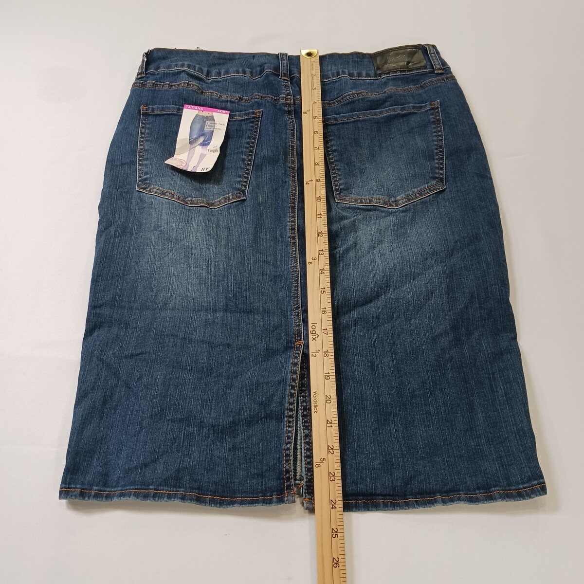 The iT Tatiana Women's Size 14 Blue Jean Skirt is a stylish and versatile addition to any wardrobe. Made from a blend of polyester, spandex, and cotton, this skirt features a solid blue color with a stretch denim fabric type. The triple button and zip closure adds a modern touch, while the straight and pencil style offers a classic and timeless look. Perfect for travel, casual outings, or workwear, this skirt has a 24-inch length and includes accents such as buttons and zippers. Machine washable and suitable for all seasons, this skirt is a must-have for any fashion-forward woman.