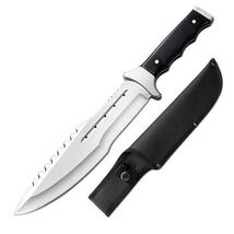 This impressive Texas spiked bowie knife combines classic design with modern functionality. Measuring 15 inches in overall length with a substantial 9.5-inch stainless steel alloy blade, this full-tang knife is built for serious use. The blade features distinctive serrations and a classic Bowie-style profile that commands attention. The ergonomic hardwood handle is securely pinned to the full tang construction, providing excellent durability and control. Premium details include a protective steel bolster guard and steel pommel that enhance both aesthetics and functionality. The knife comes complete with a durable nylon sheath for safe storage and transport. The robust full tang construction ensures stability and strength throughout the entire length of the knife. Whether for collection or practical use, this knife's quality craftsmanship and imposing presence make it a noteworthy addition to any knife enthusiast's arsenal.