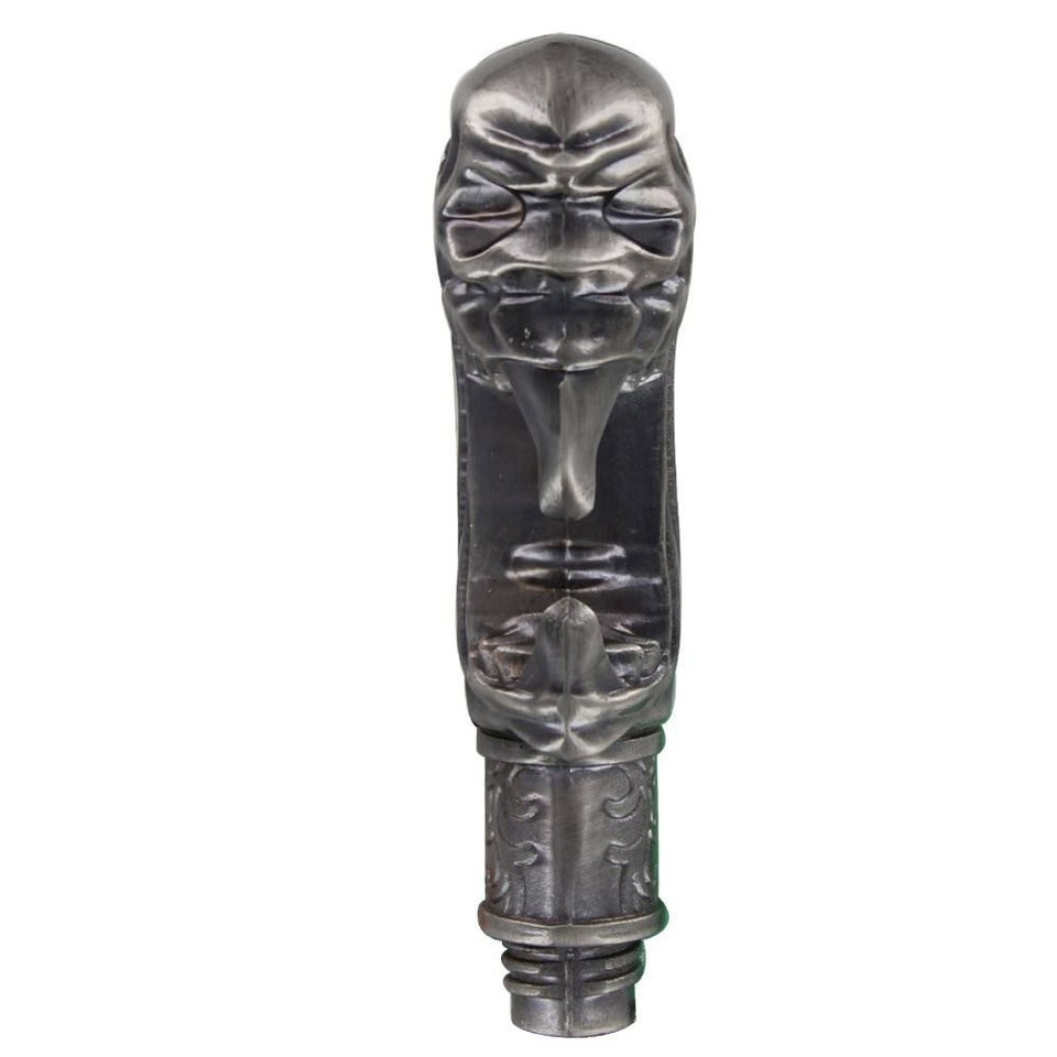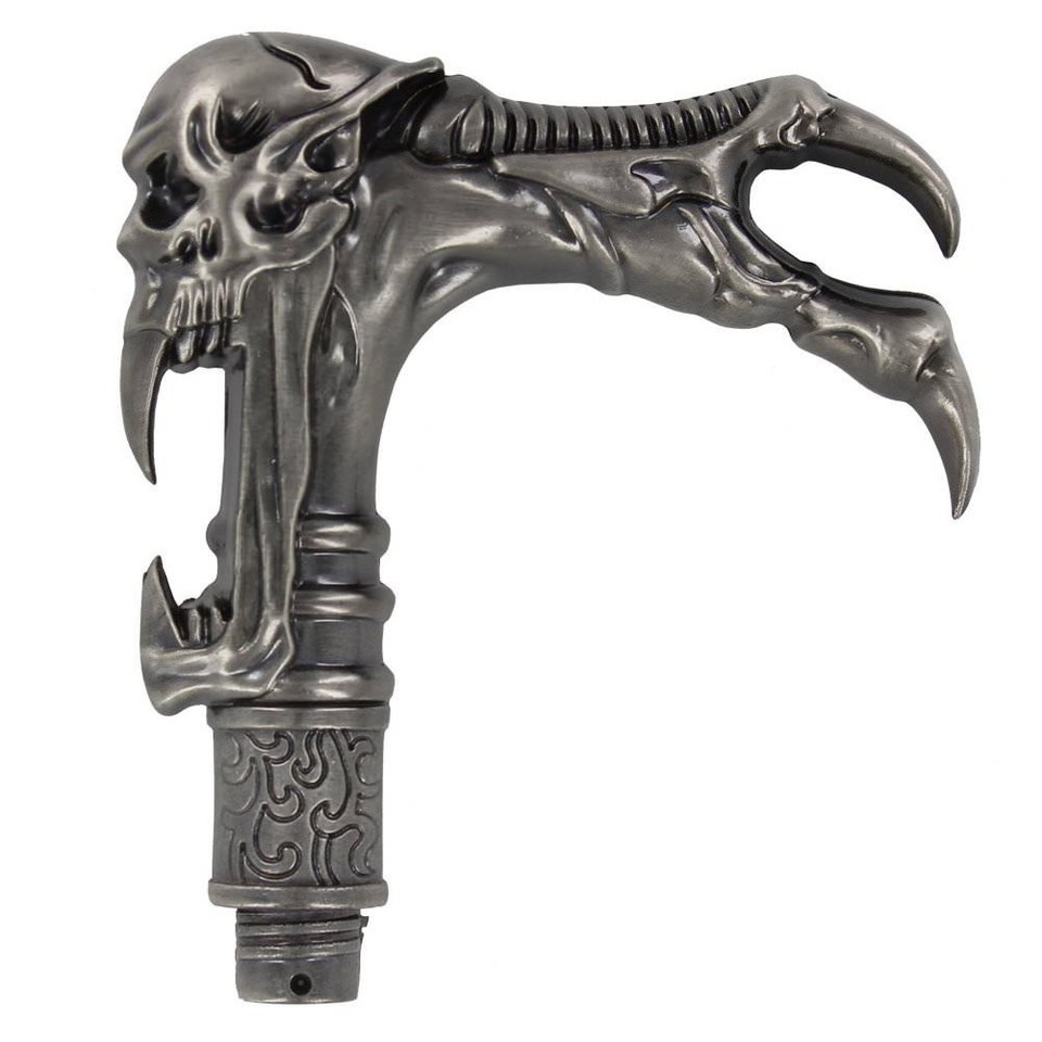 This cane features a screaming alien head with two cyborg mechanical claws coming out the back of his skull. The brushed metal finish on the handle gives this cane a mechanical futuristic look. The shaft is constructed of a durable stainless steel with a black finish. The cap and tip of the shaft is a stainless steel with a rubberized tip for balancing when walking. Overall length is 36 inches.