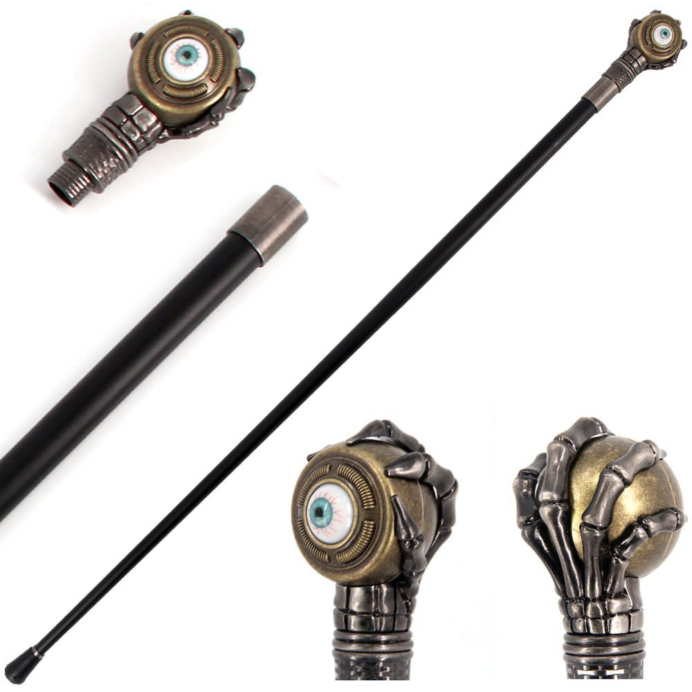 The great men of the last two centuries have carried canes, from Sherlock Holmes, to Gregory House and of course Scrooge McDuck. Every Gentleman Requires a Cane. This cane is not a substitute for a medical walking device. The cane shaft has been constructed from steel with a black glossy finish. The bottom of the cane features a tough rubber gripper. The head of the cane has been constructed from steel with Rolling Evil Eye with Skeletal Hand Handle.