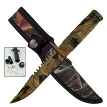 The outdoor camo fixed blade survival knife features a 4.25-inch blade designed for reliability and rugged performance in survival situations. Crafted for durability, this knife is ideal for outdoor adventures, camping, and emergency scenarios. Its sturdy blade ensures effective cutting and slicing, while the ergonomic handle provides a secure grip for enhanced control. Whether you're preparing for a trek or equipping your survival gear, the knife delivers practicality and resilience.