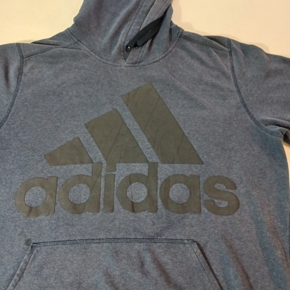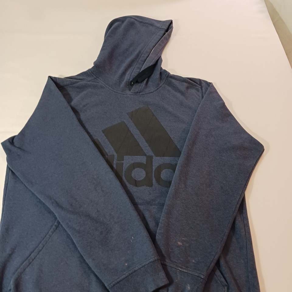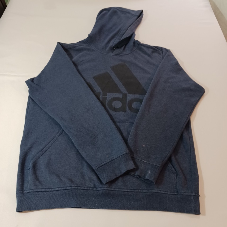 This is a men's black adidas hoodie in size large, made of a polyester, cotton, and cotton blend material. It has a drawstring closure, long sleeves, and a hood. The hoodie is a pullover style with a regular fit, featuring the adidas Originals product line.