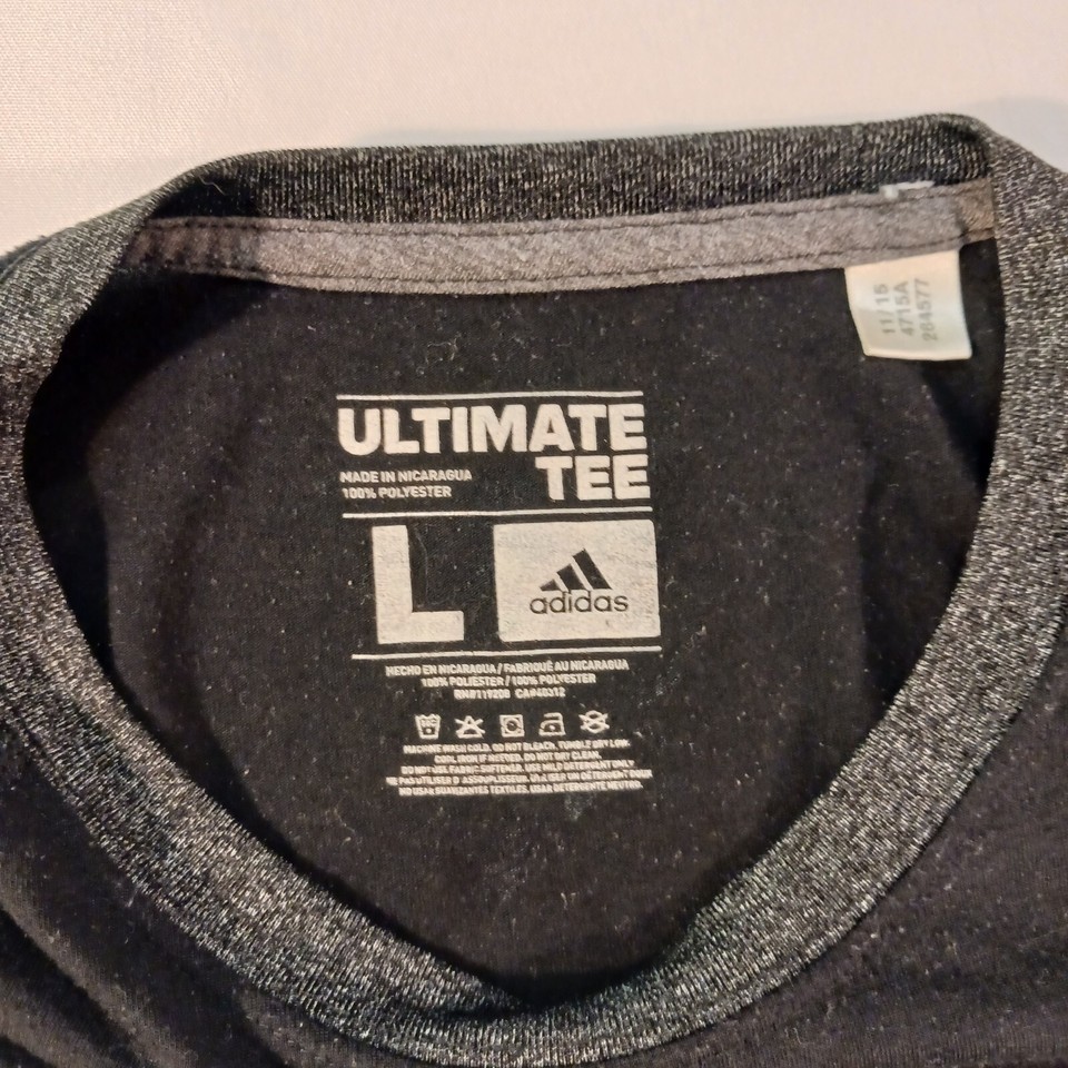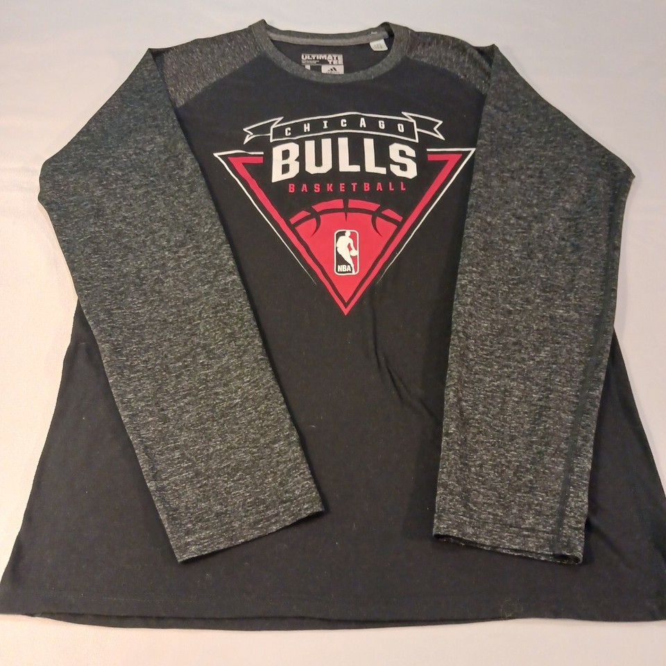 This Adidas Ultimate Tee is perfect for any Chicago Bulls basketball fan. The black and gray shirt features long sleeves, a regular fit, and is made of polyester material. With the iconic Adidas brand and Bulls logo, this shirt is sure to make a statement. Ideal for men who want to show off their team pride while also staying comfortable. The shirt is available in size L and is manufactured in Nicaragua.