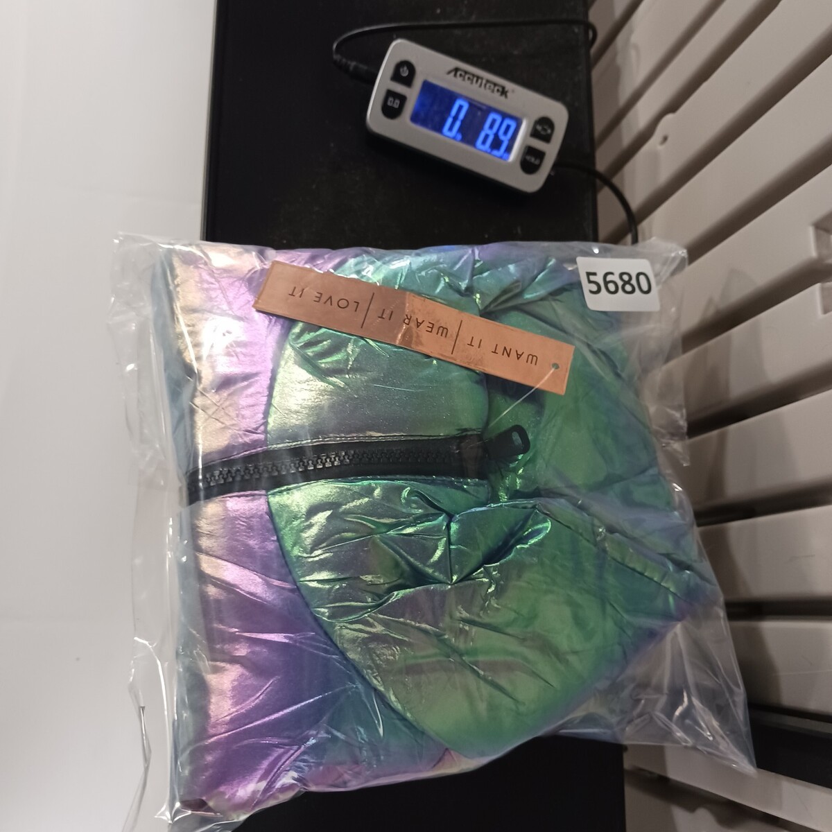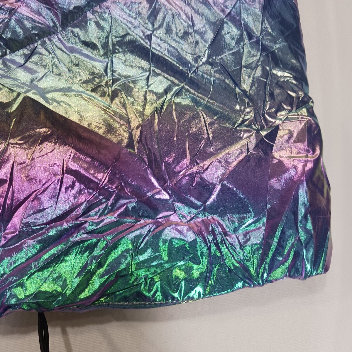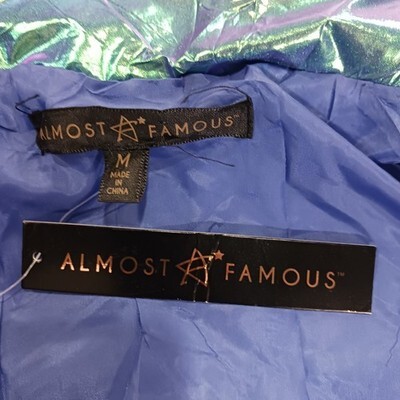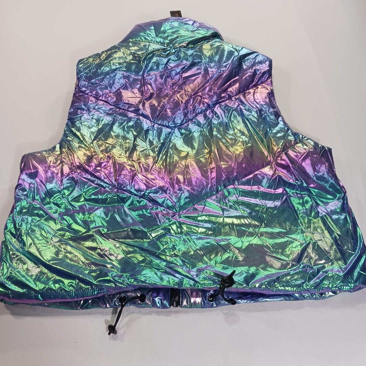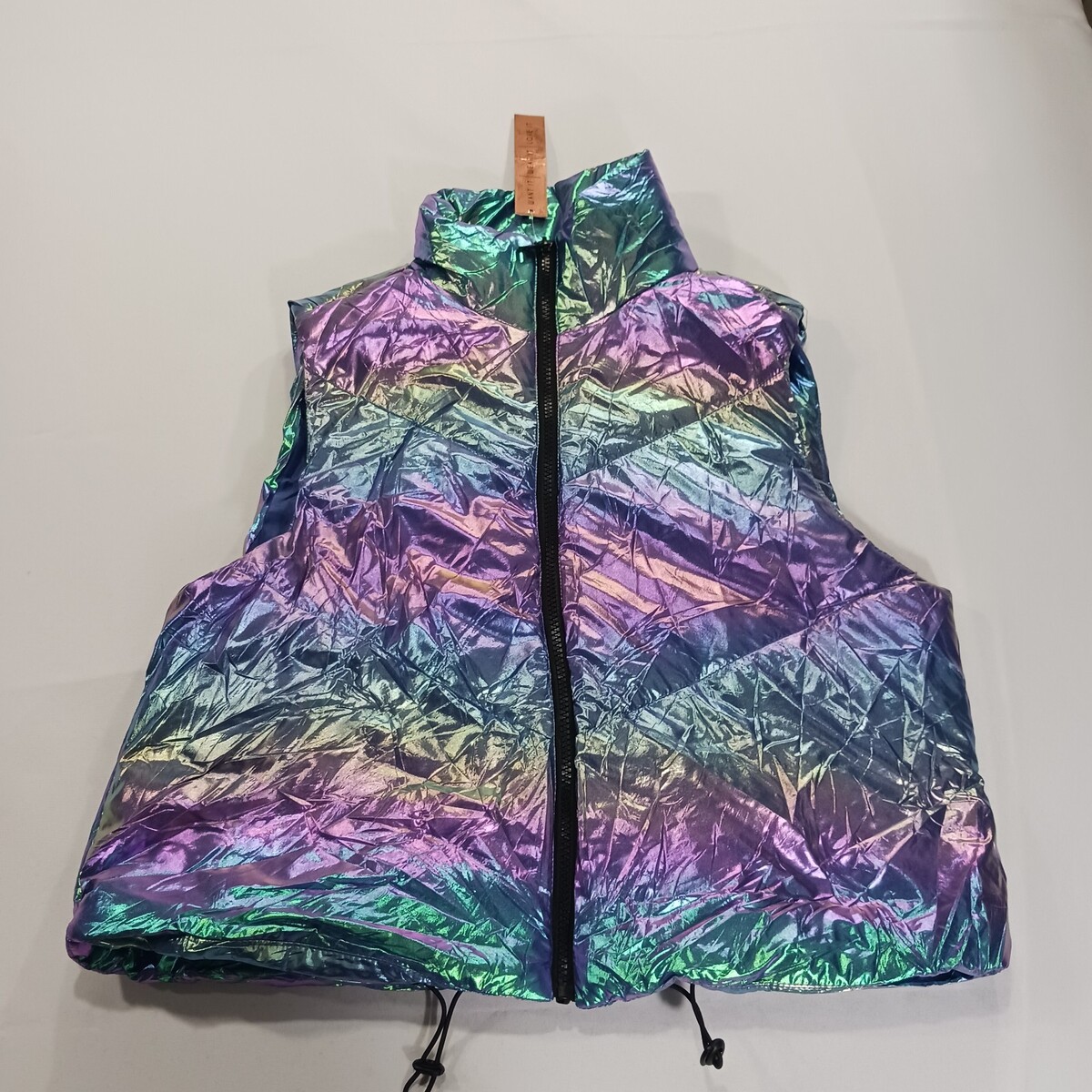 The Almost Famous RN#52469 Women’s Iridescent Rainbow Zip Quilted Vest in size medium is a stylish and colorful outerwear piece perfect for any woman's wardrobe. Made from polyester with a quilted design, this sleeveless vest features a zip closure for easy wear. The multicolor rainbow theme adds a fun and vibrant touch, making it a versatile and trendy option for various outfits. Easy to care for and comfortable to wear, this vest is a fashionable addition to any collection.