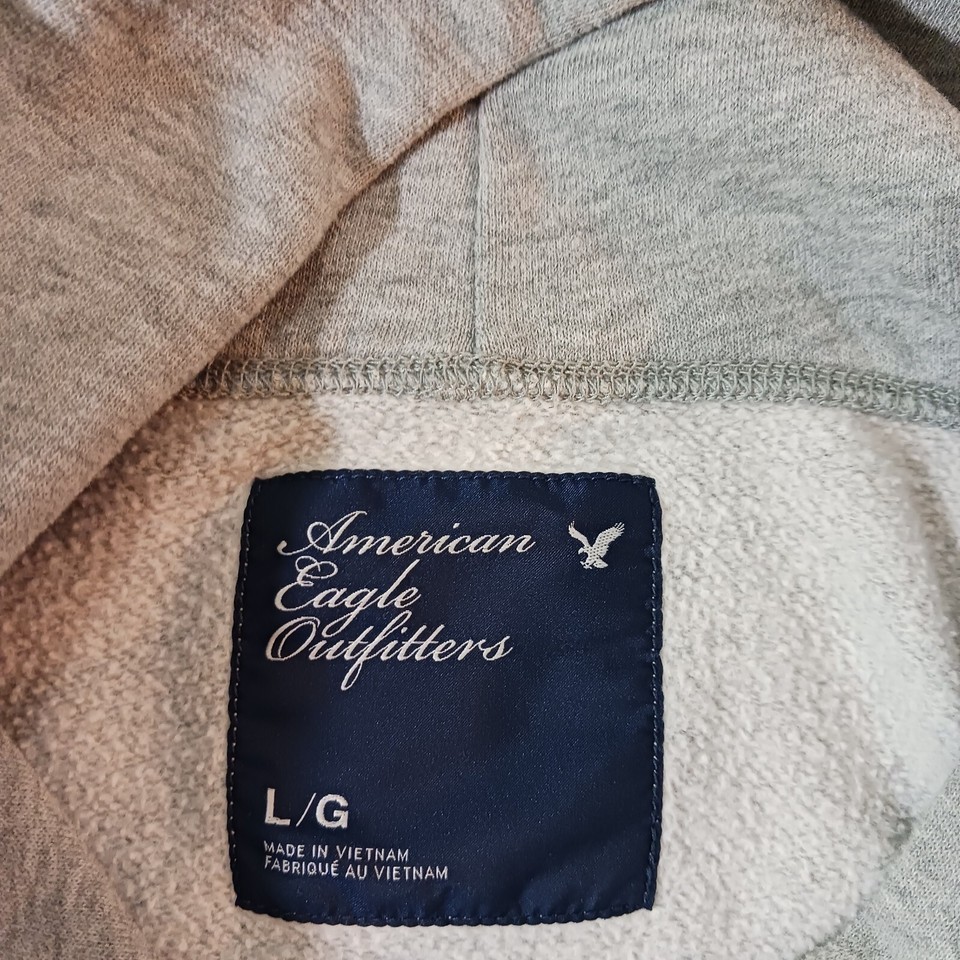 This American Eagle Outfitters Seventy Seven hoodie is a women's size L in a stylish gray color. It features a crew neck, long sleeves, and a pullover style with a 23-inch sweater length. The hoodie includes a graphic print logo, a blended fabric material with a cotton lining, and a regular fit. Perfect for casual or activewear occasions during the winter, fall, or spring seasons, this cozy hoodie also has pockets for added functionality. Ideal for walking or running, this sweatshirt embodies a trendy American theme.