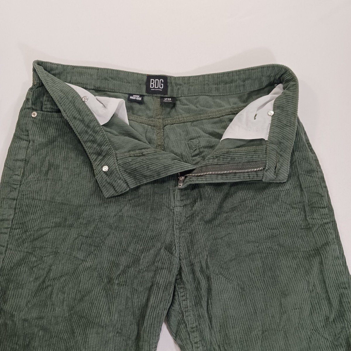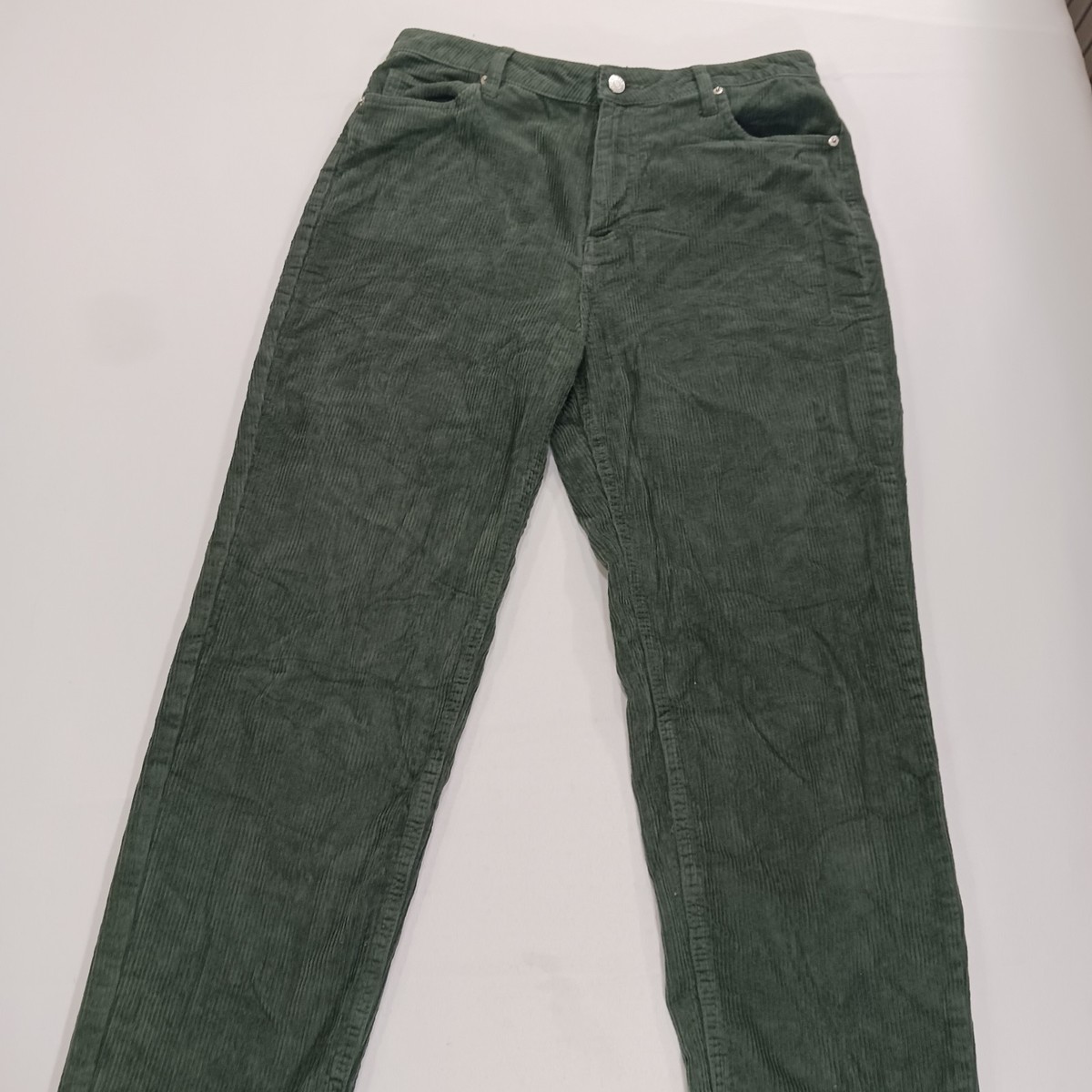 These BDG Urban Outfitters Pants are a stylish addition to any woman's wardrobe. The high-rise, tapered leg design in green corduroy fabric offers a comfortable fit with a modern twist. Featuring a zip and button closure, these pants are perfect for casual occasions or travel during the winter and fall seasons. The ankle length and breathable fabric make them easy to care for and suitable for everyday wear, adding a touch of classic yet trendy style to any outfit.