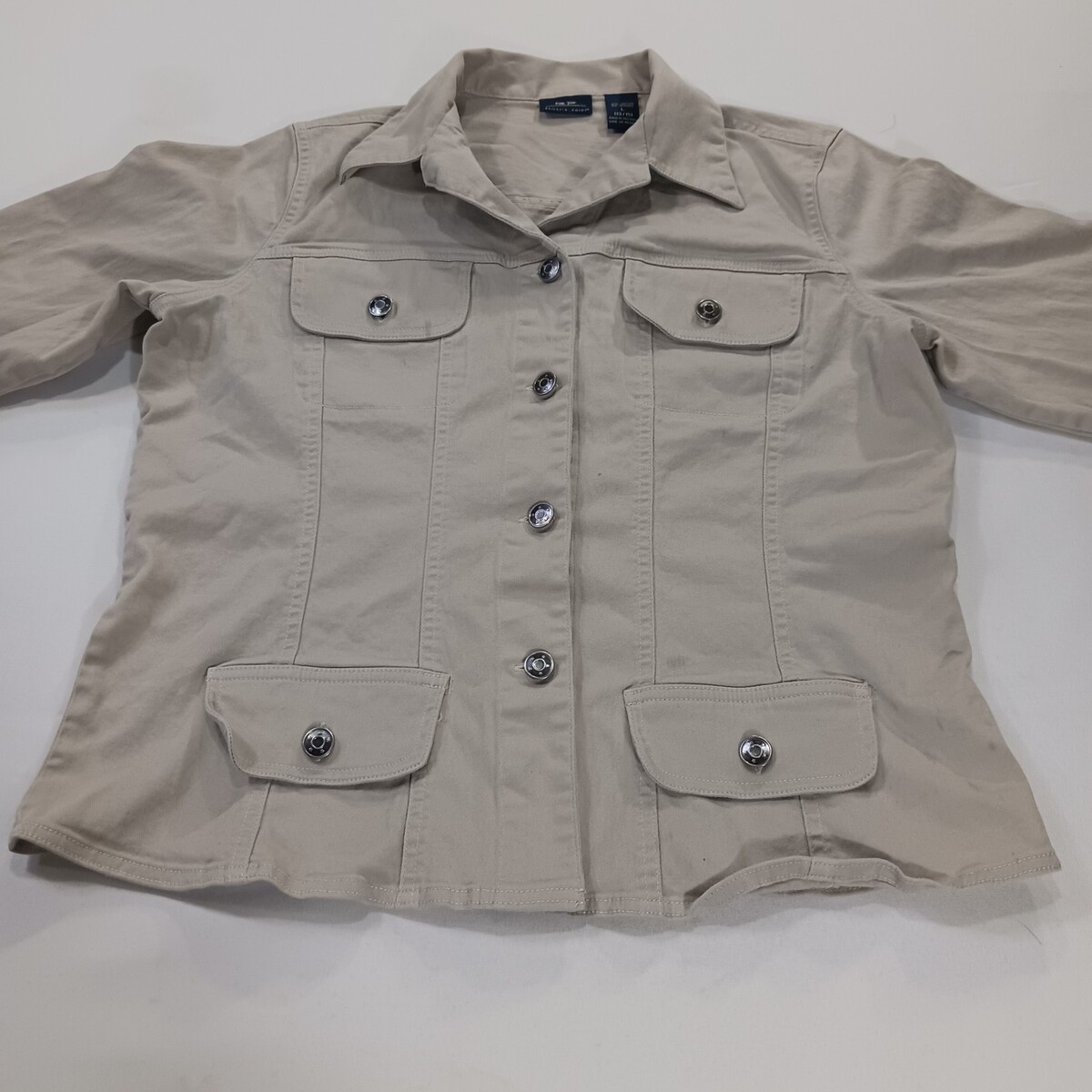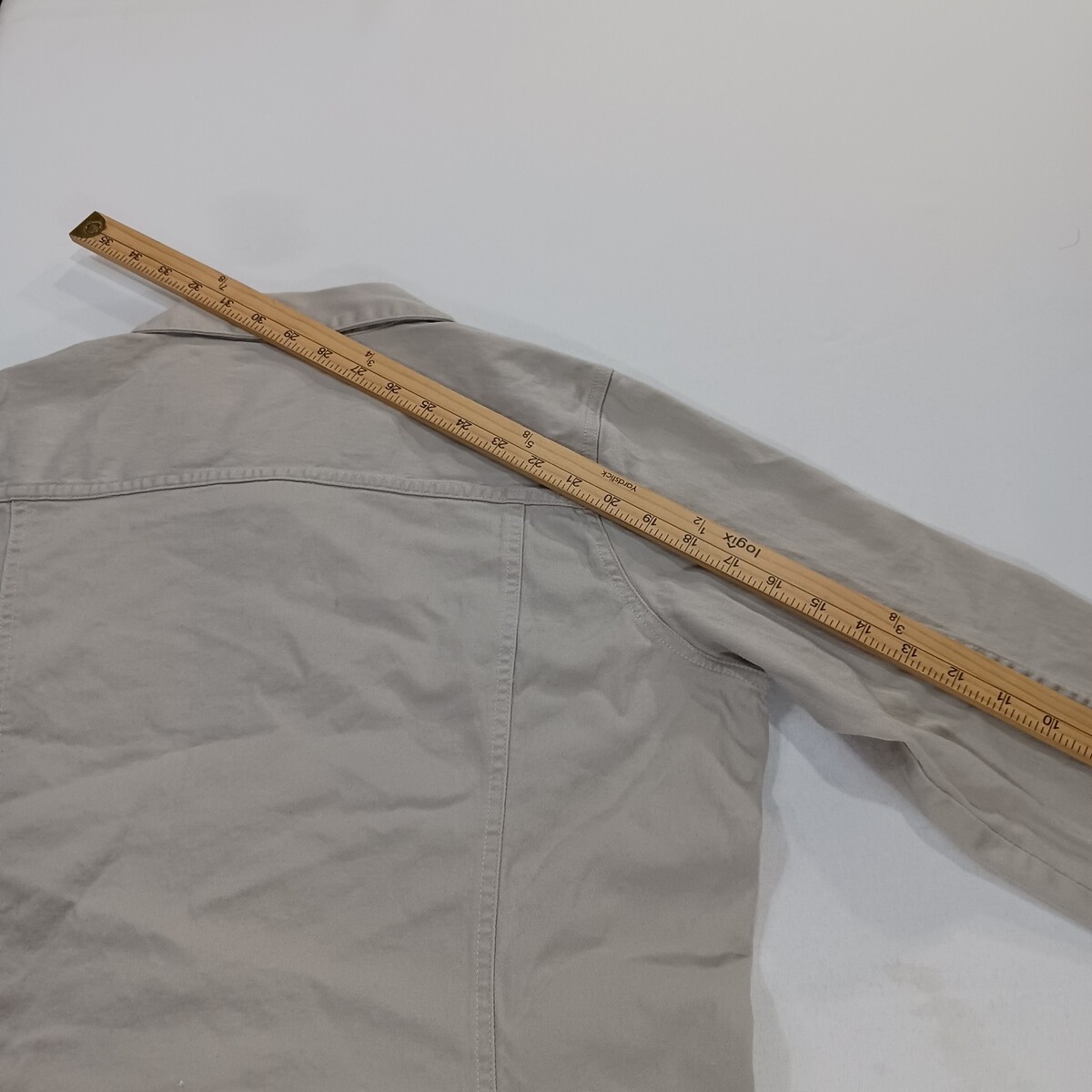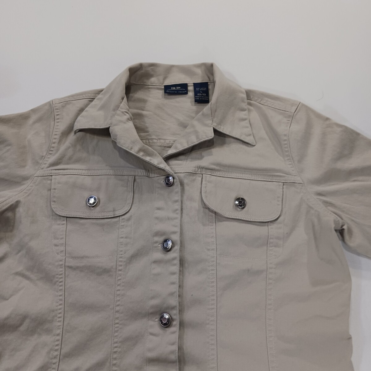 The product is a BP Bailey’s Point women’s tan/khaki cotton blend jacket in size L (13/15). It features a solid pattern, long sleeves, a button closure, and a basic jacket style. The jacket has a length of 24 inches and is made from a denim fabric type. This versatile and stylish jacket is perfect for regular wear, adding a touch of sophistication to any outfit.