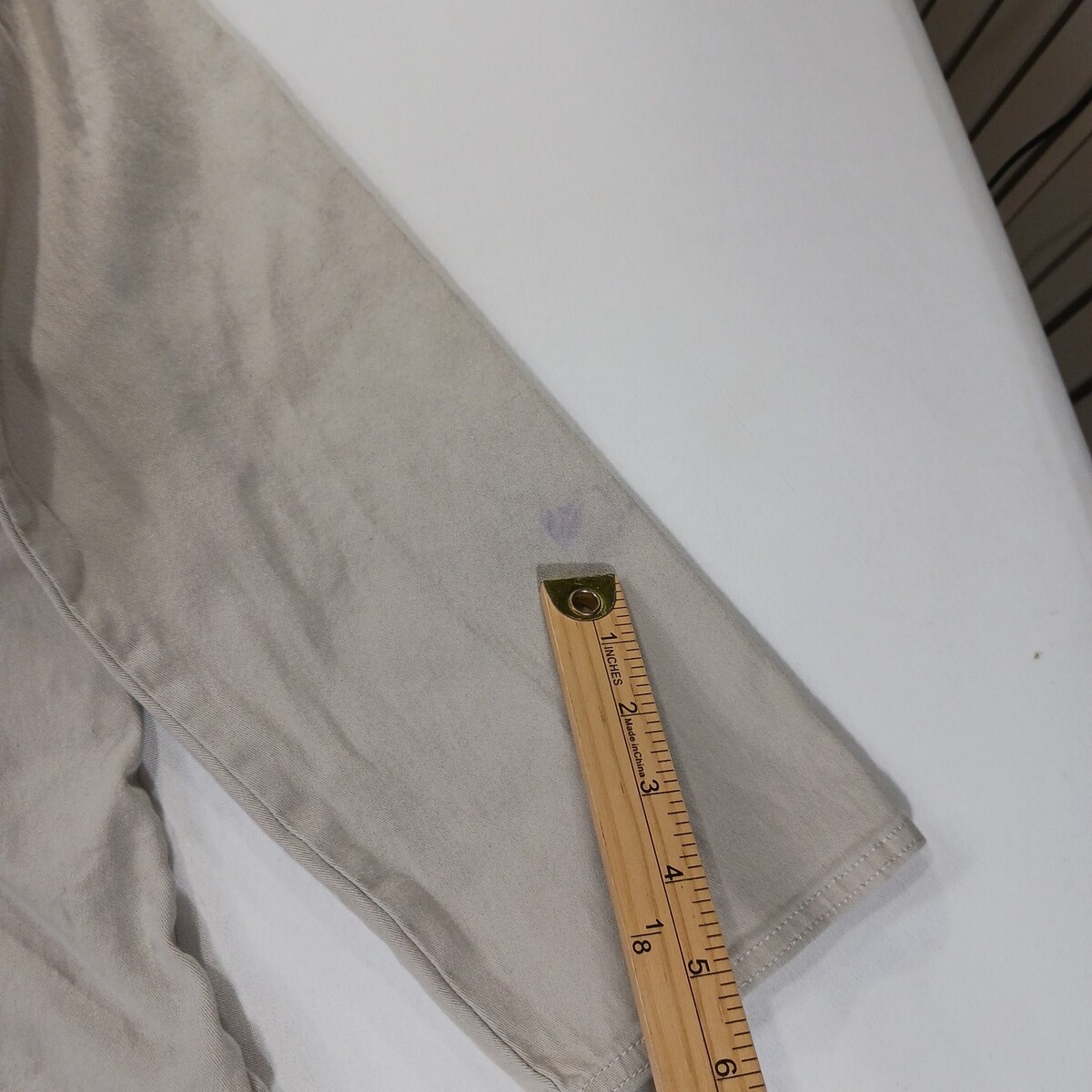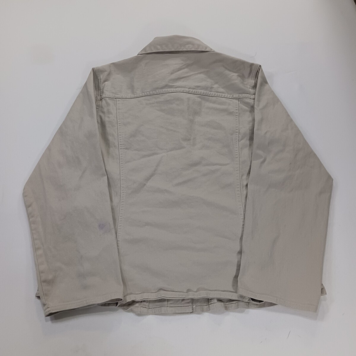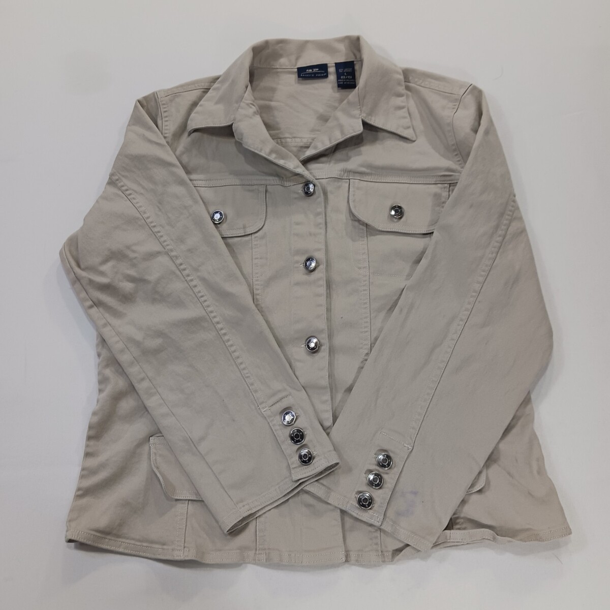 The product is a BP Bailey’s Point women’s tan/khaki cotton blend jacket in size L (13/15). It features a solid pattern, long sleeves, a button closure, and a basic jacket style. The jacket has a length of 24 inches and is made from a denim fabric type. This versatile and stylish jacket is perfect for regular wear, adding a touch of sophistication to any outfit.