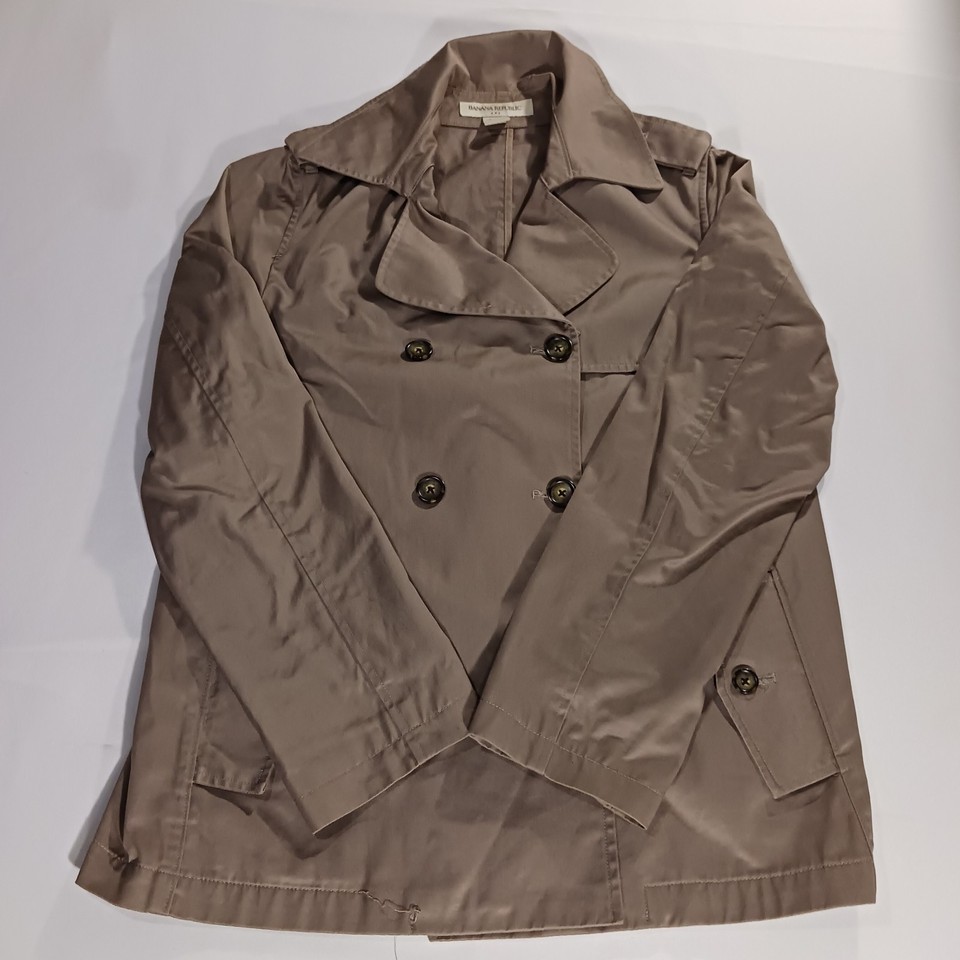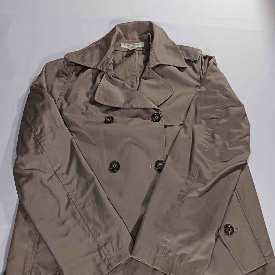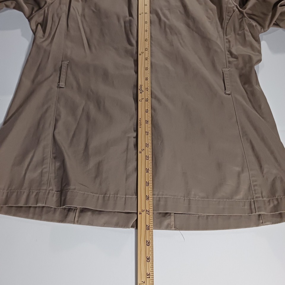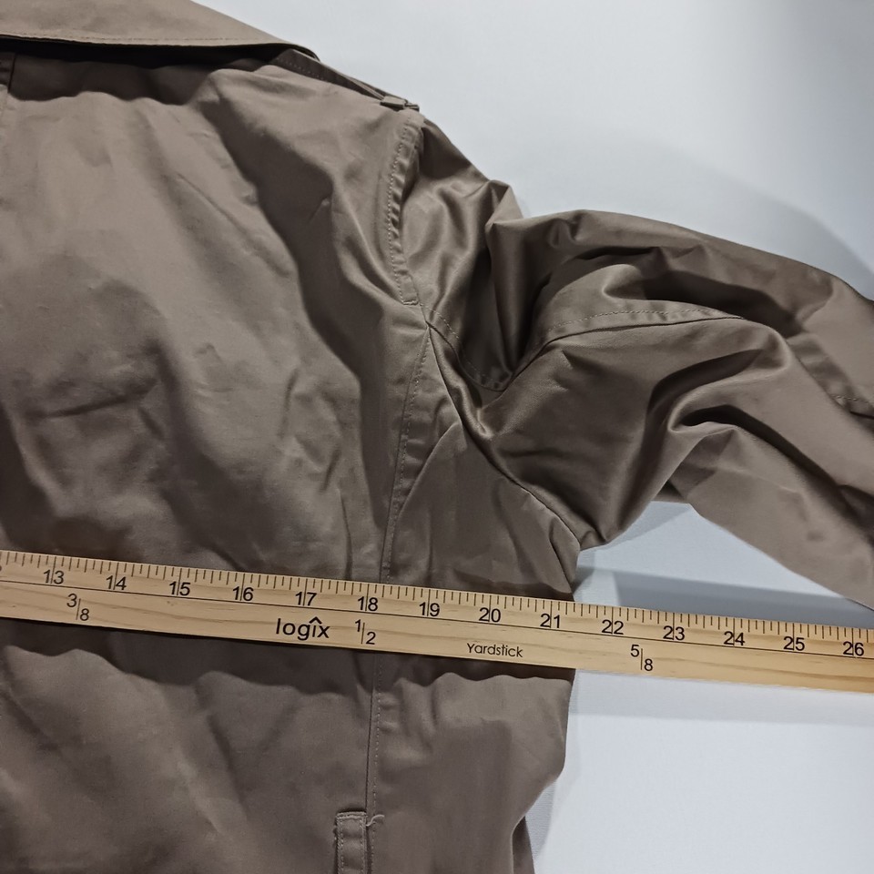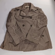 The Banana Republic RN#5402 Women's Beige/Khaki Cotton Button Jacket in size Large is a stylish and versatile mid-length jacket perfect for the fall and spring seasons. Made from cotton with a solid pattern, this jacket features a collared neckline, single-breasted closure, and pockets for added functionality. The military jacket style adds a touch of sophistication to any outfit, making it a must-have piece for any woman's wardrobe.