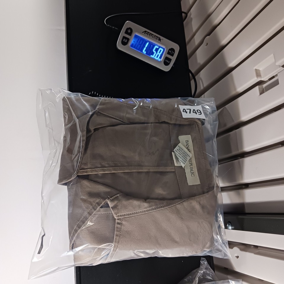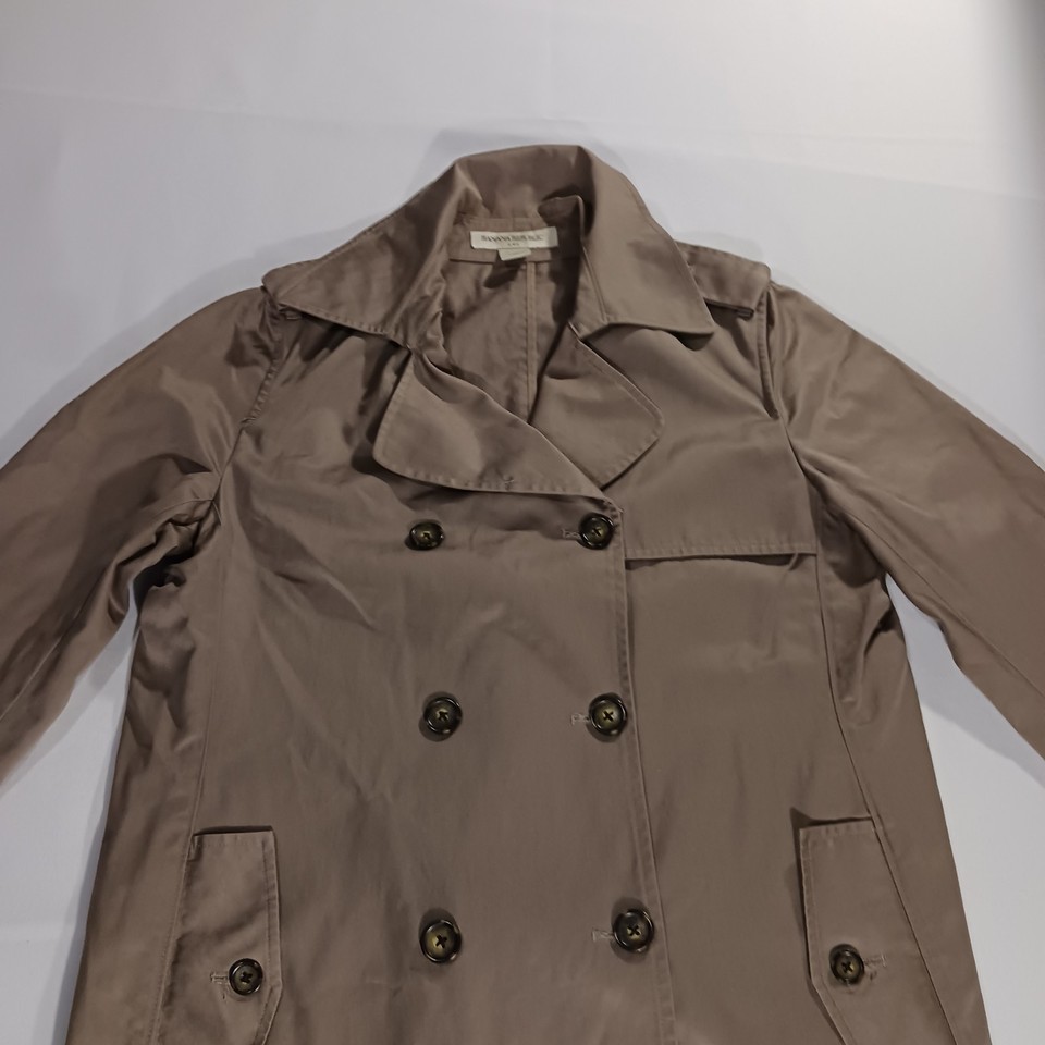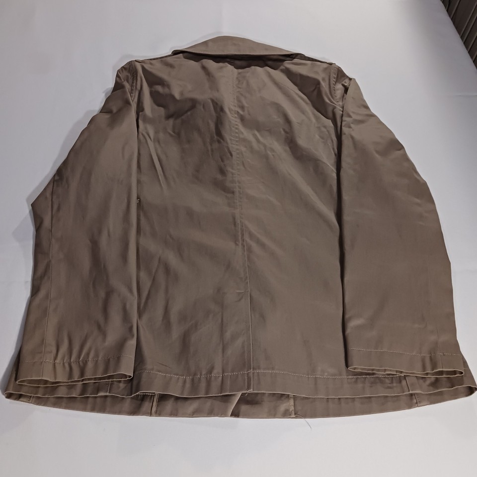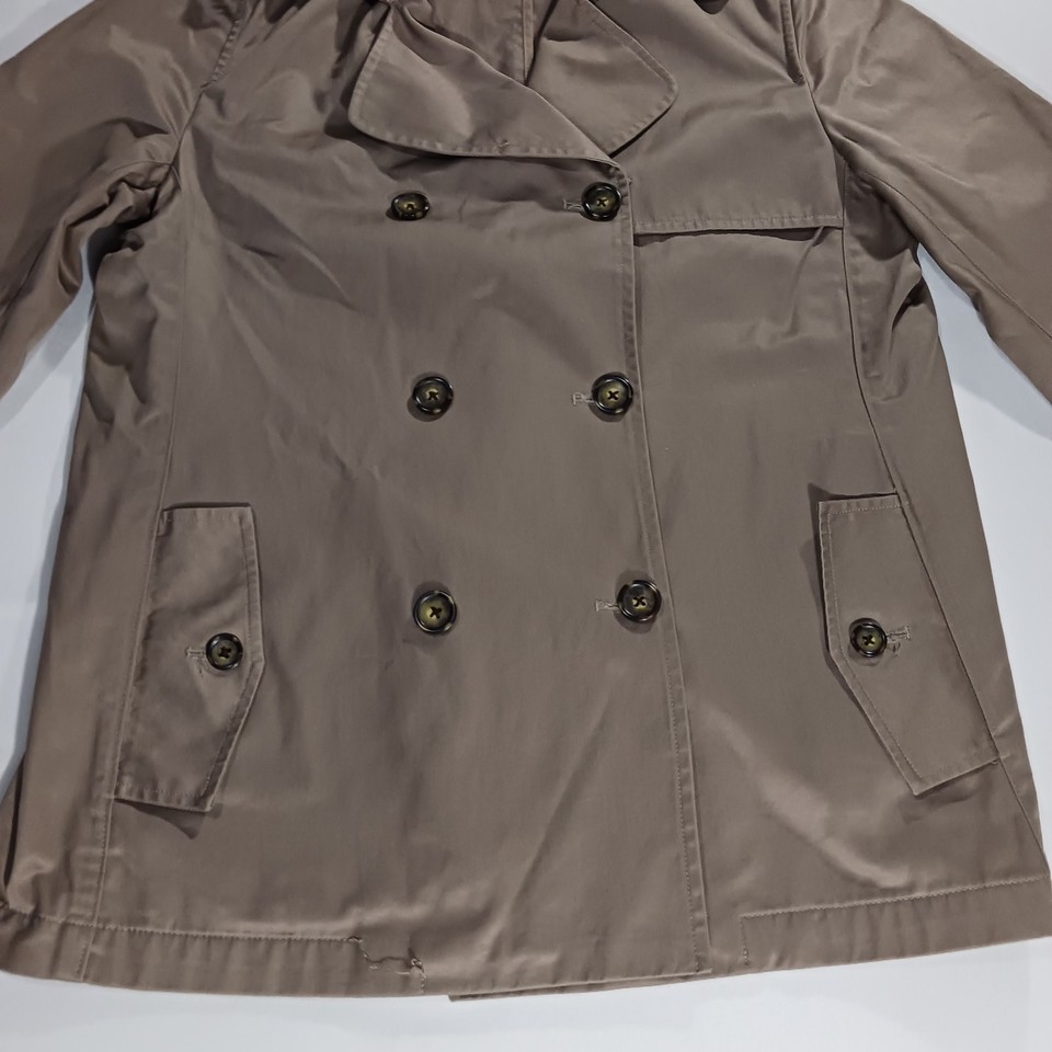 The Banana Republic RN#5402 Women's Beige/Khaki Cotton Button Jacket in size Large is a stylish and versatile mid-length jacket perfect for the fall and spring seasons. Made from cotton with a solid pattern, this jacket features a collared neckline, single-breasted closure, and pockets for added functionality. The military jacket style adds a touch of sophistication to any outfit, making it a must-have piece for any woman's wardrobe.