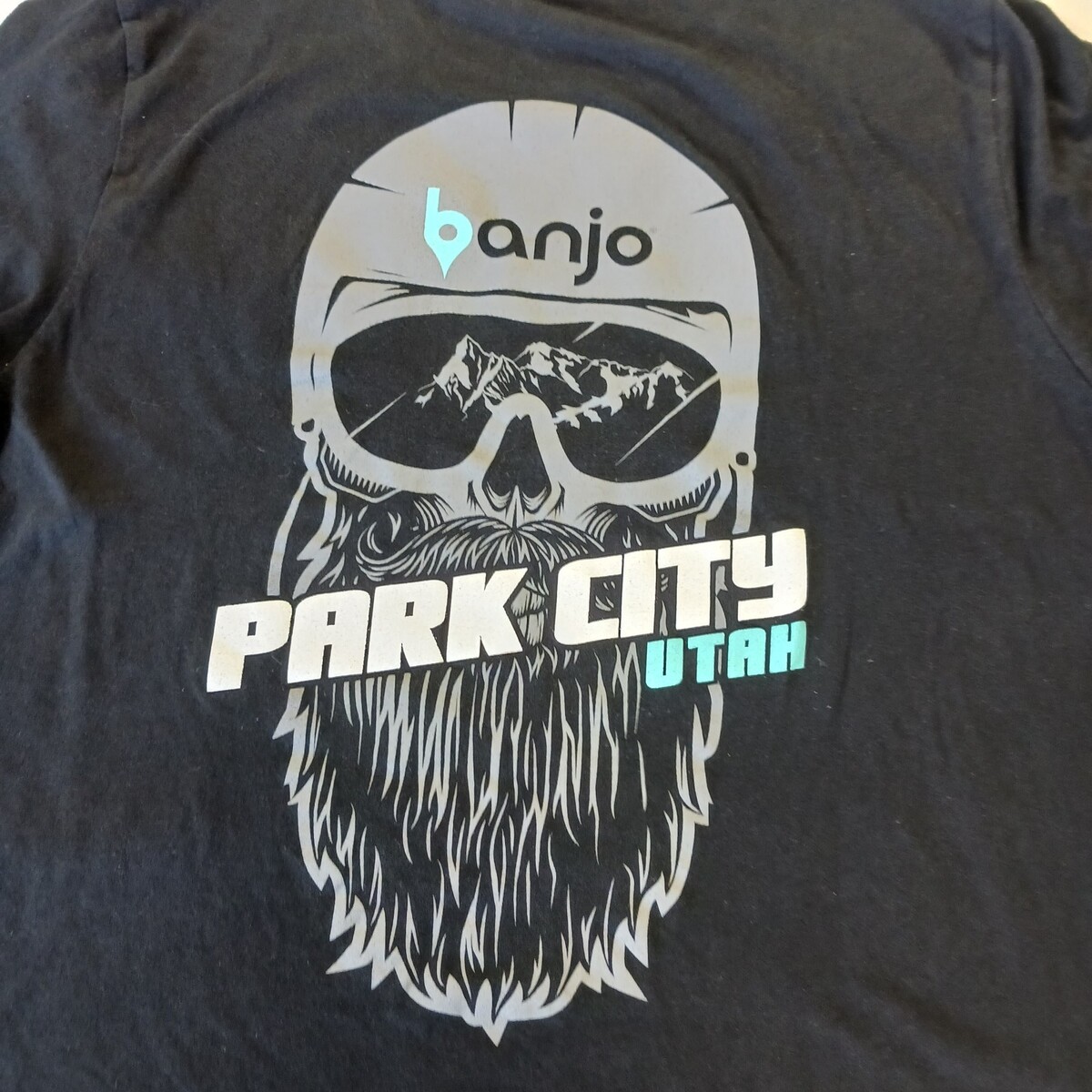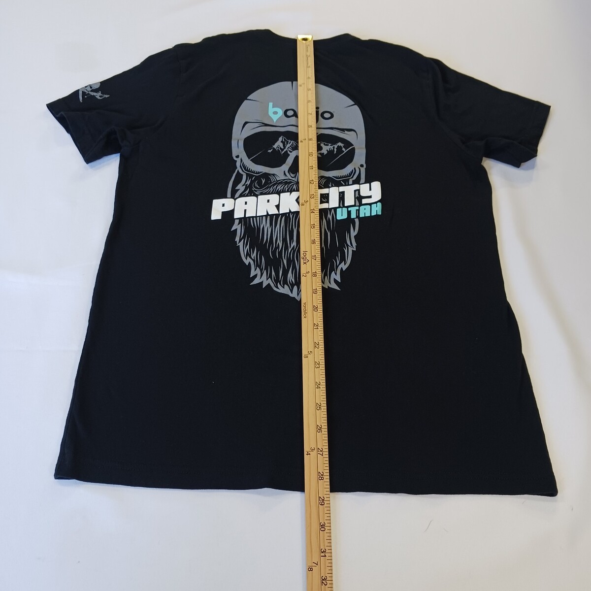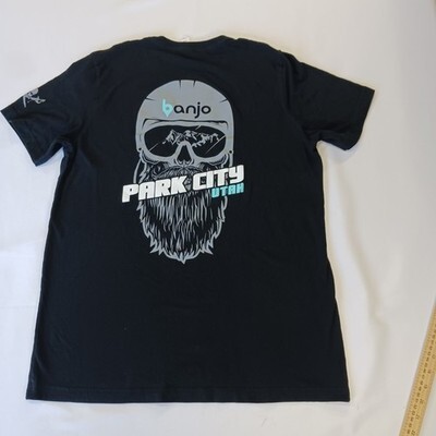 The product is a men's black cotton graphic t-shirt featuring a design that represents Banjo Park in City, Utah. The short sleeve shirt has a crew neck and is machine washable, making it easy to care for. With a classic fit and lightweight material, it is suitable for all seasons and can be worn in winter, summer, fall, or spring. The t-shirt is designed with a logo accent and a theme that ties to USA, outdoor activities, and city life. Made by the brand Canvas and sourced from Nicaragua, this t-shirt is perfect for those looking for a comfortable and stylish piece to add to their wardrobe.