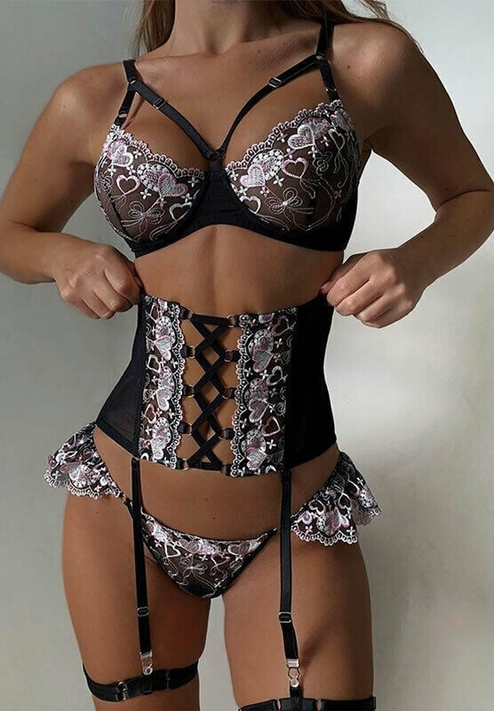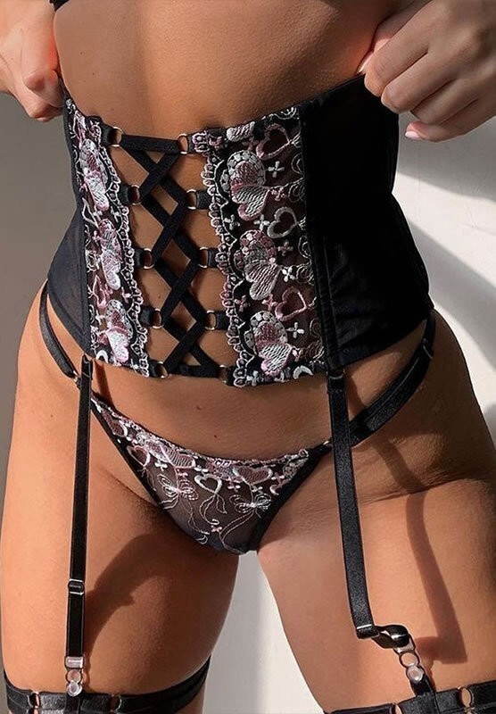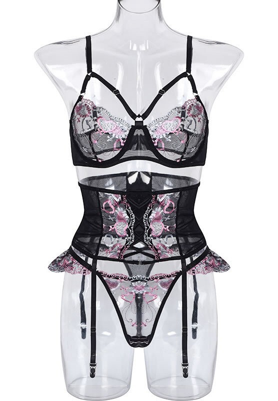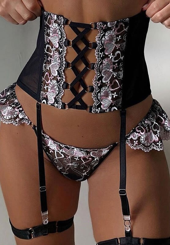 Regret nothing in this striking bra set featuring sheer embroidered lace underwire cups with strappy bust detail, adjustable spaghetti straps, a hook and eye back closure, a matching high waisted garter belt with criss-cross detailing, a hook and eye back closures, adjustable garter straps, and a matching lace panty.