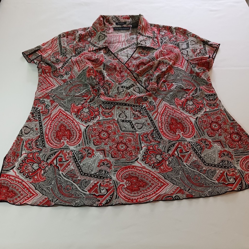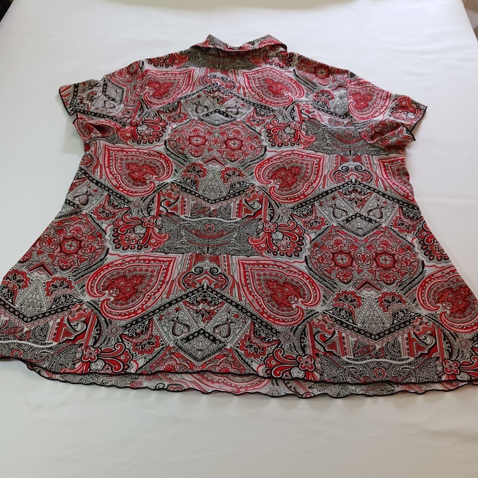 This Blue Diamond blouse top is a must-have addition to your wardrobe. The paisley pattern, split flutter sleeves, and V-neckline make it a stylish choice for any occasion, whether it be travel, casual wear, work, or business. The pullover closure and 1/4 inch trim around the neckline add a touch of elegance to this basic style blouse.