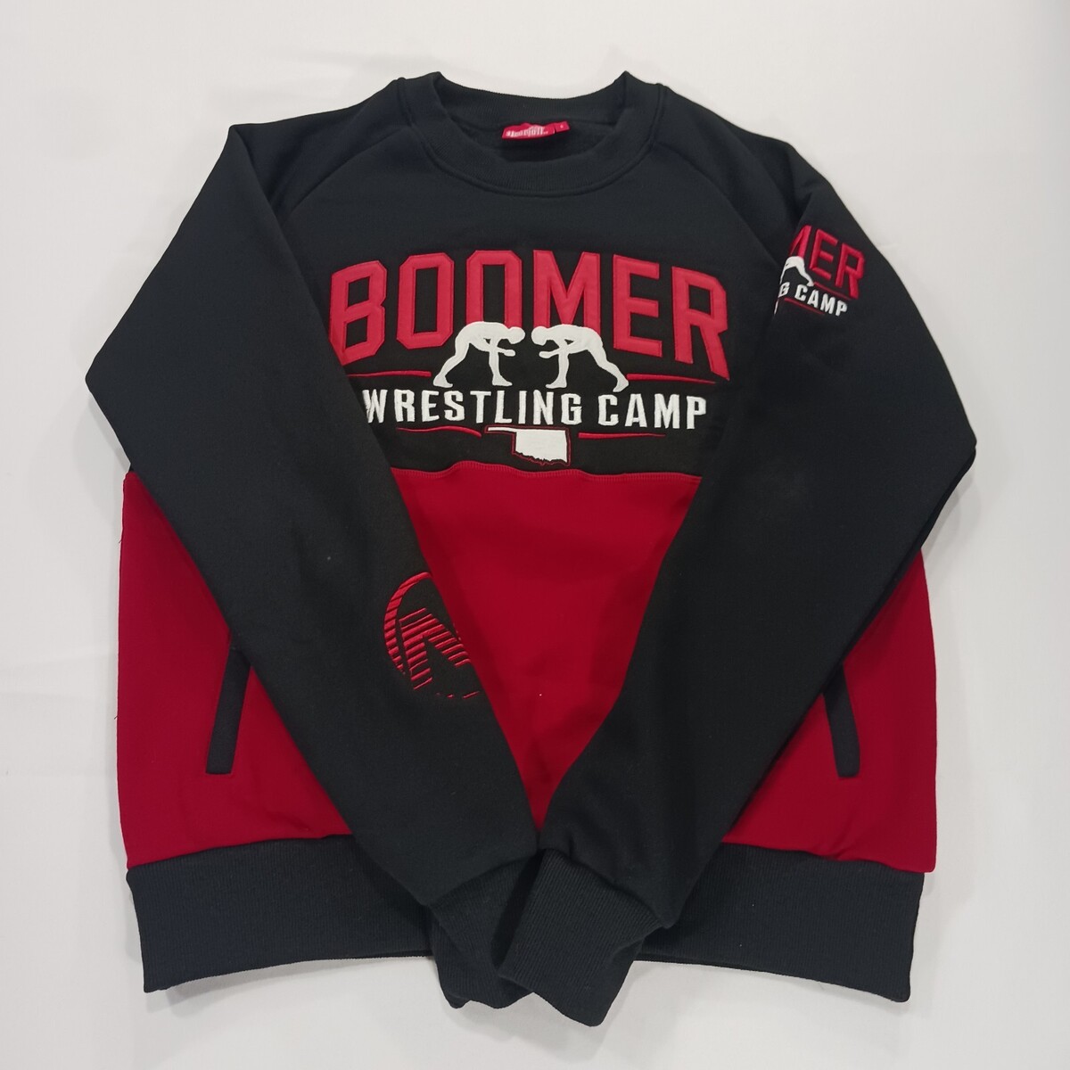 The Boomer Wrestling Camp Men's Black & Red Cotton Blend Pullover Sweatshirt in size Small is a stylish and comfortable piece of activewear perfect for wrestling enthusiasts. Made from a blend of polyester and cotton, this sweatshirt features a graphic print design specific to the Ncarfall brand. With long sleeves and a pullover style, it is easy to put on and ideal for staying warm during wrestling activities. The black color with red accents adds a sporty touch to the overall look, making it a must-have for any wrestling camp or training session.