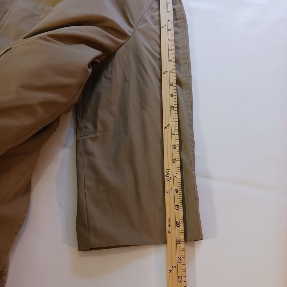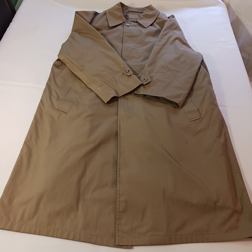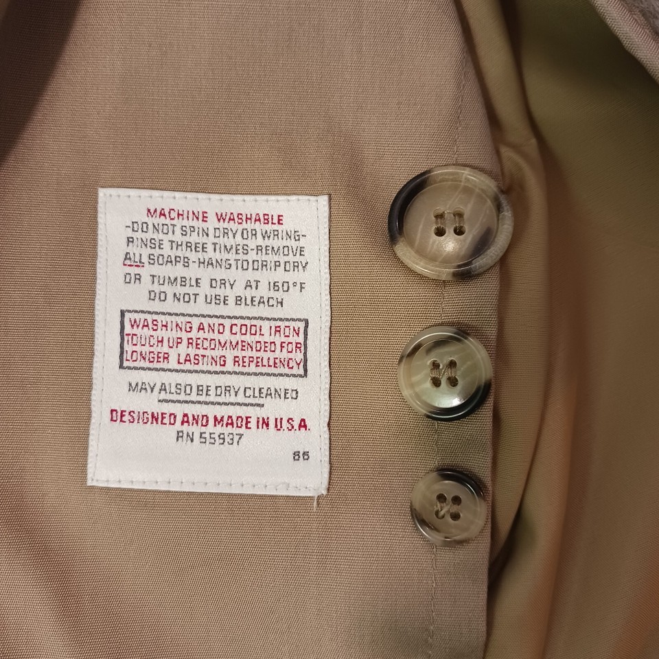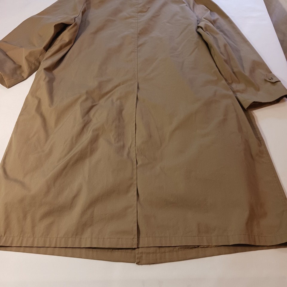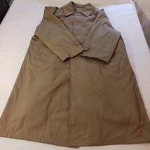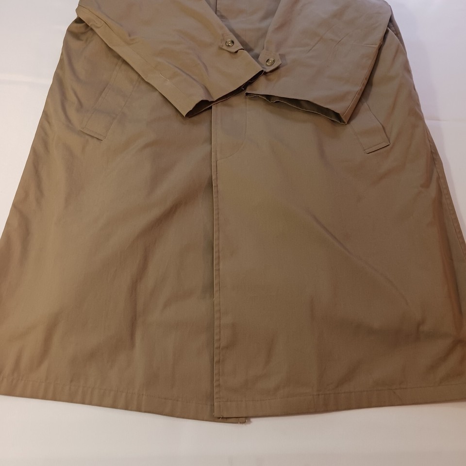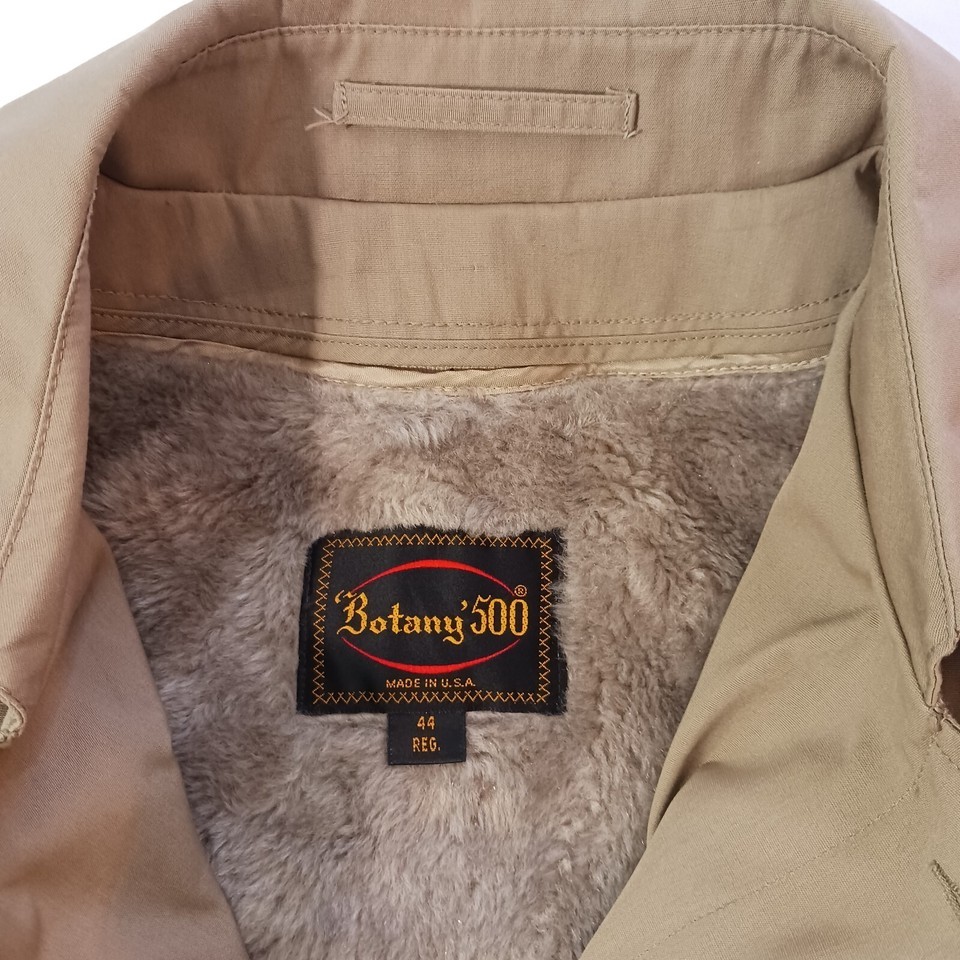 This vintage Botany 500 Trench Coat is a must-have for any stylish man's wardrobe. The coat features a khaki beige color, a long jacket/coat length, and a button closure. The outer shell material is made of polyester, and the coat was made in the United States.