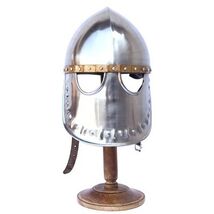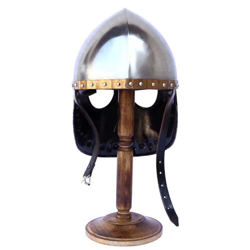 • Brass Trim Italo-Norman Medieval Helmet W/ Leather Liner & Wooden Display Stand image 1