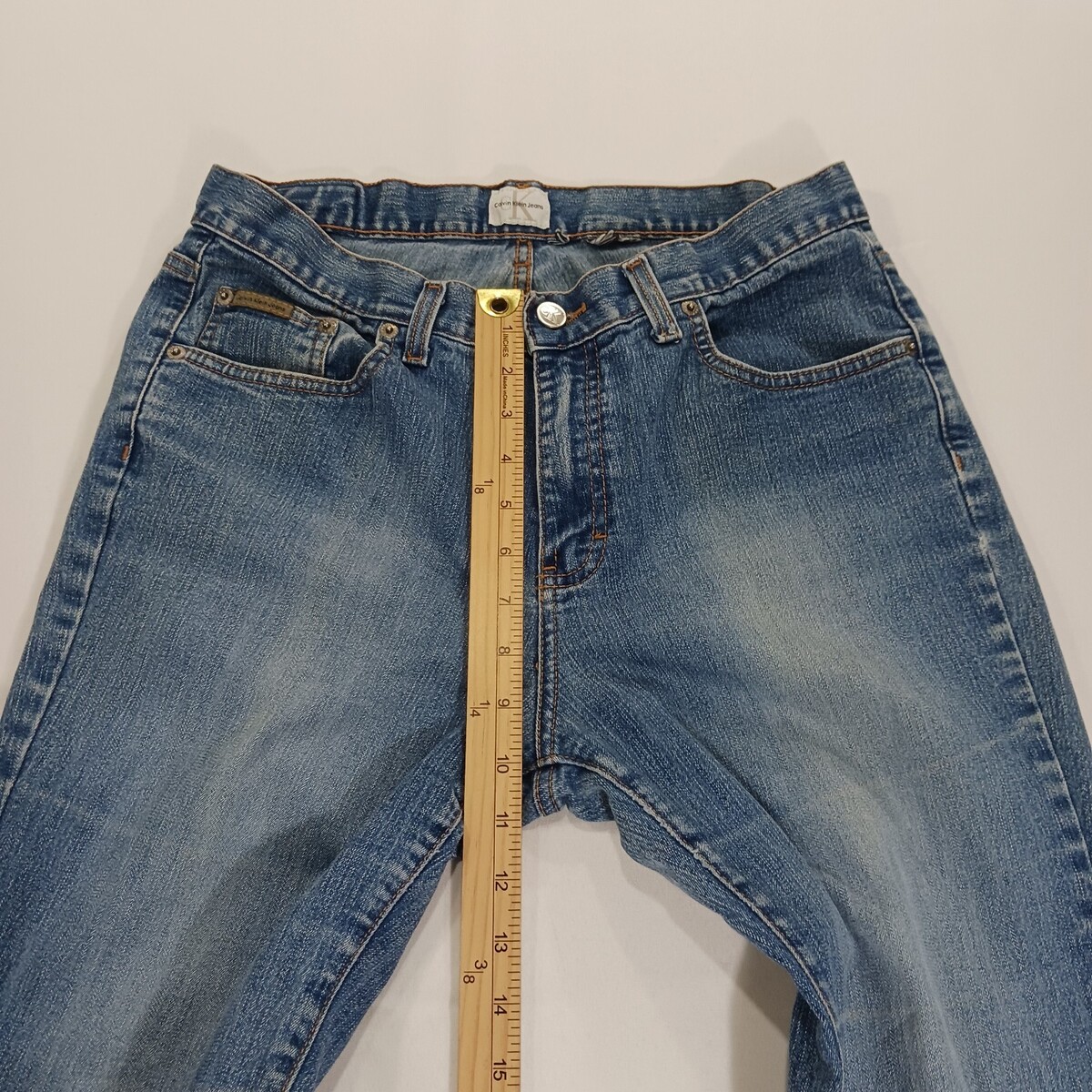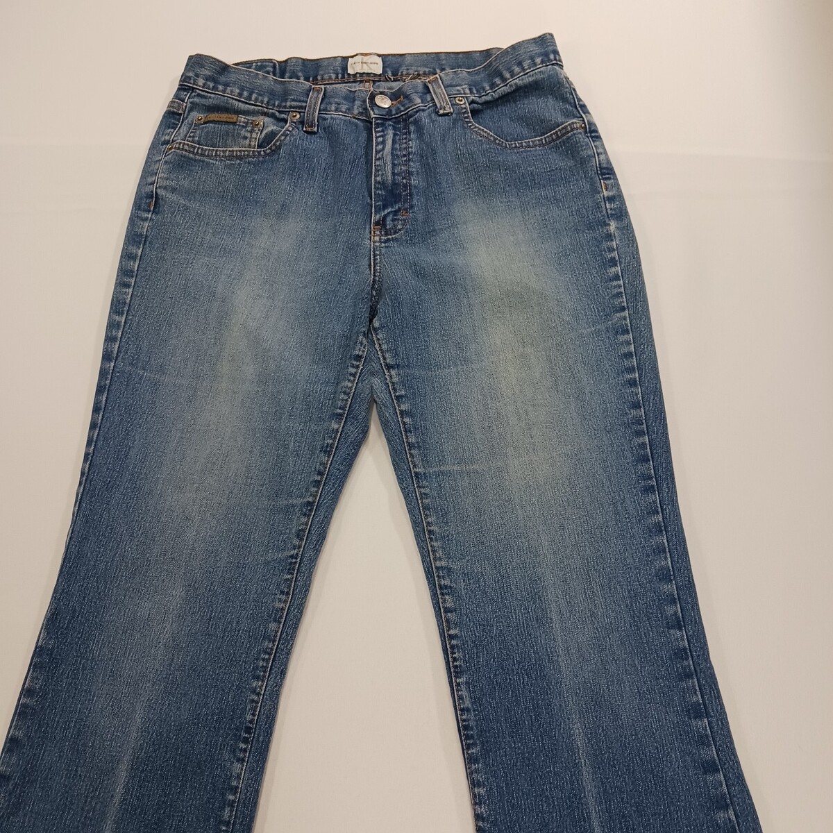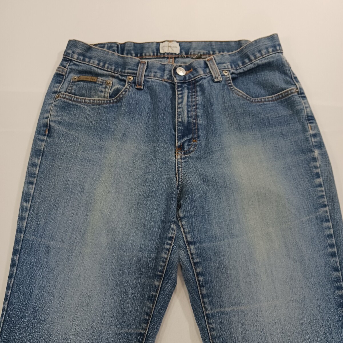 These Calvin Klein women's blue denim bootcut mid-rise jeans in size 30x31 are a stylish and versatile addition to any wardrobe. Made from a comfortable cotton-spandex blend, these jeans feature an embroidered accent, a 5-pocket design, and a regular fit. With a mid-rise waist and a bootcut style, these jeans are perfect for all seasons and can be easily machine washed for care. The Calvin Klein brand adds a touch of designer flair to these classic American-themed jeans, making them a fashionable choice for any woman's closet.