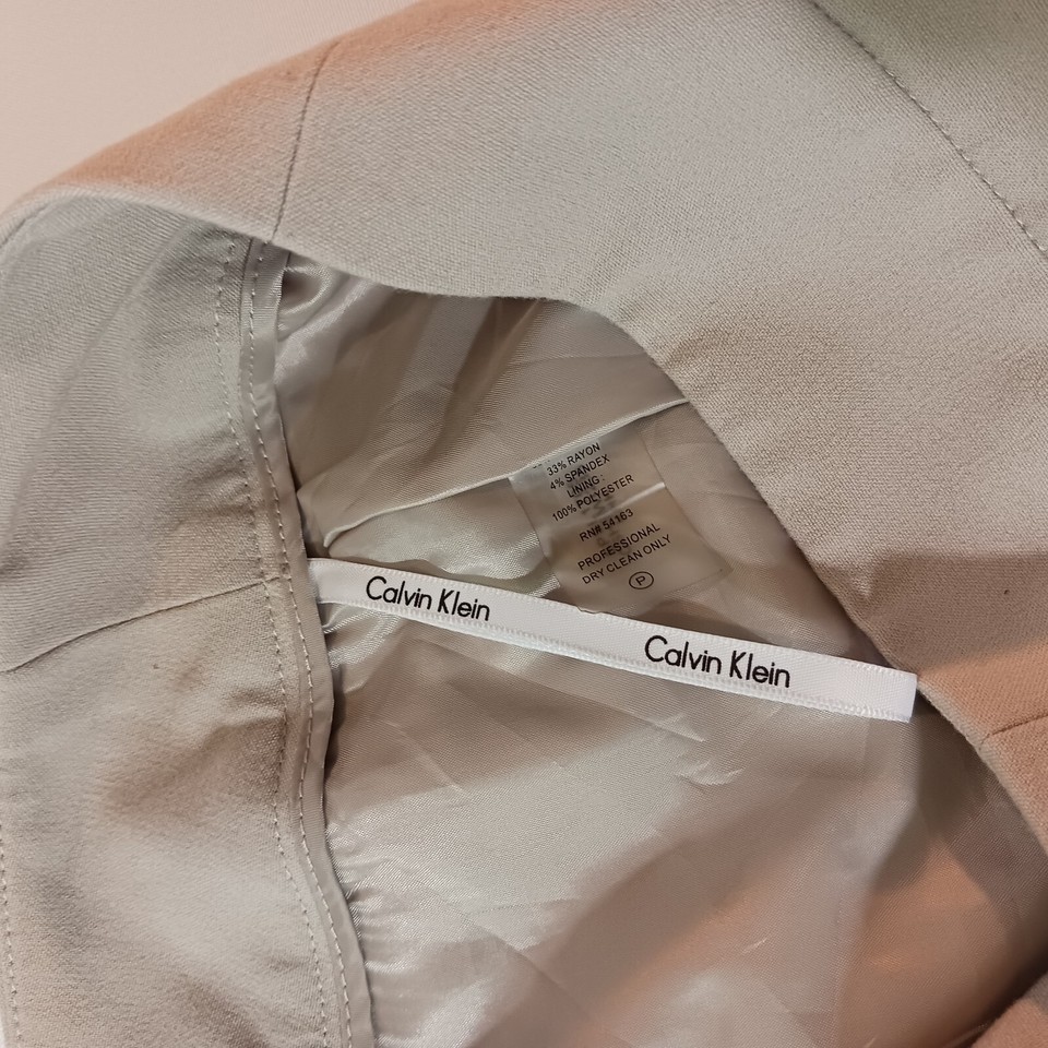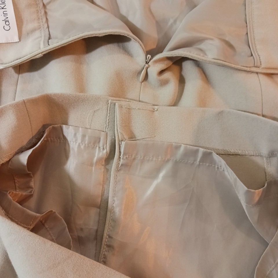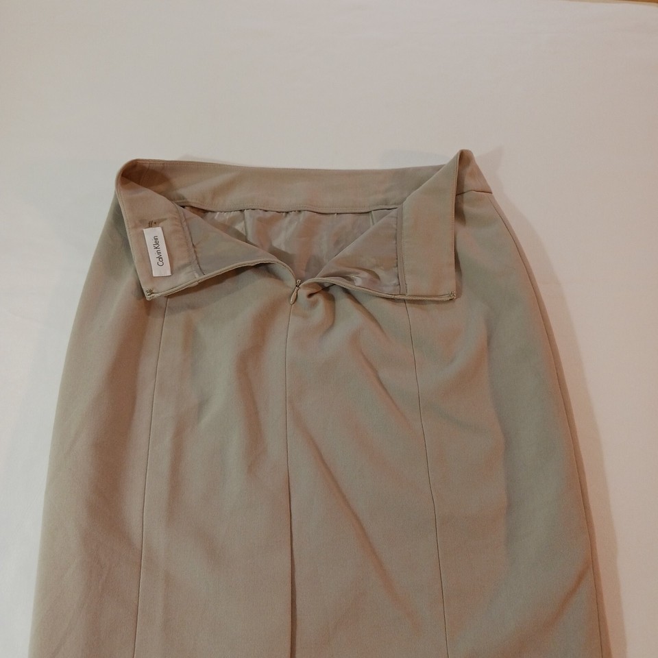 This Calvin Klein women's skirt in tan/beige is a stylish addition to your wardrobe. It features a back zipper closure and an A-line style that flatters your figure. The skirt is made of a blend of polyester, spandex, and rayon, which provides a comfortable and stretchy fit.
