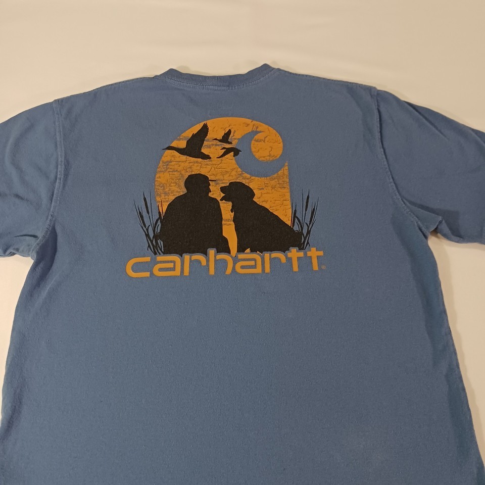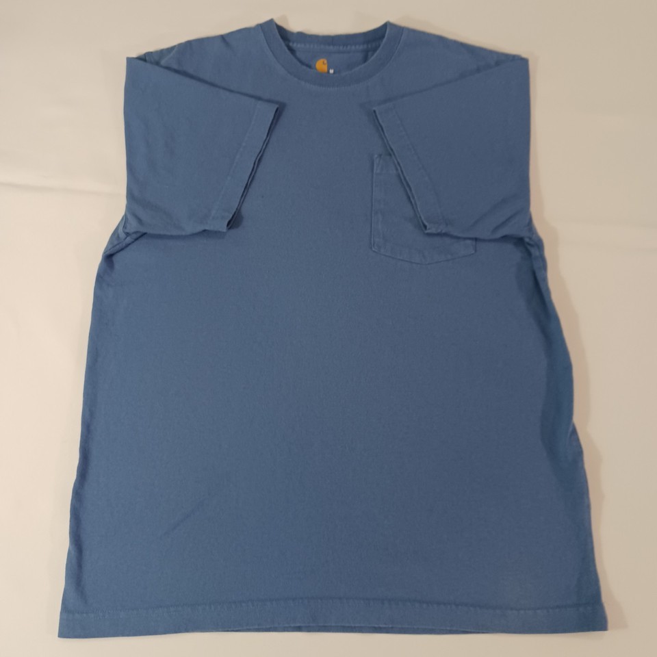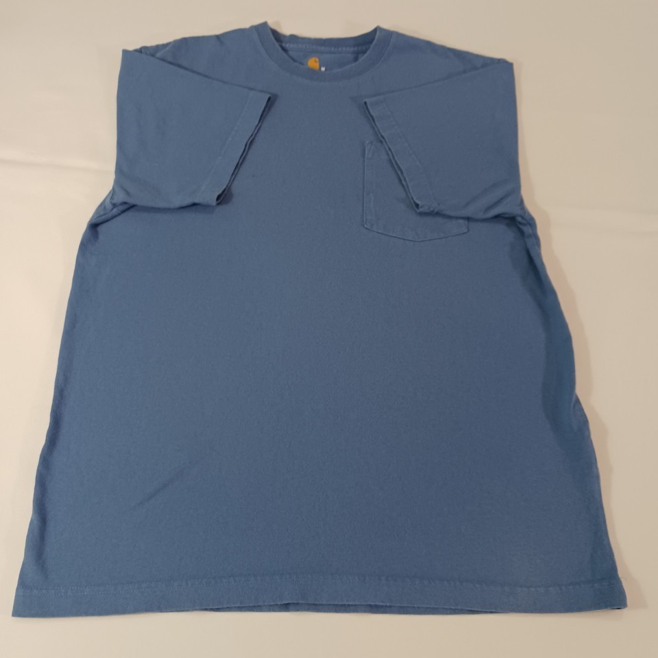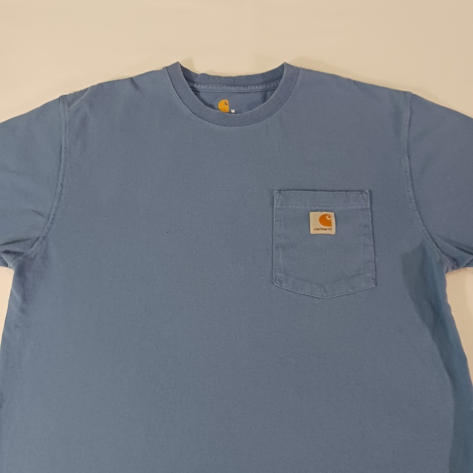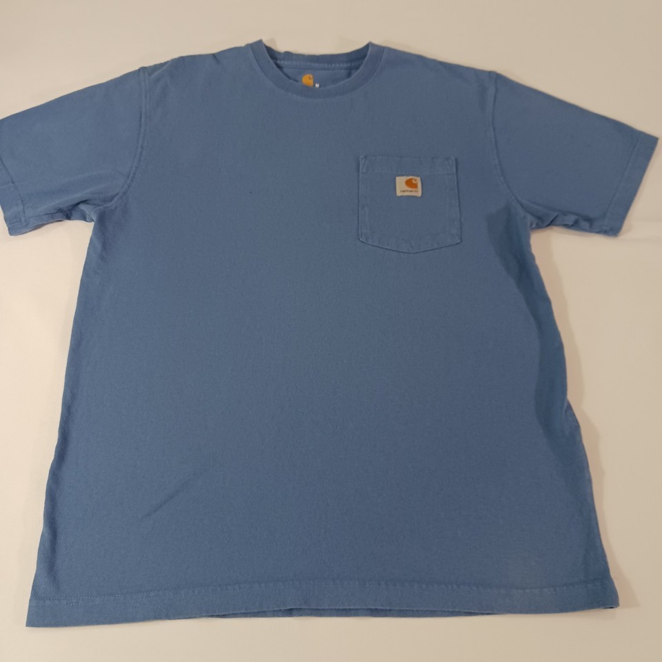 This is a classic Carhartt K87 Men's T-shirt in size M, featuring a crew neck and short sleeves. Made of solid blue cotton material, it has a regular fit with a pocket on the front. Manufactured between 2010-2019 in Guatemala, this T-shirt is part of the Carhartt Men's K87 product line, known for its quality and durability. Perfect for everyday wear, this shirt offers a comfortable and timeless style for men looking for a reliable wardrobe staple.