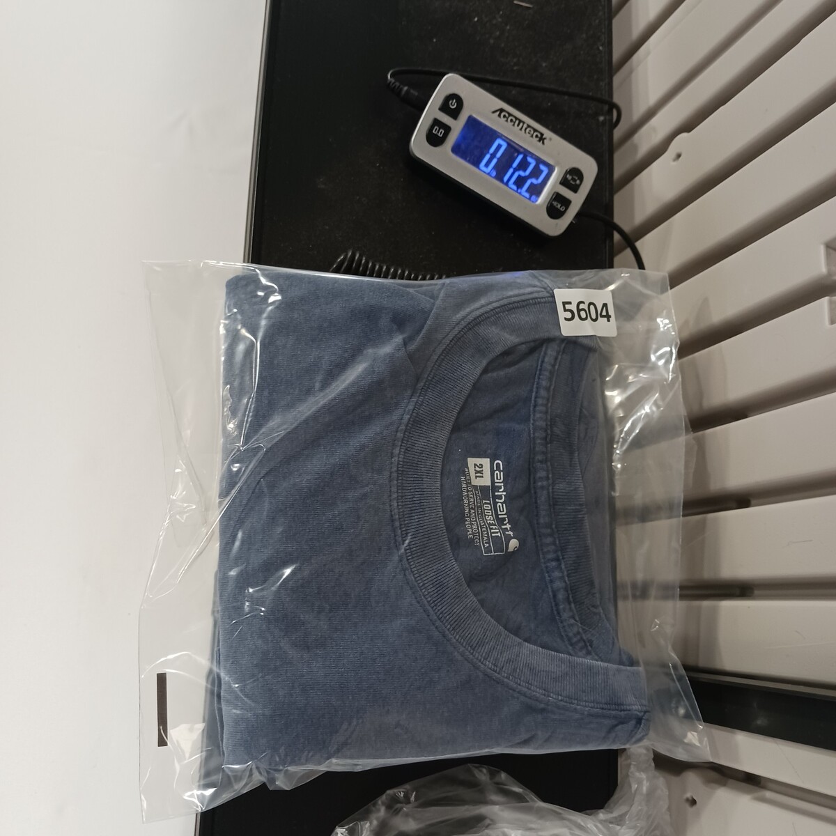 The Carhartt K87 Loose Men's Blue Cotton Blend Short Sleeve Distressed T-Shirt in 2XL is a solid blue shirt with a crew neck and short sleeves, made from a blend of polyester and cotton. It features a distressed look with a logo accent, giving it a vintage feel. This classic American-themed shirt is perfect for dads who enjoy outdoor activities, as it is breathable, easy to care for, and comes with pockets for added functionality. Made by Carhartt, a trusted brand known for quality clothing for men who work hard and play hard.