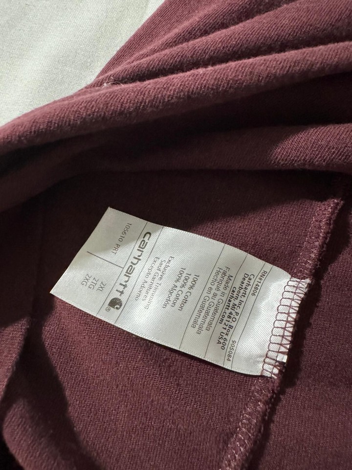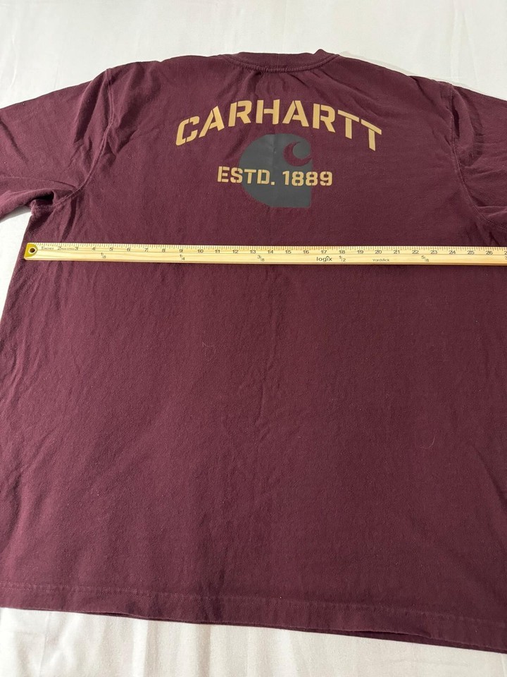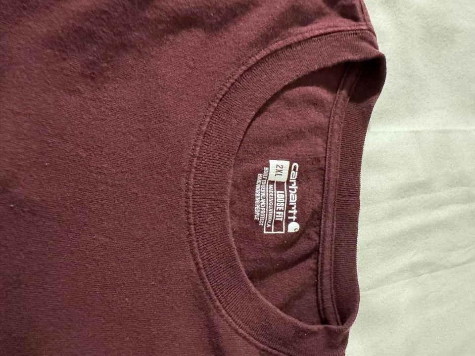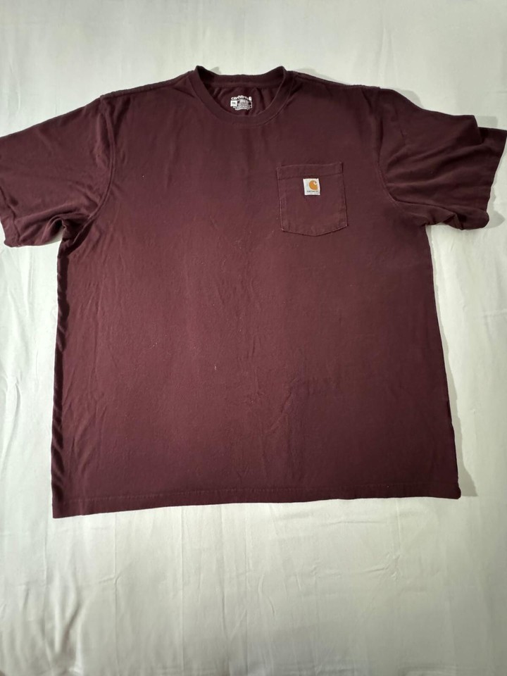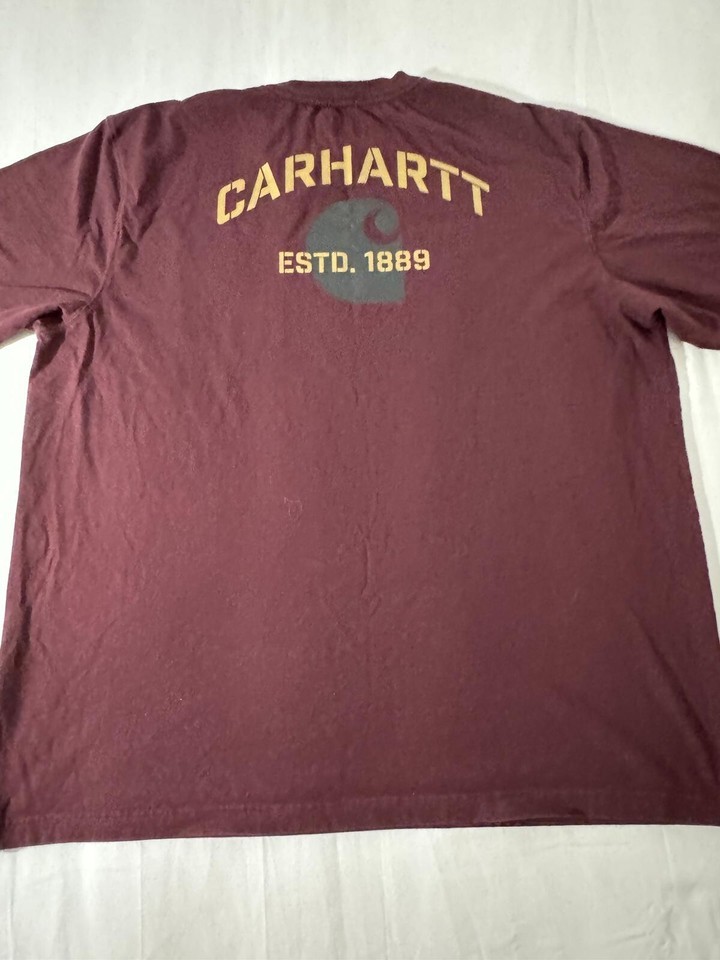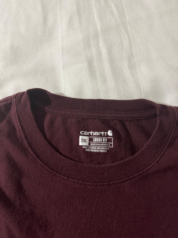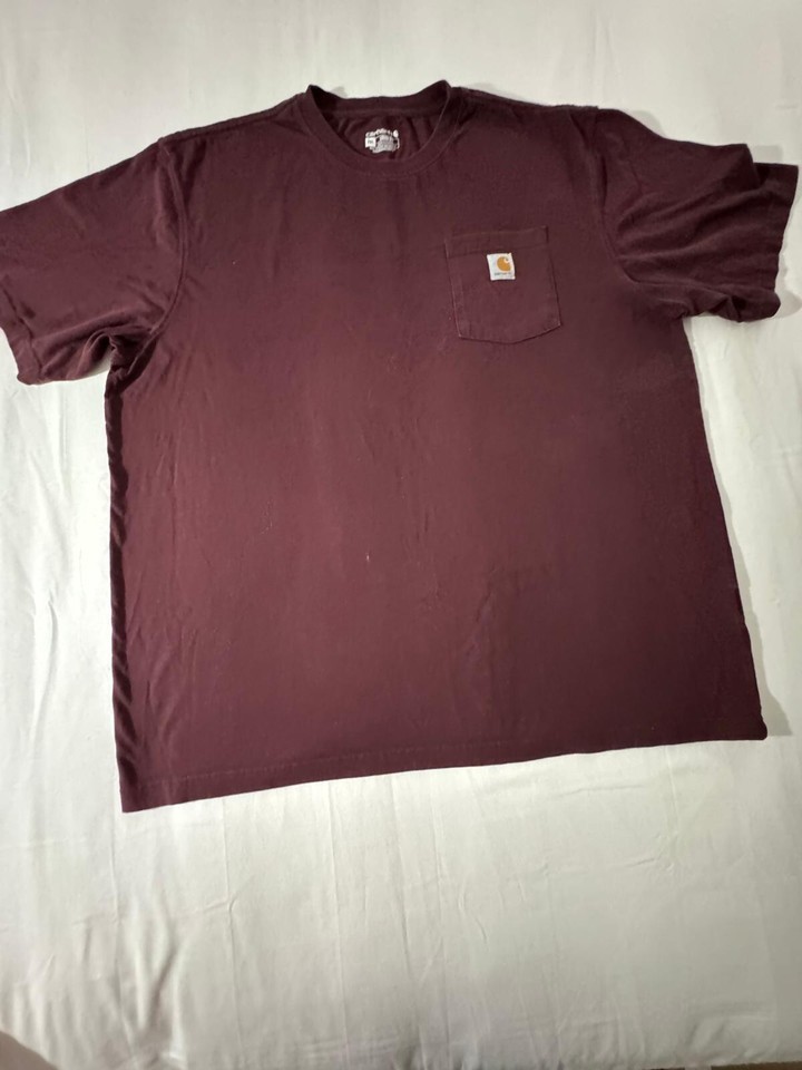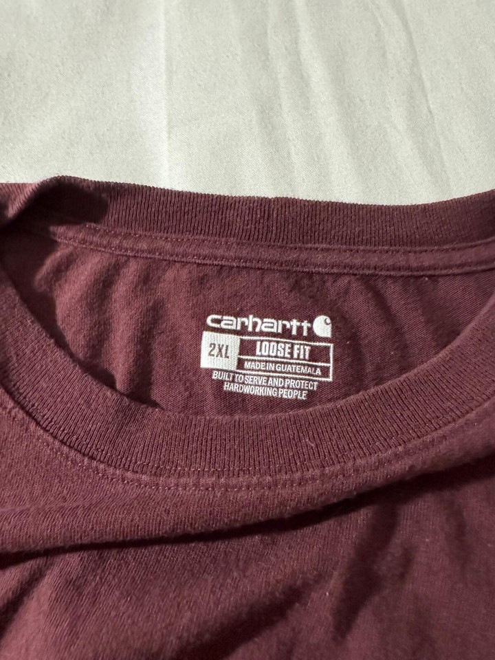 This Carhartt men's T-shirt in size 2XL features a solid burgundy color and short sleeves, made from comfortable cotton material. The relaxed fit provides a classic and outdoor-themed look, perfect for everyday wear. With a practical pocket detail and machine washable care instructions, this T-shirt is ideal for all seasons and is a great addition to any casual wardrobe.