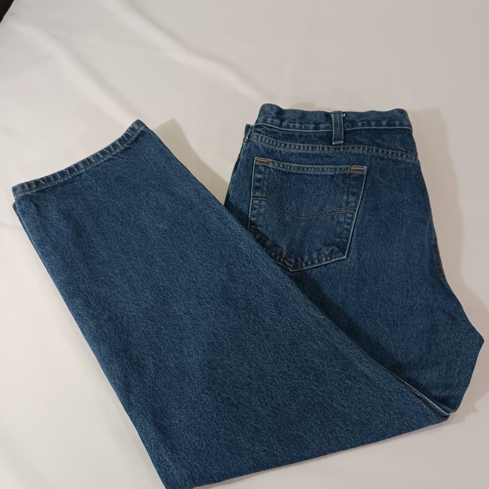 These Carhartt Men's Blue Denim Workwear Jeans are crafted from cotton denim in a solid pattern, featuring a relaxed fit and a straight style. The jeans have a zip closure and a 5-pocket design with button and zipper accents, perfect for everyday wear. The waist size is 42 inches and the inseam measures 29 inches, making them a comfortable and practical choice for any season. The jeans also bear the Carhartt logo, adding a touch of authenticity to their rugged workwear look.
