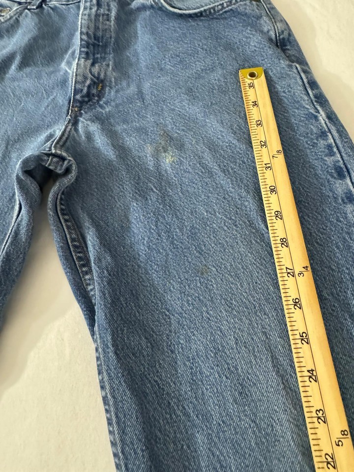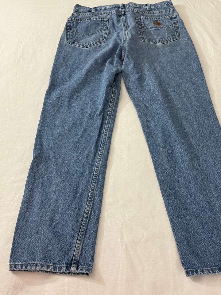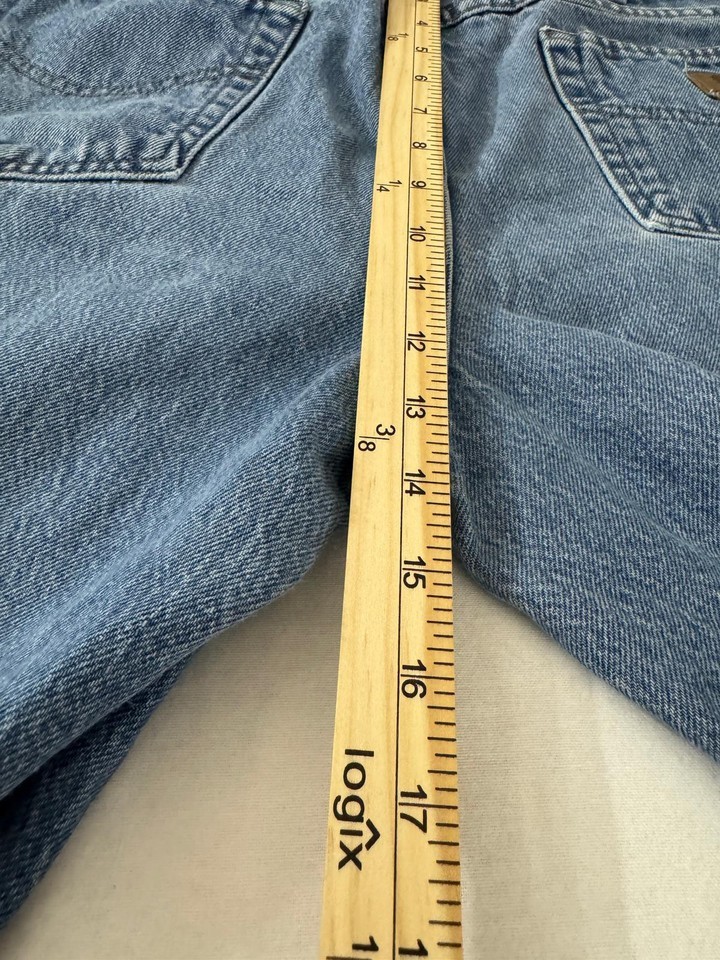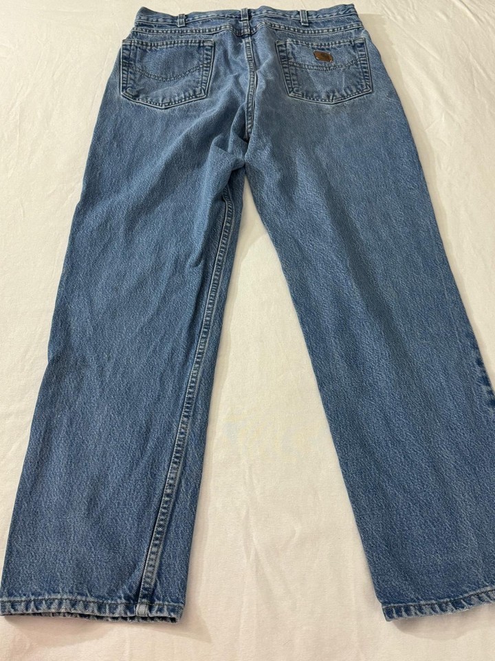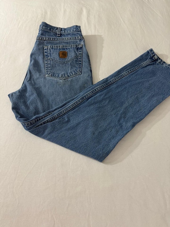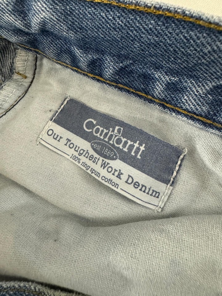The Carhartt Men's Blue Toughest Work Denim Jeans are crafted from 100% cotton denim in a dark wash. These Straight-fit jeans feature a measured waist size of 32 inches and inseam of 30.5 inches, with a relaxed fit for comfortable wear. The jeans have a button closure, logo accents, and are designed for durability and functionality, making them ideal for tough work environments.