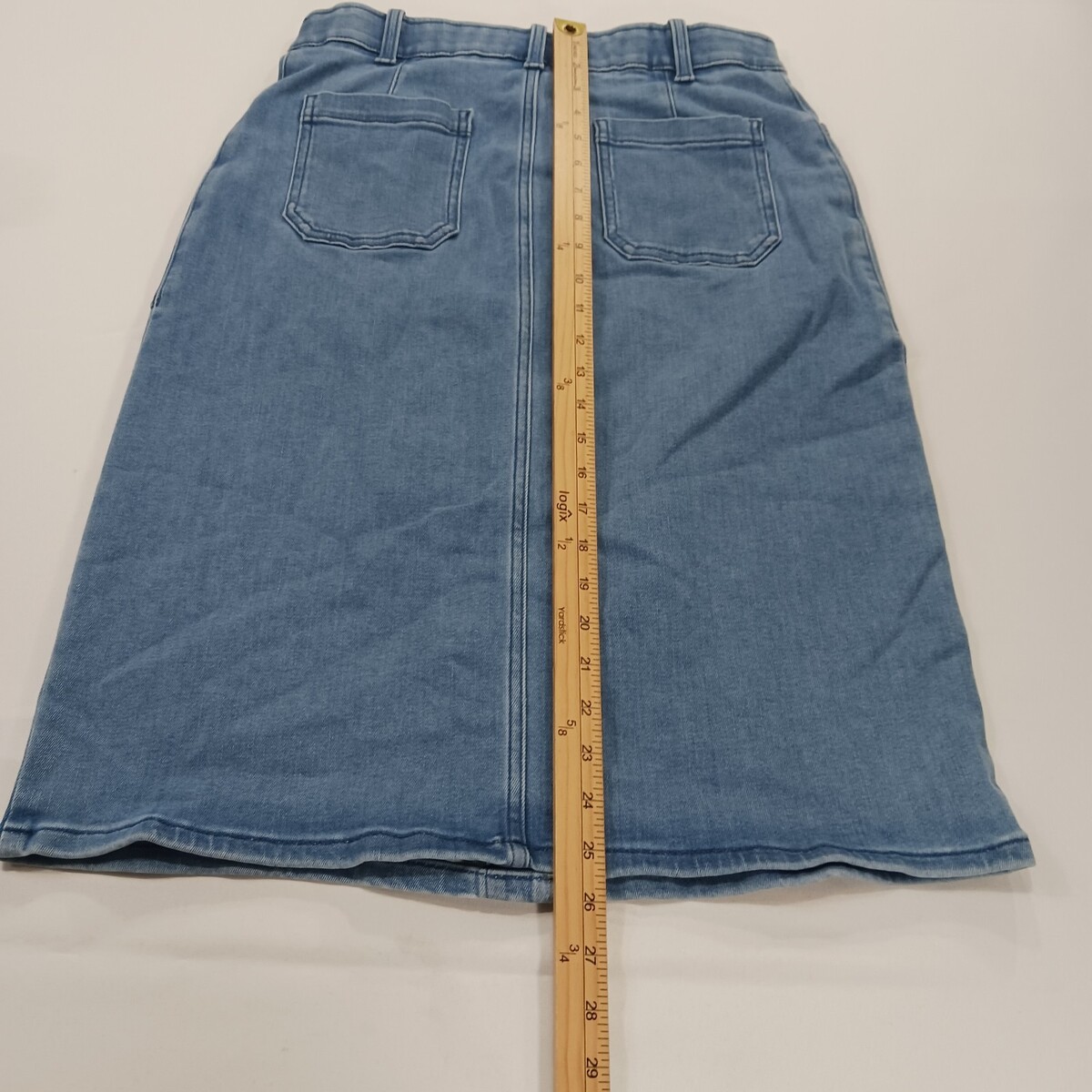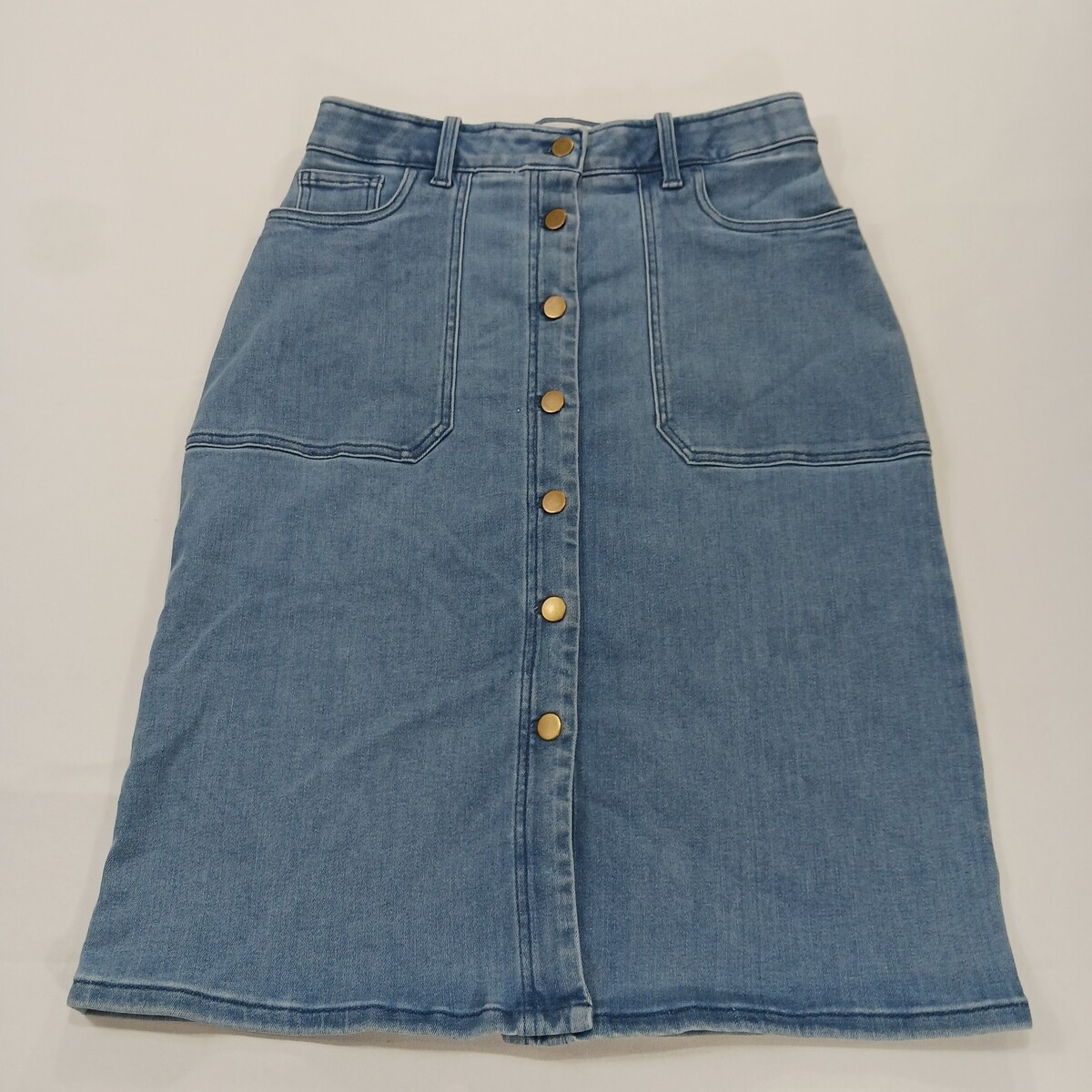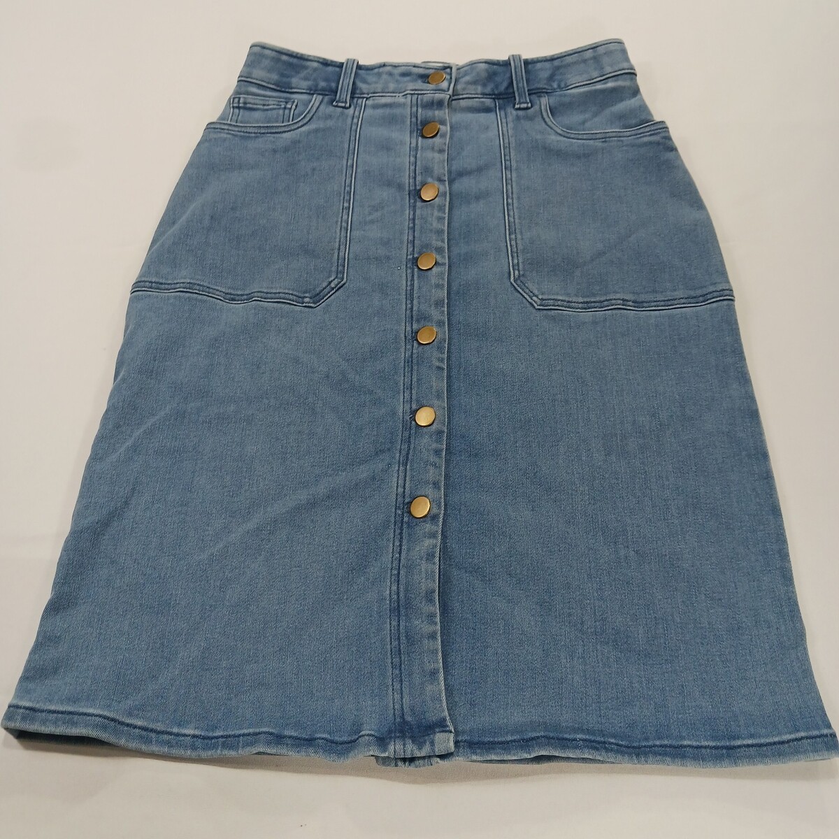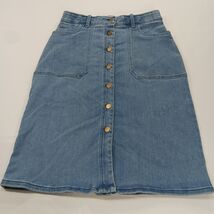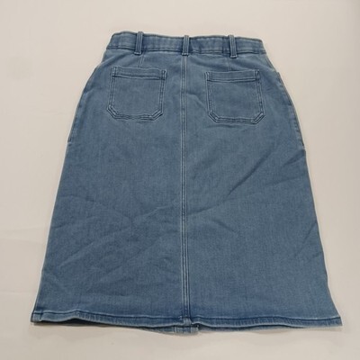 The Caslon RN#58665 Women's Blue Cotton Blend Button-Front Denim Skirt in size 6 is a stylish and versatile piece perfect for casual occasions. Made from a comfortable blend of polyester, spandex, rayon, cotton, and cotton blend, this skirt features a solid pattern with a classic button closure. The straight and pencil style, along with the skirt length of 26 inches, makes it suitable for the summer and spring seasons. With added accents like pockets and a timeless denim fabric type, this skirt from Caslon is a must-have addition to any woman's wardrobe.