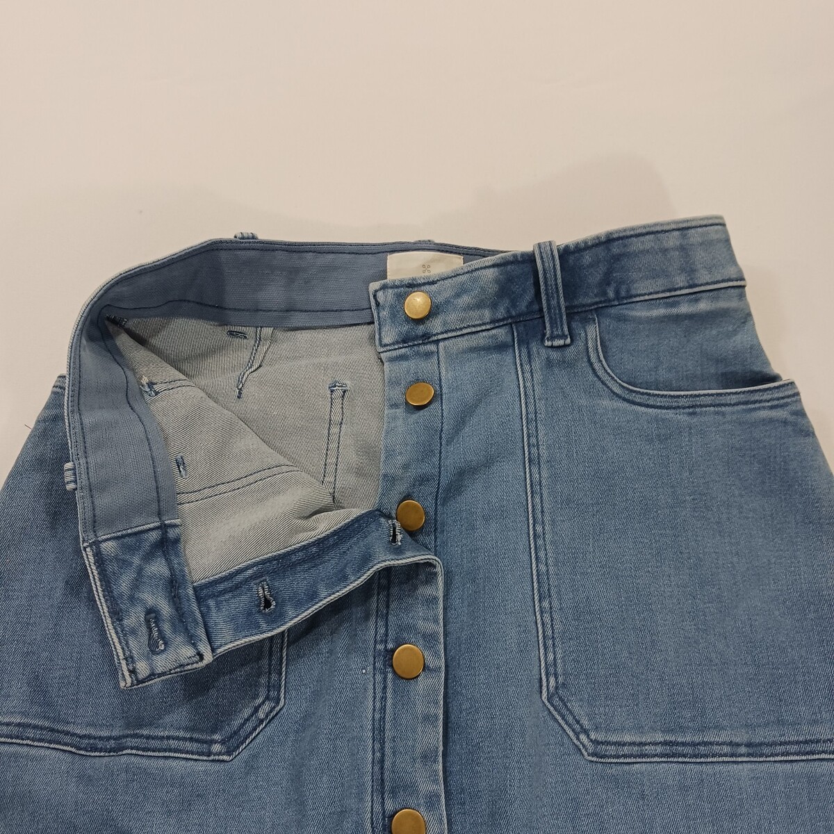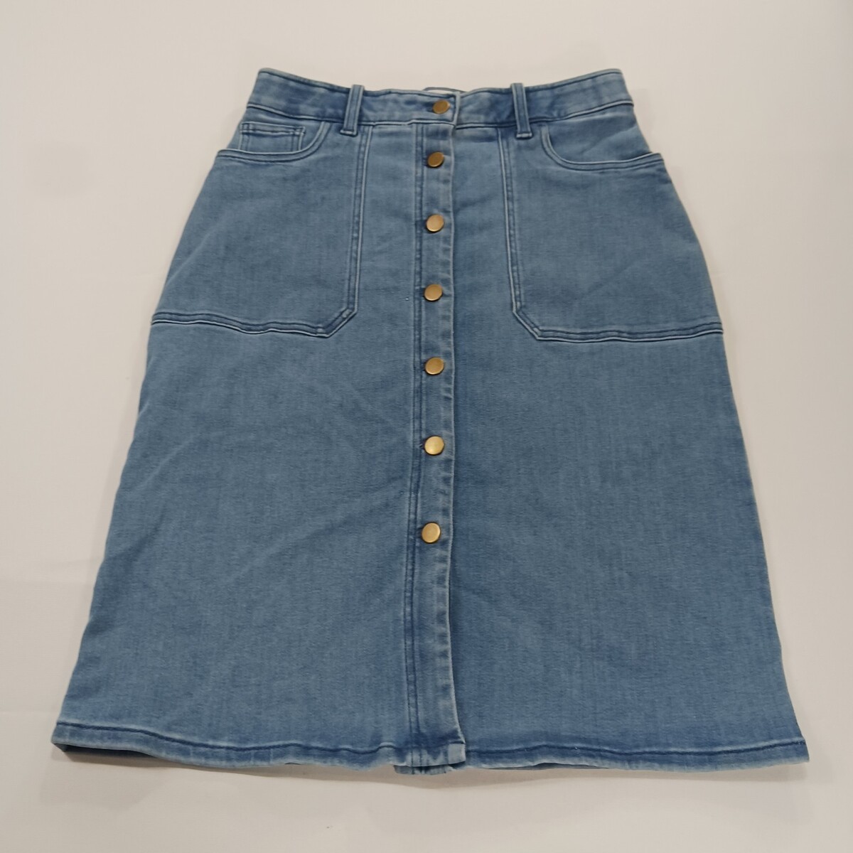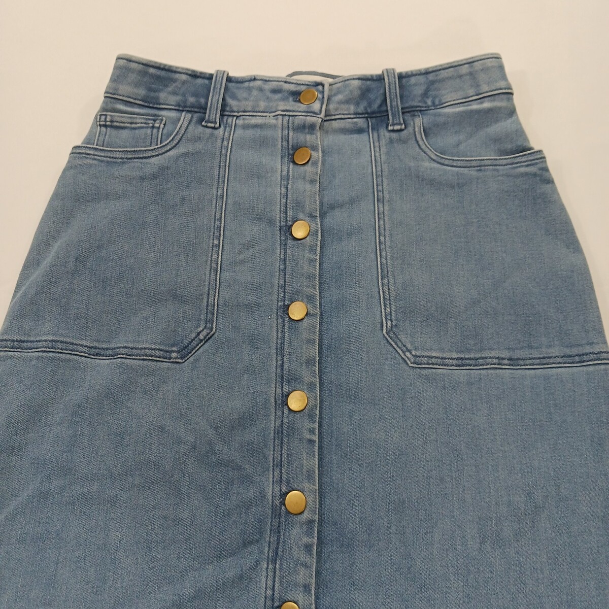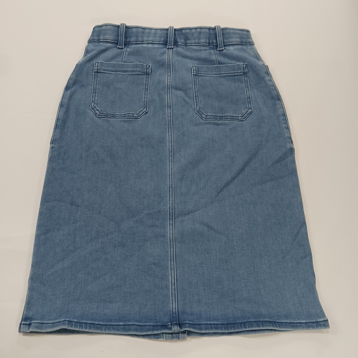 The Caslon RN#58665 Women's Blue Cotton Blend Button-Front Denim Skirt in size 6 is a stylish and versatile piece perfect for casual occasions. Made from a comfortable blend of polyester, spandex, rayon, cotton, and cotton blend, this skirt features a solid pattern with a classic button closure. The straight and pencil style, along with the skirt length of 26 inches, makes it suitable for the summer and spring seasons. With added accents like pockets and a timeless denim fabric type, this skirt from Caslon is a must-have addition to any woman's wardrobe.