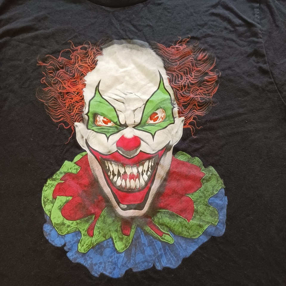 Looking for a unique and scary clown-themed T-shirt to rock at your Halloween party? Look no further than this black T-shirt, perfect for any fan of the holiday. Made from a comfortable and durable blend of polyester and cotton, this T-shirt features a crew neck, short sleeves, and a silkscreen graphic of a frightening clown.