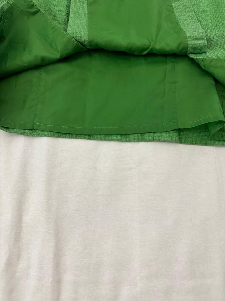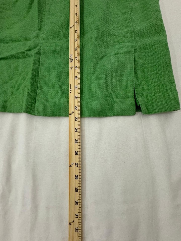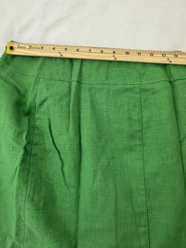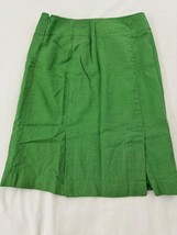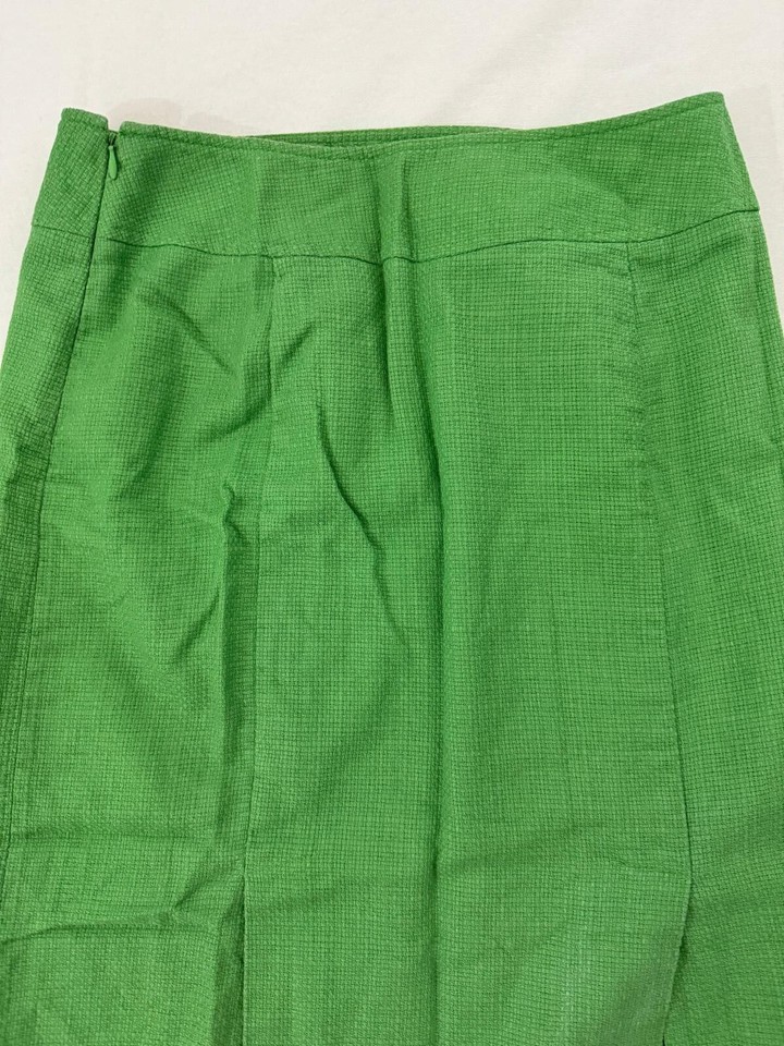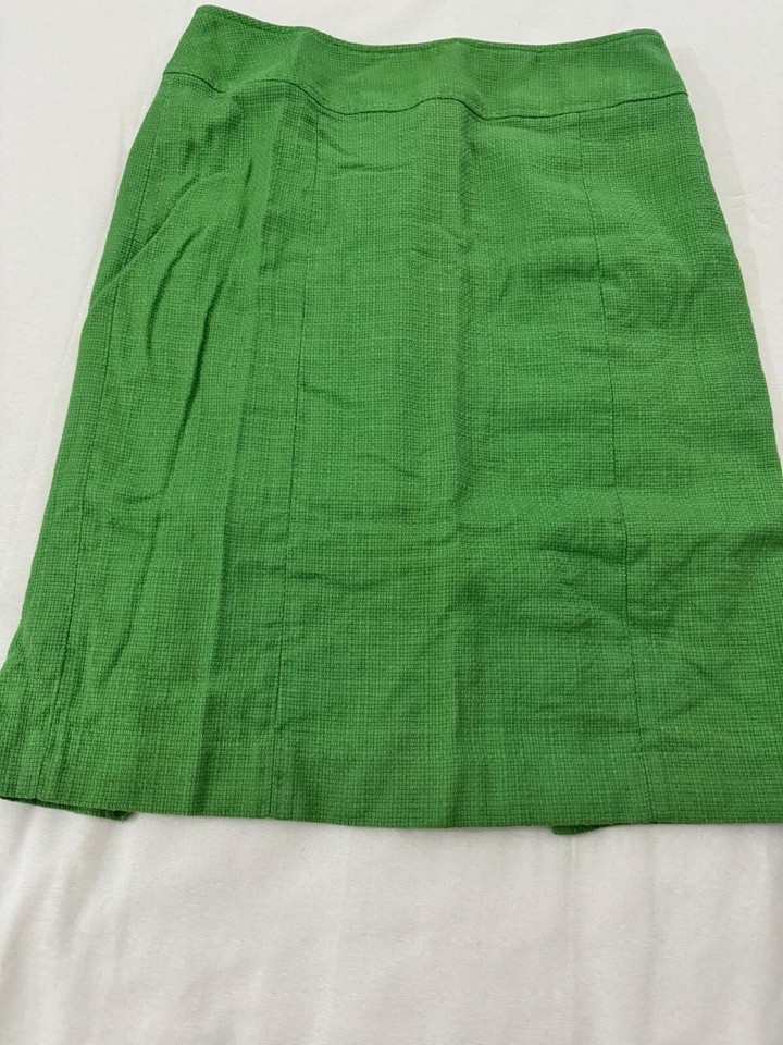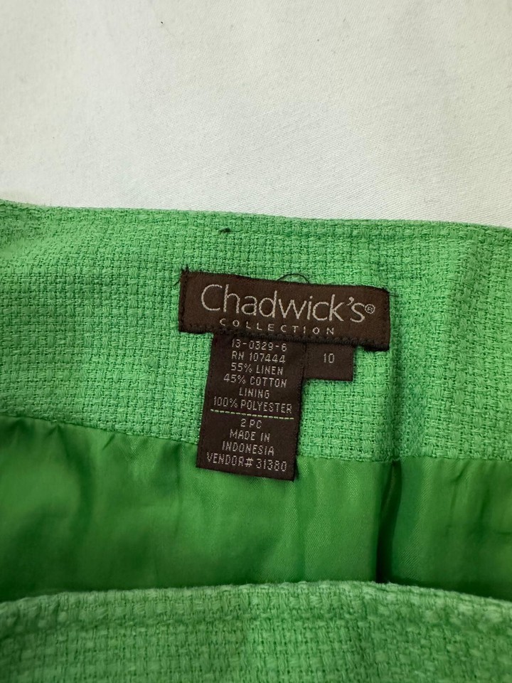 This is a Chadwick's Collection women's green pencil skirt in size 10. The skirt features a floral pattern and is made of a blend of polyester, linen, and cotton. It has a zip closure and falls at knee length, with a straight and pencil style. The skirt is lined and designed for regular fit, suitable for various occasions. Made in Indonesia, this garment offers a comfortable and stylish option for women's clothing collections.