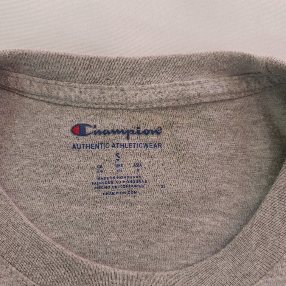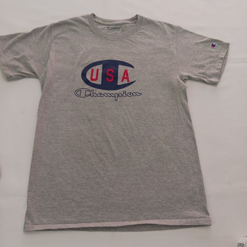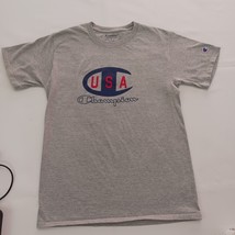 The product is an authentic Champion T-shirt in size small, made of a comfortable cotton blend material in gray color. It features a regular fit, short sleeves, and is designed specifically for men. The T-shirt also has a USA theme, perfect for those looking to show their patriotic spirit. This Champion T-shirt is a stylish and high-quality addition to any man's wardrobe.