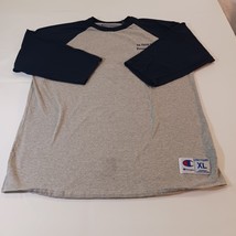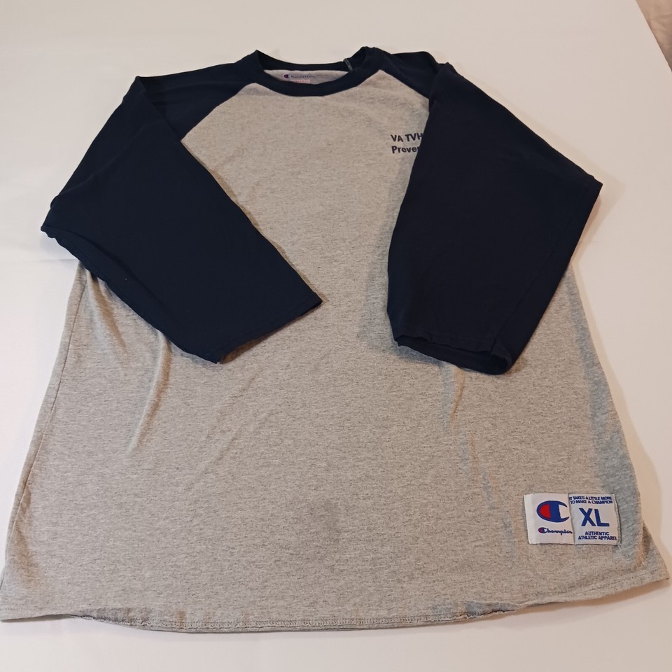 Champion Authentic Veteran Crisis Line Men's Gray & Blue T-Shirt in size XL is a pre-owned athletic fit t-shirt with a crew neck and 3/4 sleeves. The shirt is solid gray with blue accents and features the Champion brand. It is made of woven fabric and is lined. The shirt also has the Classic character family and was manufactured in Honduras.