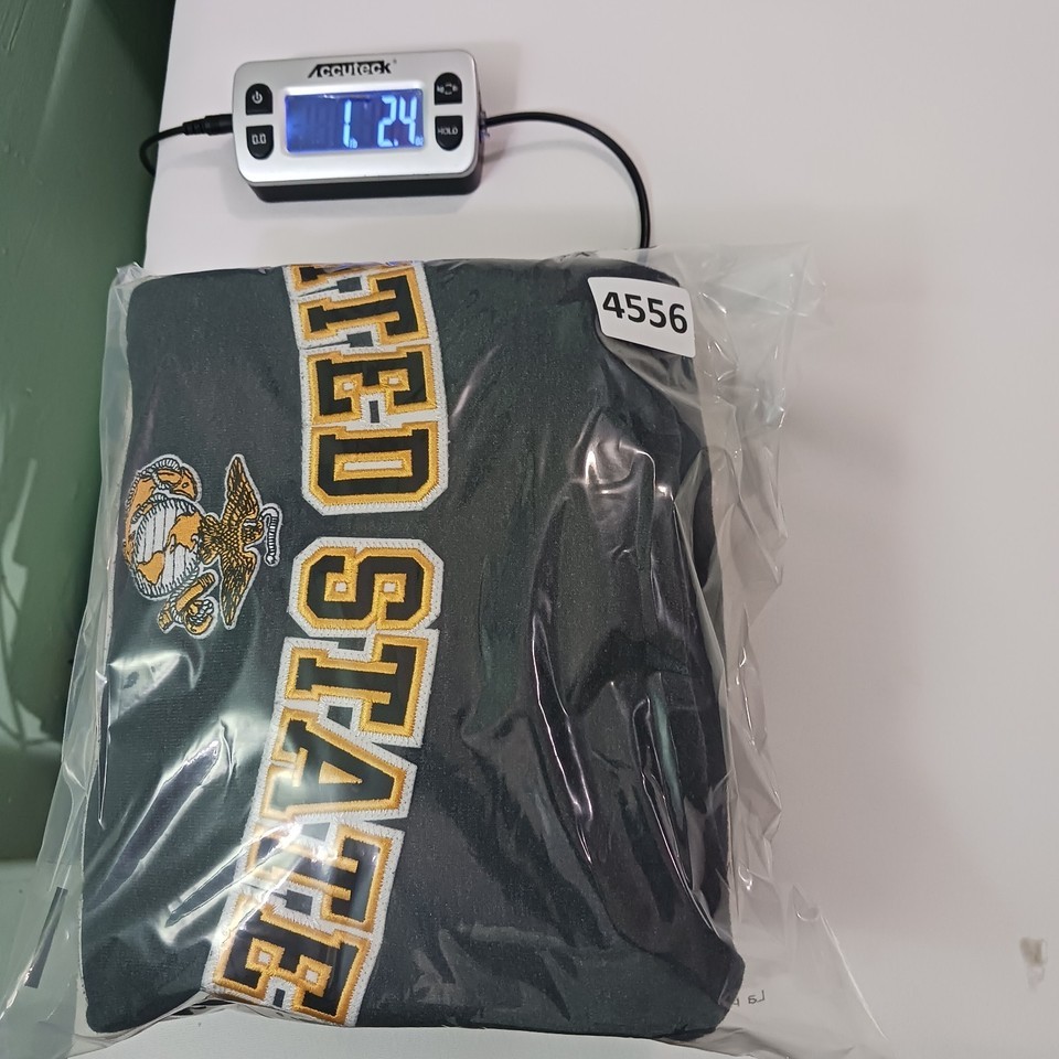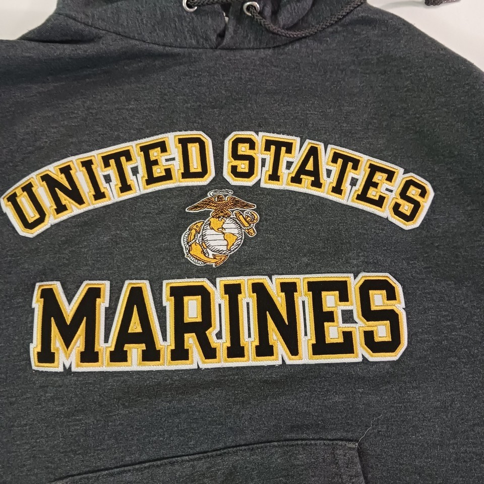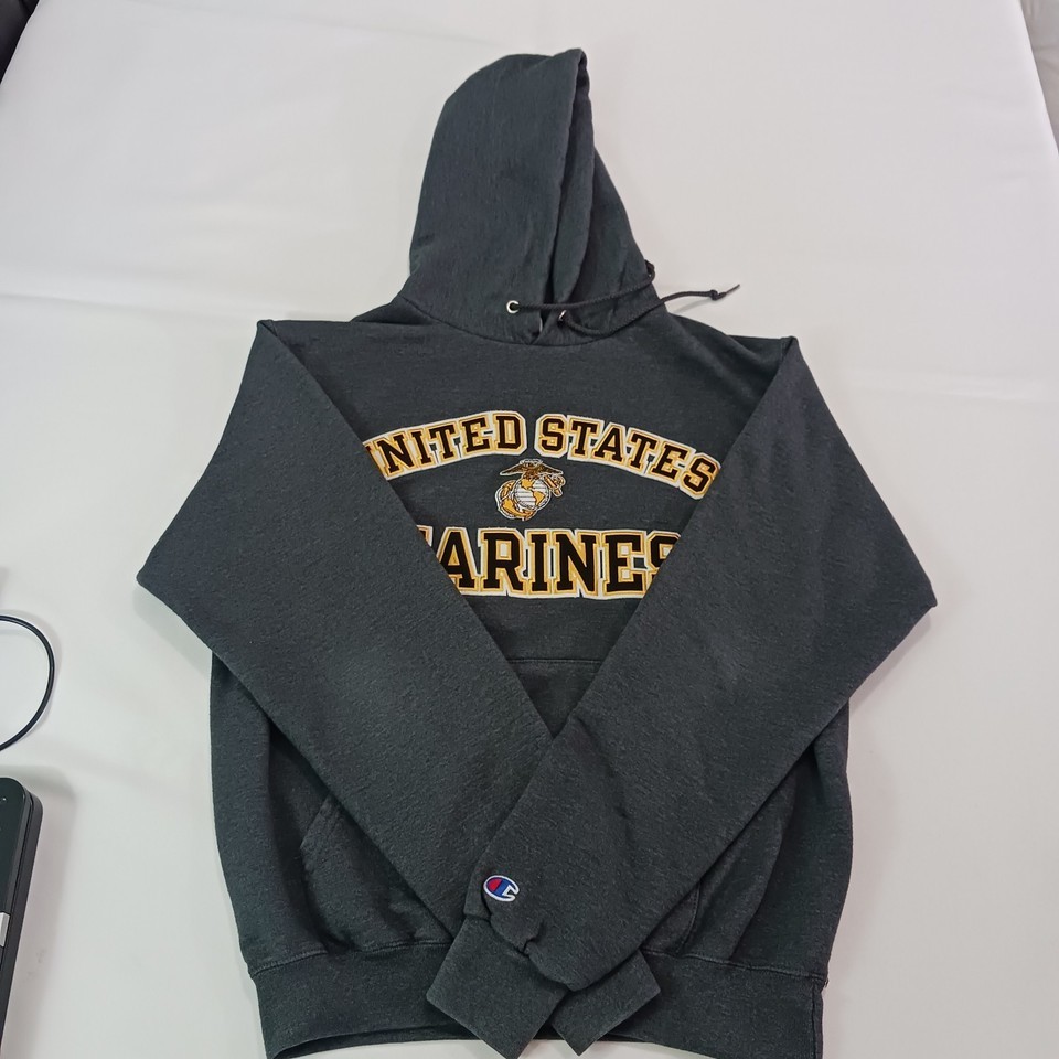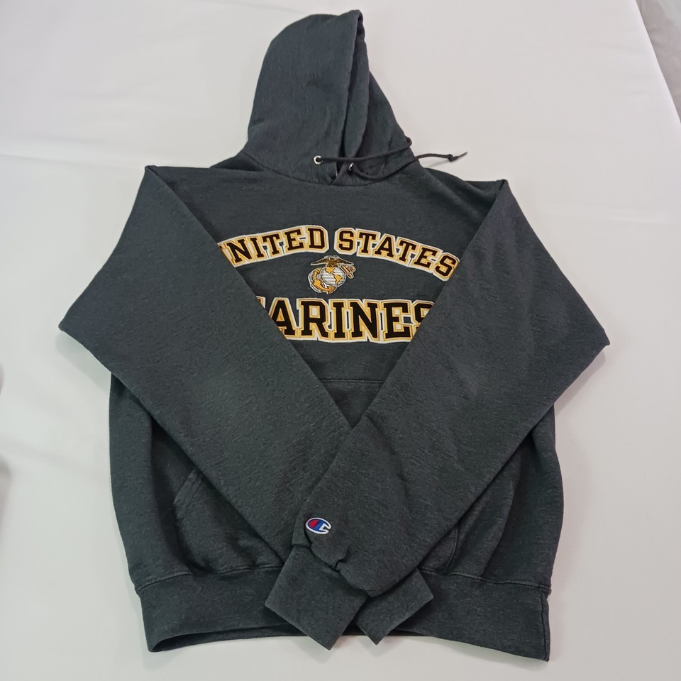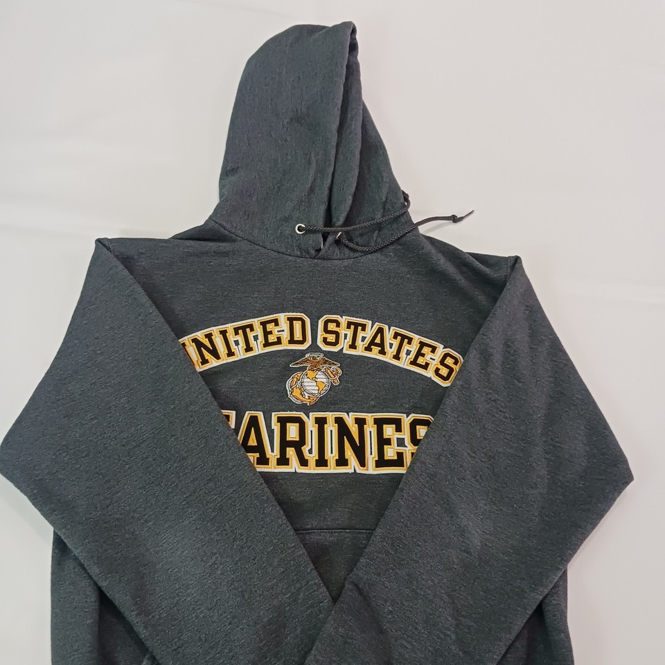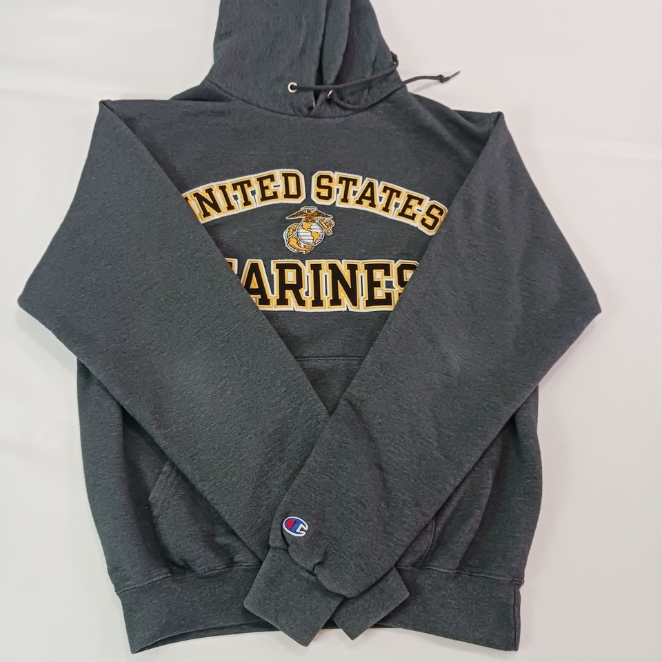 The Champion RN#49314 United States Marines Hoodie is a men's gray hoodie sweatshirt in size small. Made from a blend of polyester and cotton, this pullover hoodie features a solid gray color, long sleeves, and pockets for added convenience. The hoodie is designed with a marine theme, making it a stylish and comfortable choice for casual wear or representing the United States Marines with pride. Perfect for any man looking for a quality hoodie with a military-inspired design.