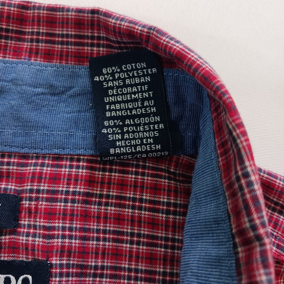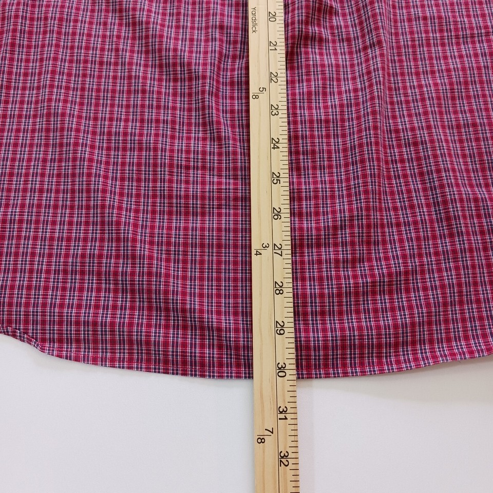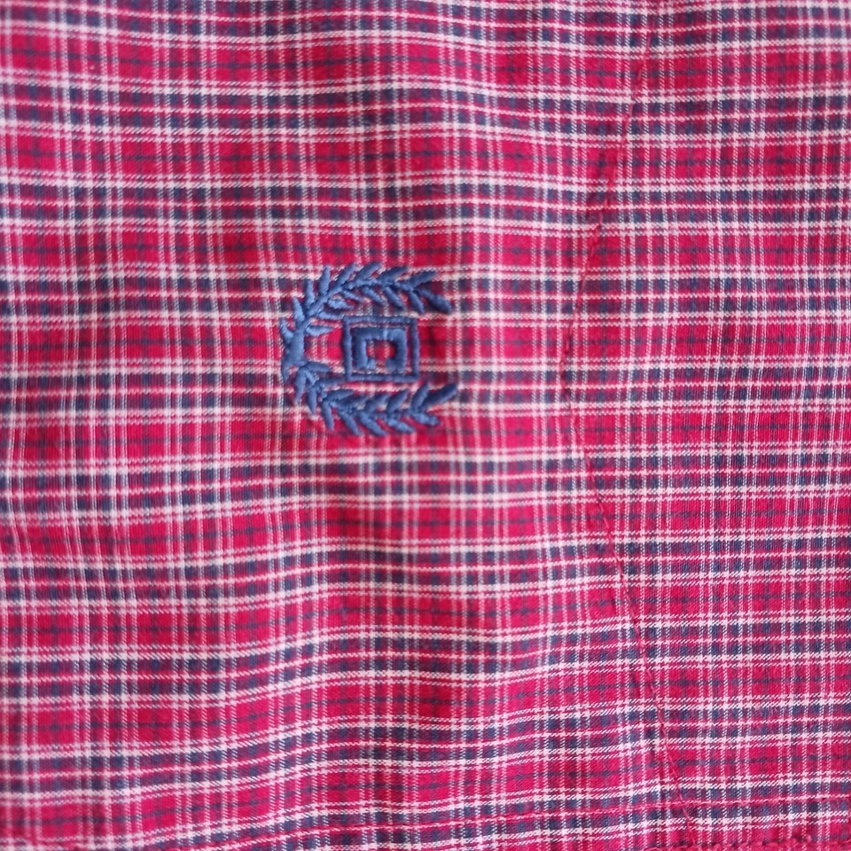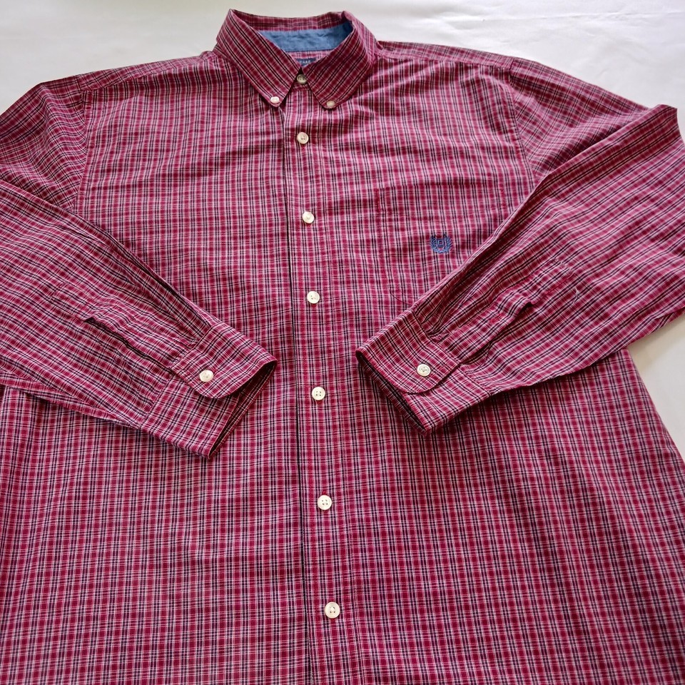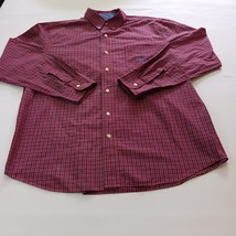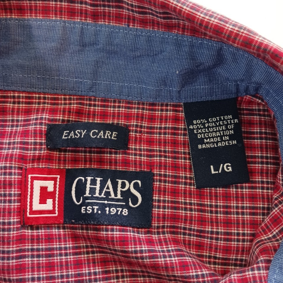 Up for sale is a Chaps button-up shirt in size large. This designer shirt features a colorful red plaid pattern with a collared neckline and button-down collar style. The shirt is made of a blended fabric with a material composition of polyester and cotton. It has short sleeves and a regular fit, making it suitable for both casual and business occasions. The shirt is machine washable and easy to care for. It has been well-maintained and comes from a smoke-free, pet-free home. Don't miss out on this great addition to your wardrobe!