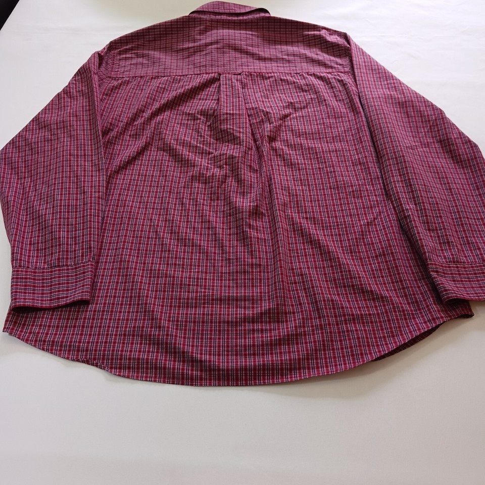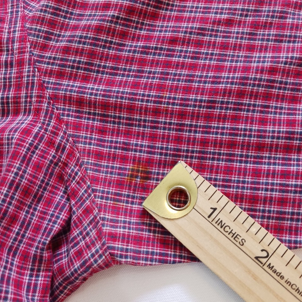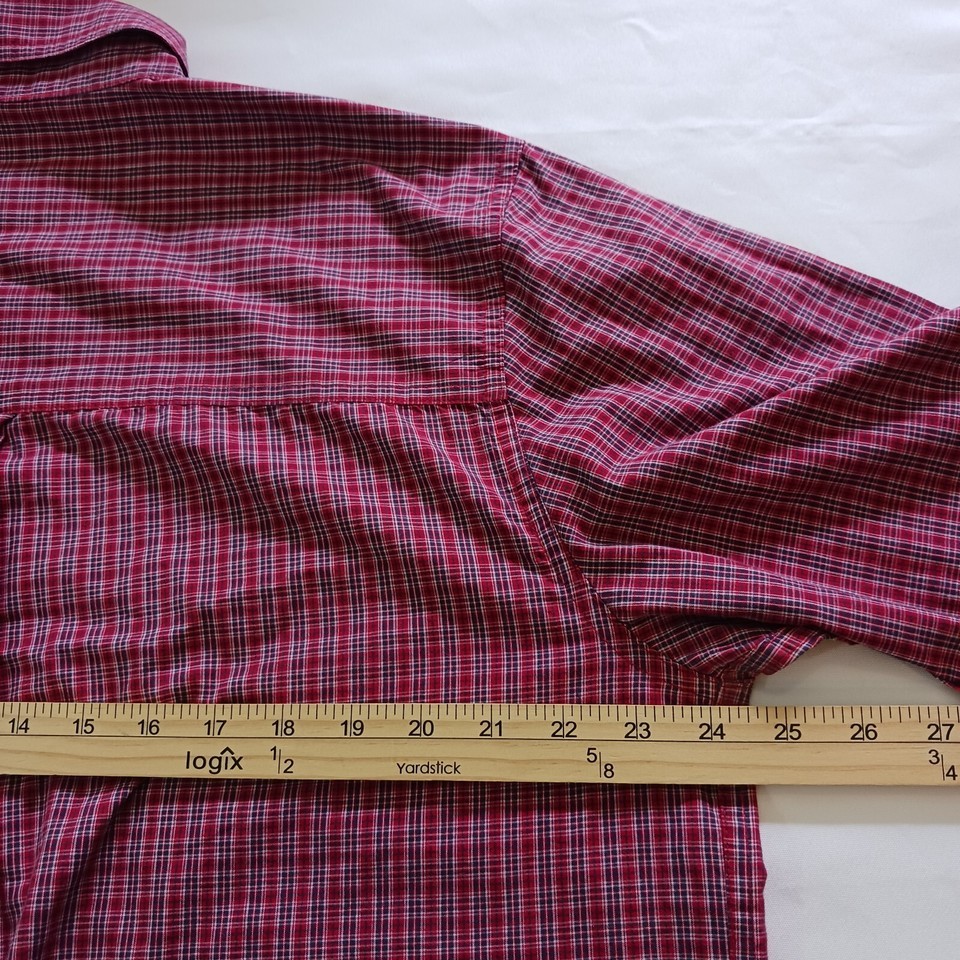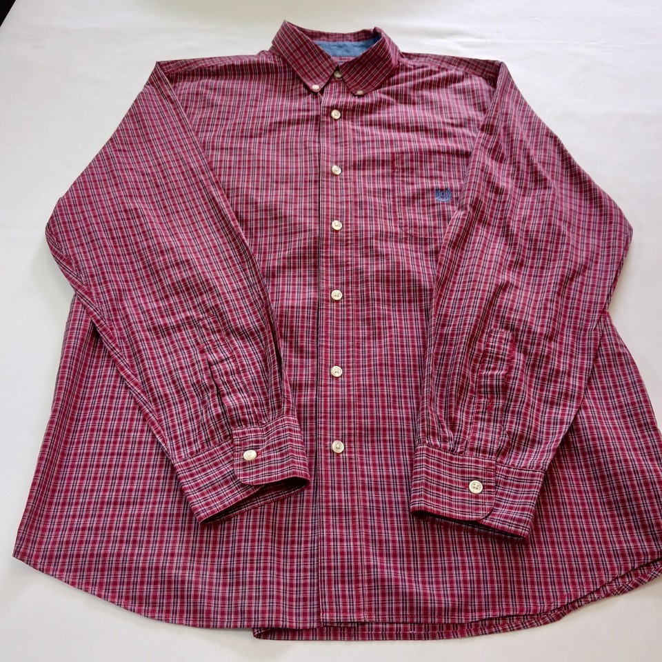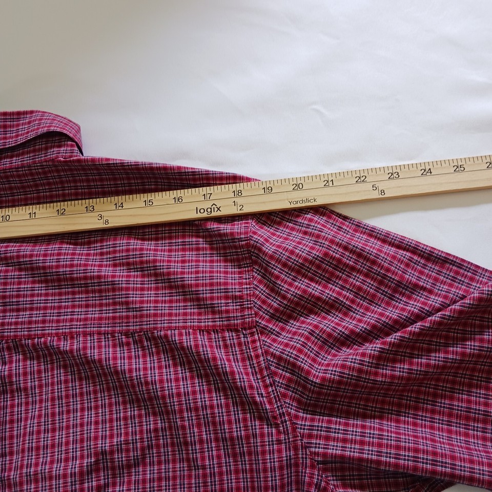 Up for sale is a Chaps button-up shirt in size large. This designer shirt features a colorful red plaid pattern with a collared neckline and button-down collar style. The shirt is made of a blended fabric with a material composition of polyester and cotton. It has short sleeves and a regular fit, making it suitable for both casual and business occasions. The shirt is machine washable and easy to care for. It has been well-maintained and comes from a smoke-free, pet-free home. Don't miss out on this great addition to your wardrobe!