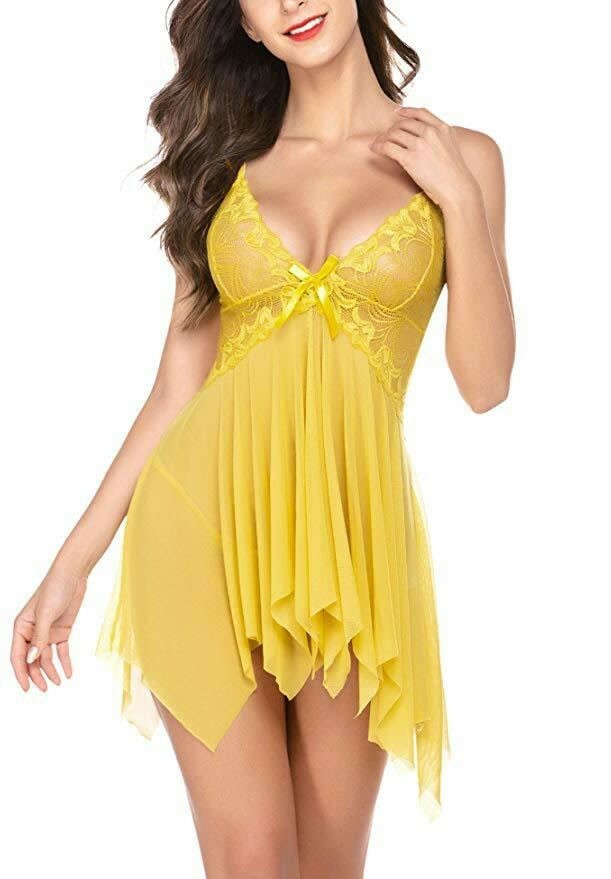 • Charming Lingerie Lace Yellow Chemise With Asymmetrical Hemline - Size Small image 1