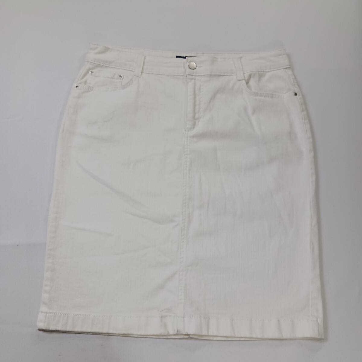 The Charter Club Women's White Cotton Blend Rear Slit Denim Skirt in size 10 is a versatile and stylish addition to any wardrobe. Made from a comfortable blend of spandex and cotton, this skirt features a classic button closure and a flattering straight and pencil style. With a rear slit for added flair, this skirt can be dressed up for formal occasions or worn casually for everyday style. Machine washable for easy care, this skirt is perfect for year-round wear and is sure to become a go-to piece for any season.
