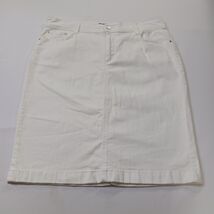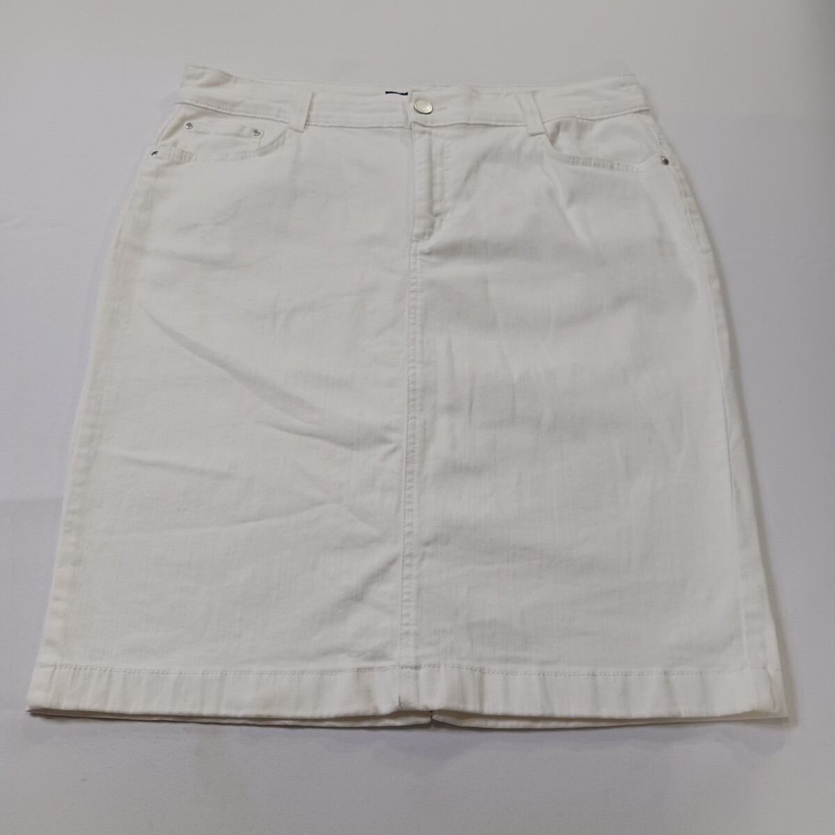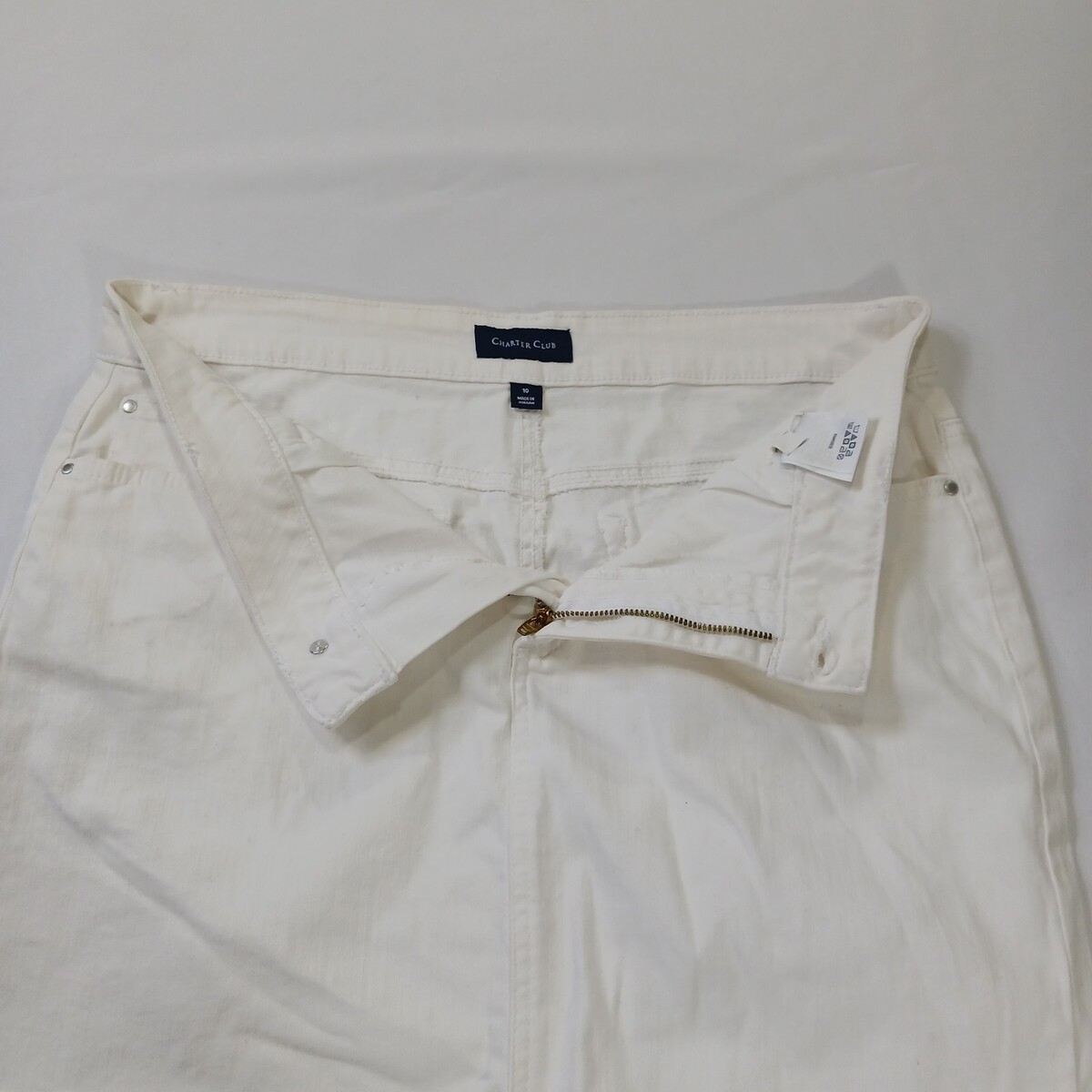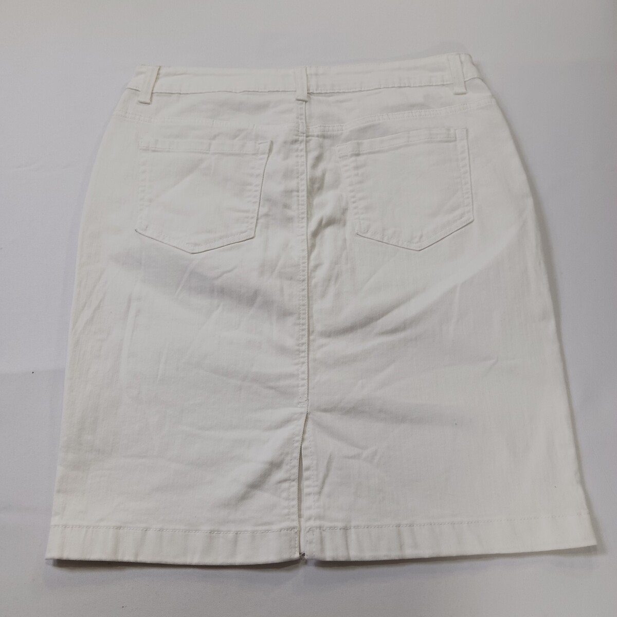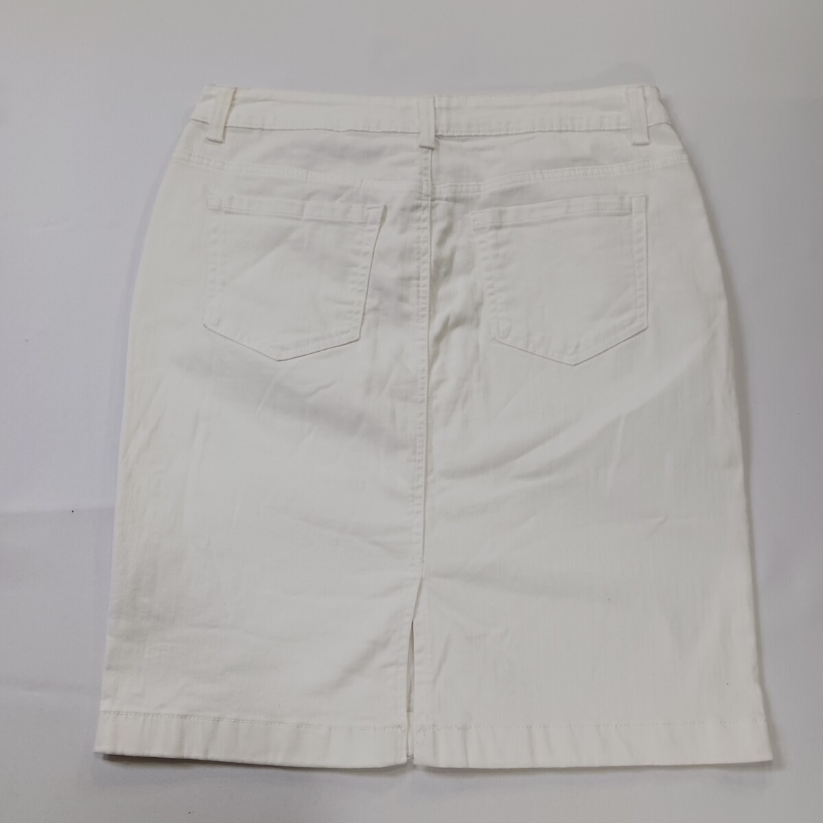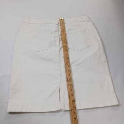 The Charter Club Women's White Cotton Blend Rear Slit Denim Skirt in size 10 (32W × 22.5 L) is a versatile and stylish addition to any wardrobe. Made from a comfortable blend of spandex and cotton, this skirt features a classic button closure and a flattering straight and pencil style. With a rear slit for added flair, this skirt can be dressed up for formal occasions or worn casually for everyday style. Machine washable for easy care, this skirt is perfect for year-round wear and is sure to become a go-to piece for any season.