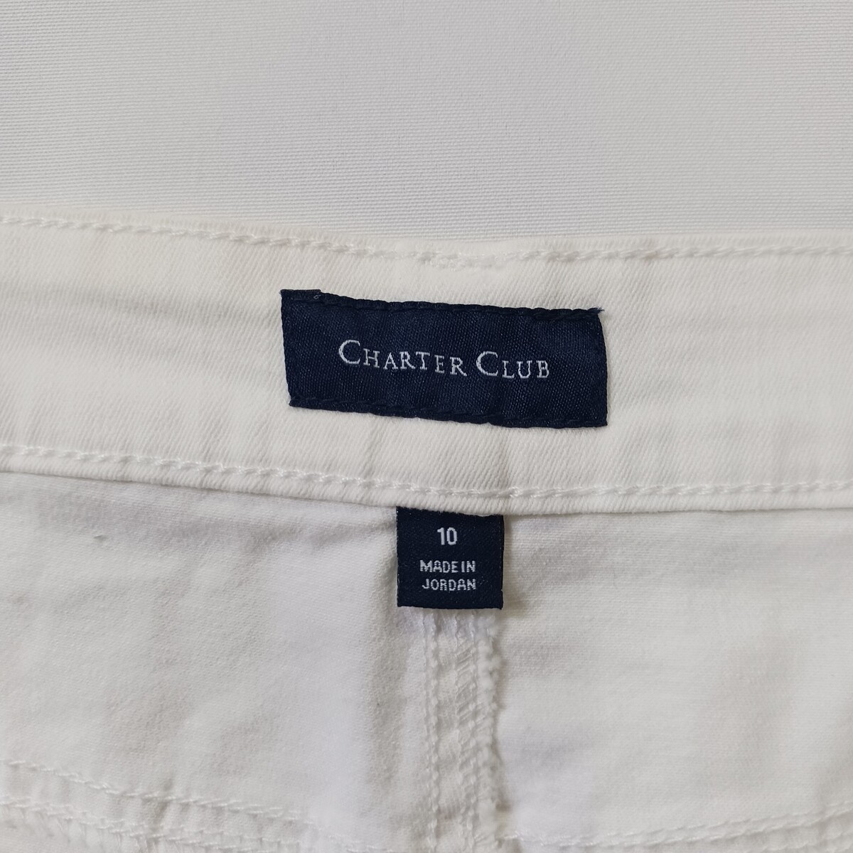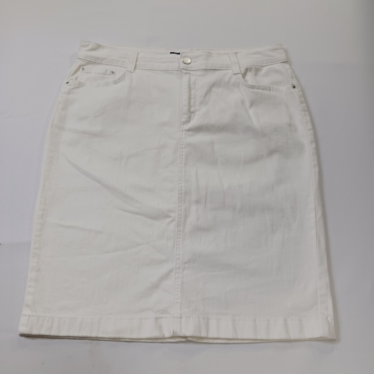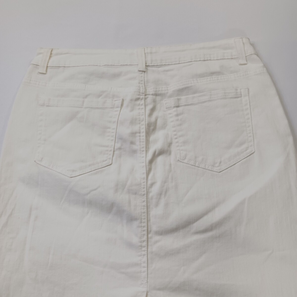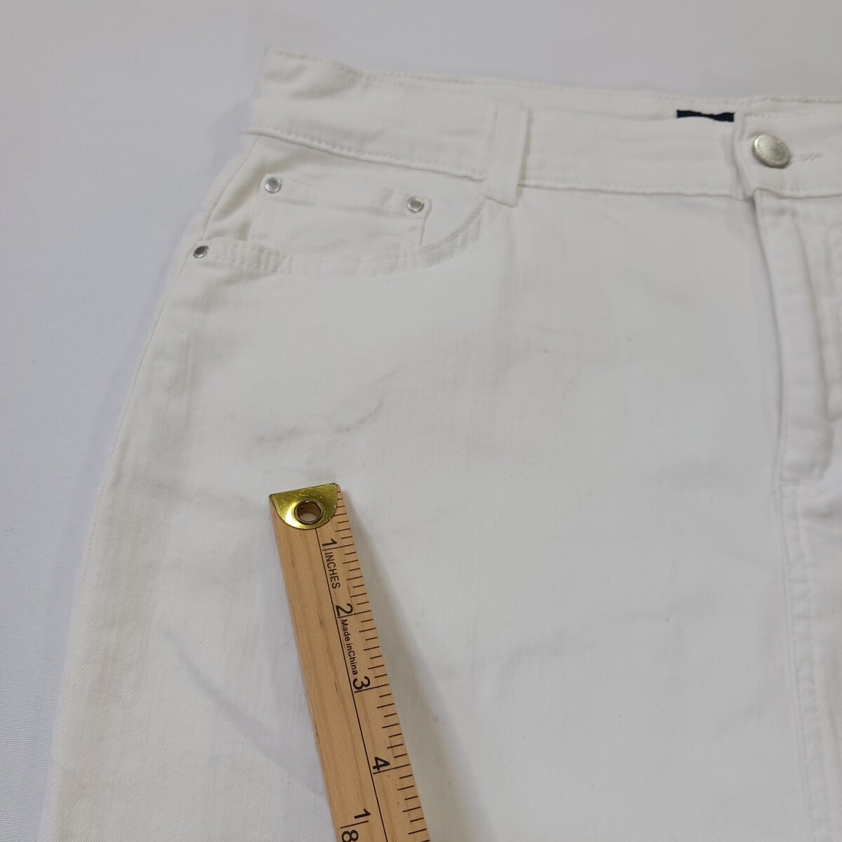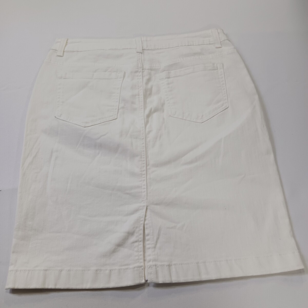 The Charter Club Women's White Cotton Blend Rear Slit Denim Skirt in size 10 (32W × 22.5 L) is a versatile and stylish addition to any wardrobe. Made from a comfortable blend of spandex and cotton, this skirt features a classic button closure and a flattering straight and pencil style. With a rear slit for added flair, this skirt can be dressed up for formal occasions or worn casually for everyday style. Machine washable for easy care, this skirt is perfect for year-round wear and is sure to become a go-to piece for any season.