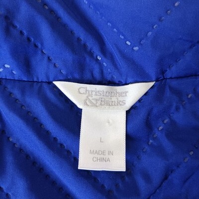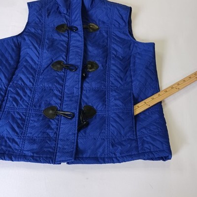 The Christopher Banks RN#54867 Women's Blue Full Zip Sleeveless Vest in size Large is a classic and stylish addition to any woman's wardrobe. Made from polyester with a quilted design, this mid-length vest features a solid blue color and a full zip closure with buttons for accent. Perfect for casual occasions in the fall season, this vest is designed for regular size women with a collared neckline and sleeveless style, offering both comfort and style in one versatile piece.