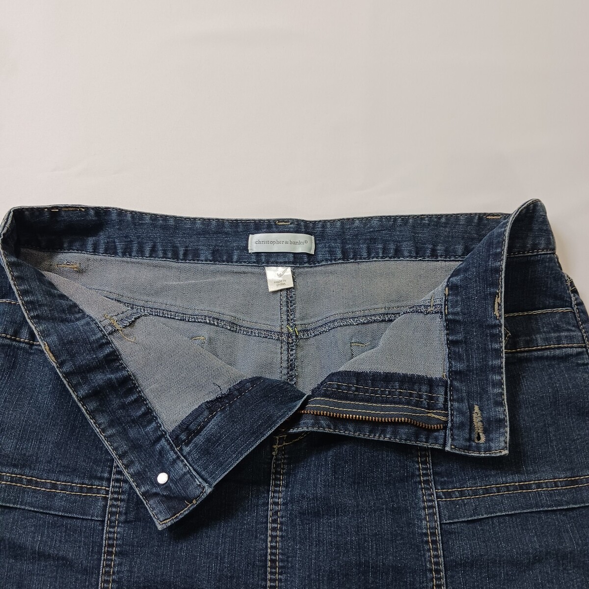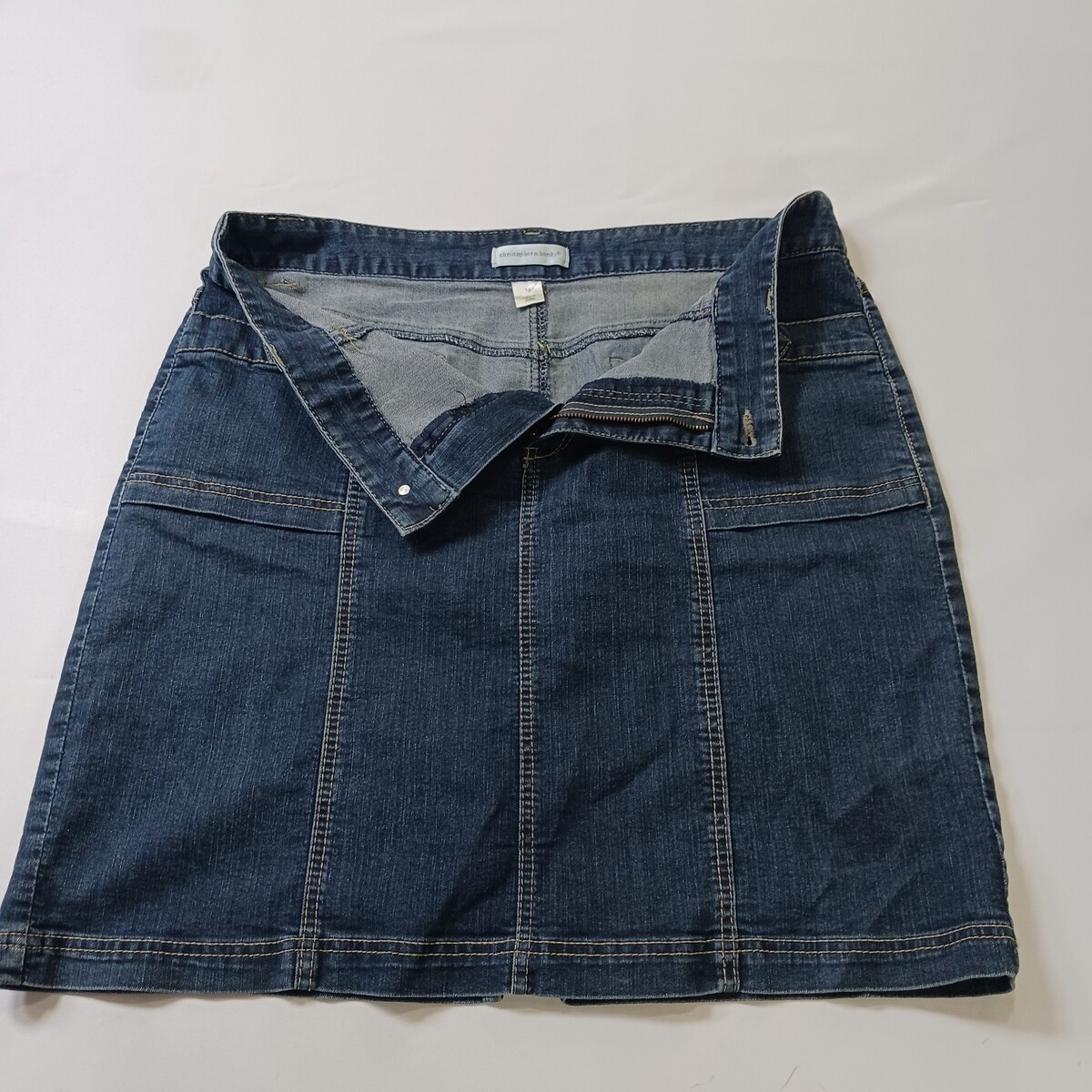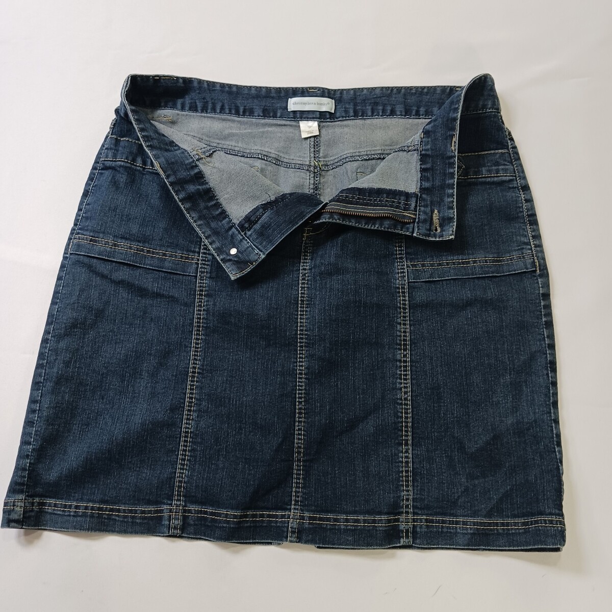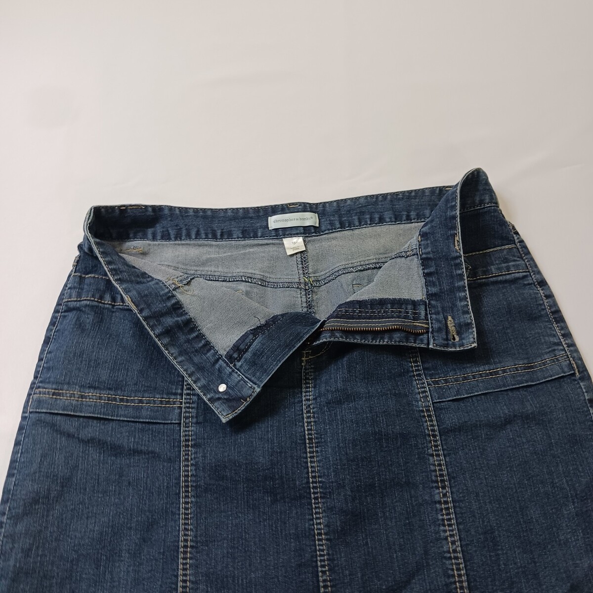 This Christopher & Banks RN#55826 Women's Blue Cotton Blend Denim Skirt in size 14 is a versatile garment perfect for various occasions such as travel, casual outings, or business meetings. Made from a comfortable cotton blend fabric with a high rise and A-line style, this skirt features a zip closure, pockets, and natural accents like buttons and zippers. The classic blue color and denim fabric add a touch of Western flair to your wardrobe, making it a stylish and practical choice for the warmer seasons of spring, summer, and fall.