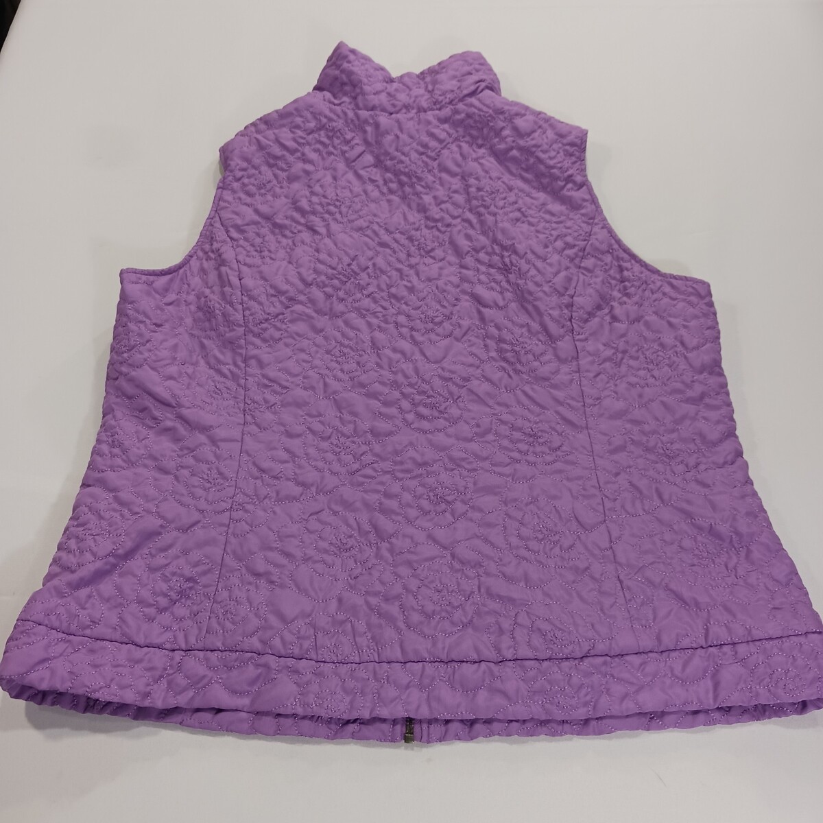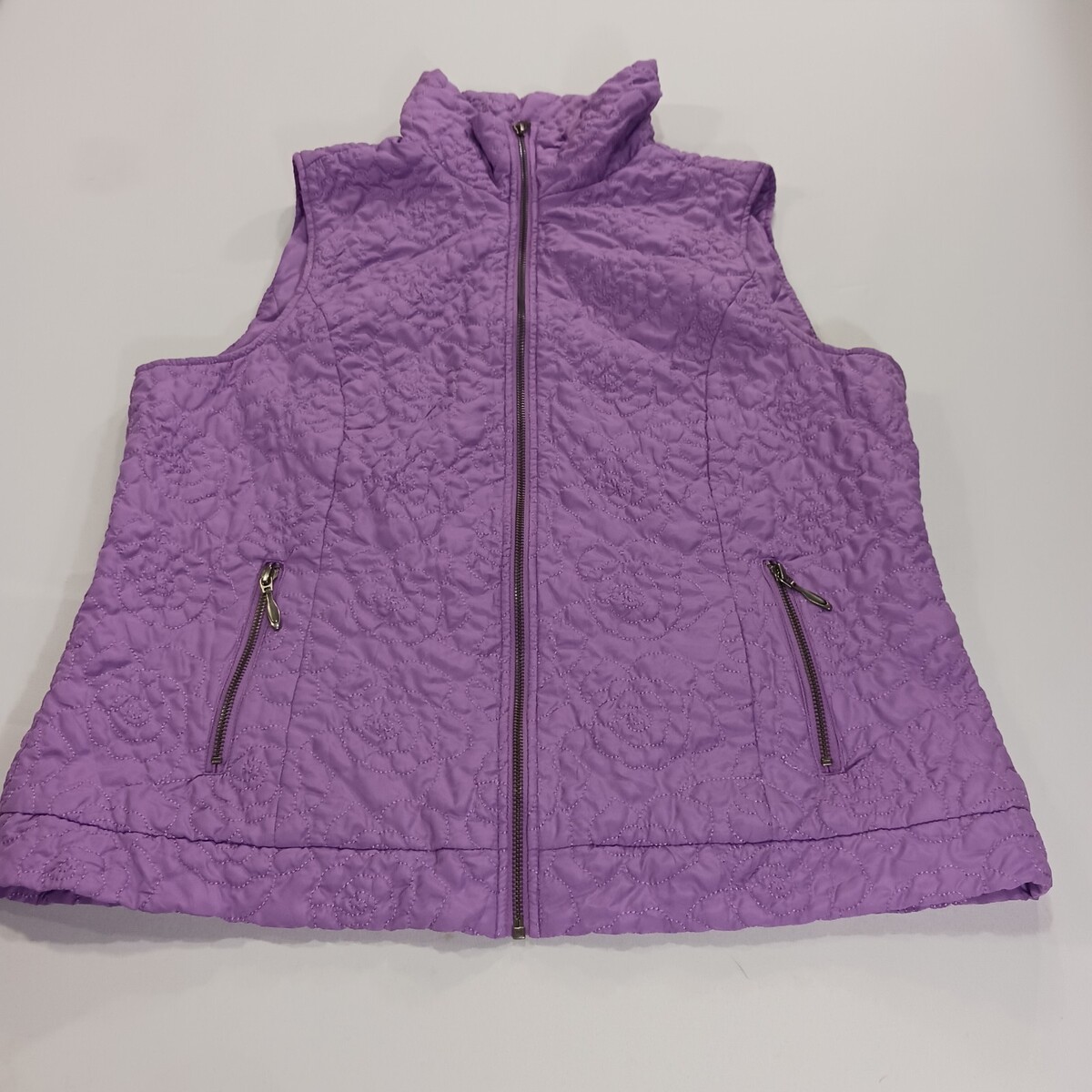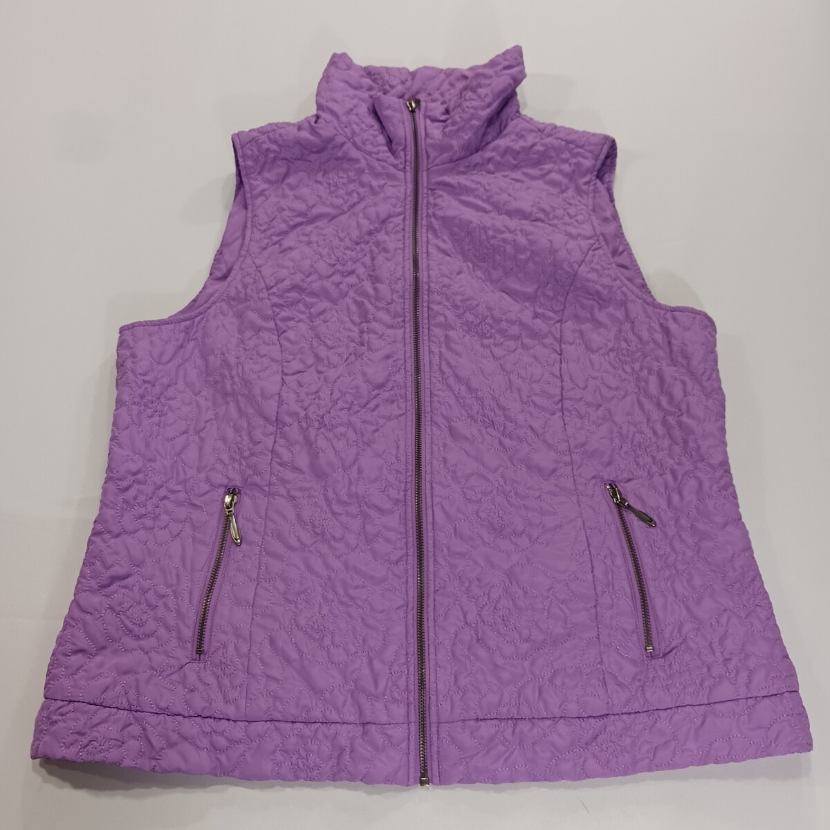The Christopher & Banks RN#63823 Women's Lavender Full-Zip Sleeveless Vest in size XL is a stylish and versatile addition to any woman's wardrobe. Made of polyester, this vest features a solid black color with a full-zip closure and a sleeveless design. It is designed for plus-size women and measures 25 inches in length. The brand, Christopher & Banks, is known for its quality and fashionable designs, making this vest a great choice for layering or wearing on its own.
