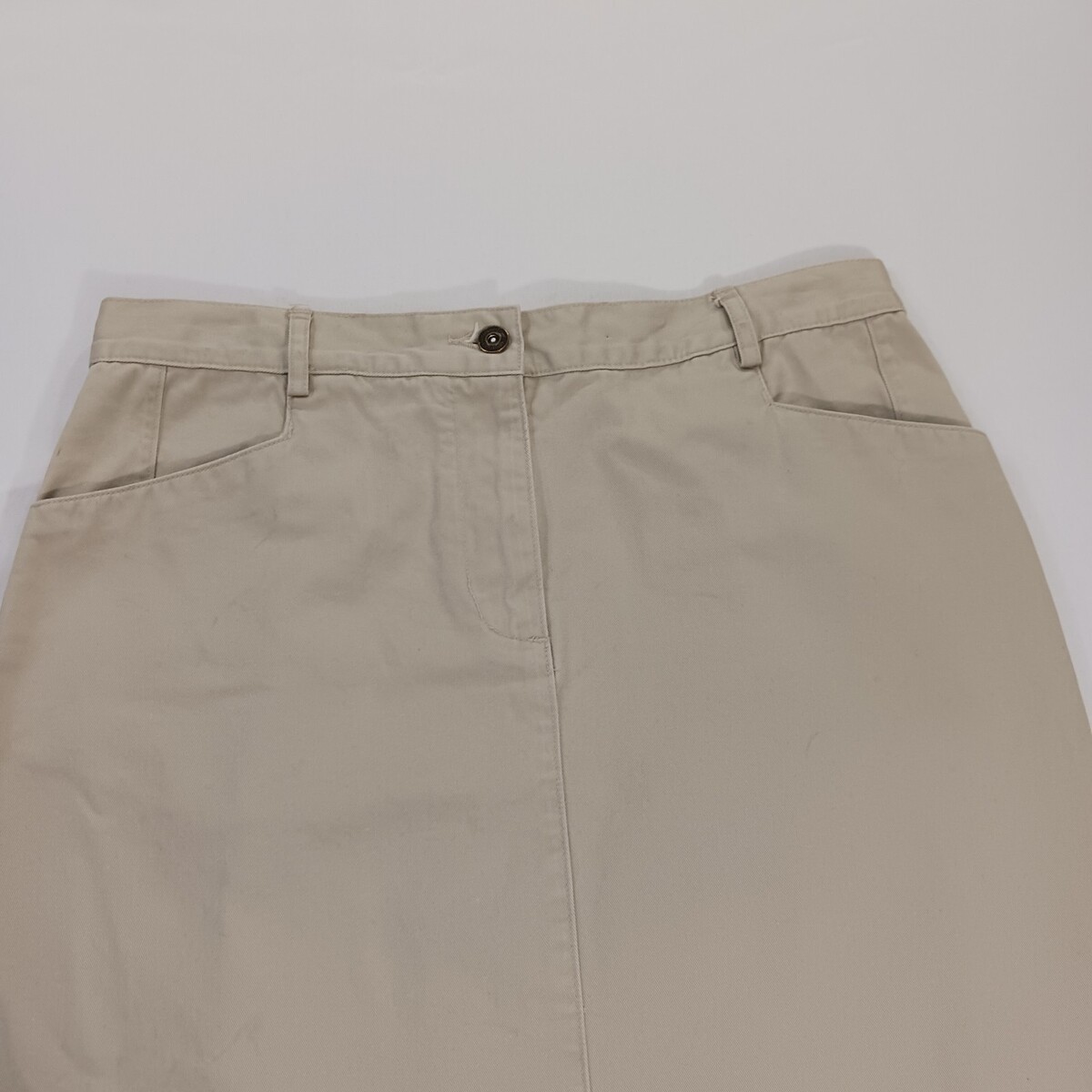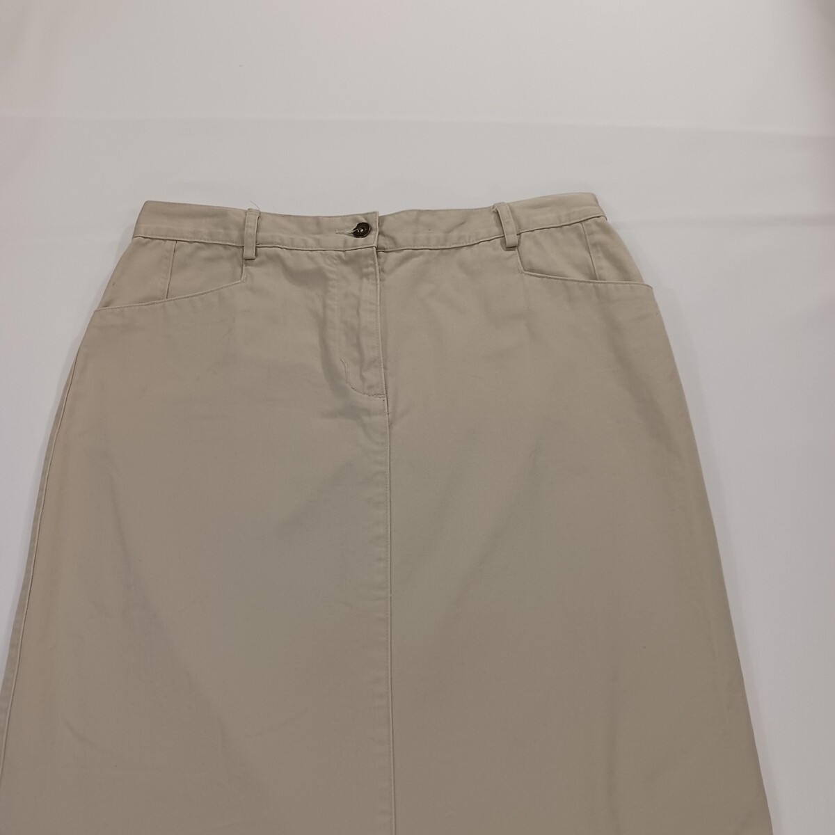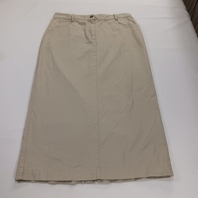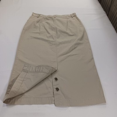 The Christopher & Banks RN#63823 Women's Tan/Khaki Cotton Denim Skirt in size 12 is a versatile and stylish piece perfect for various occasions such as travel, casual outings, or business meetings. Made of comfortable cotton denim fabric with a solid beige color, this A-line skirt features a zip closure and button accents. It has a length of 33 inches and comes with pockets for added functionality. Easy to care for with machine washable instructions, this skirt is ideal for the summer, fall, and spring seasons.