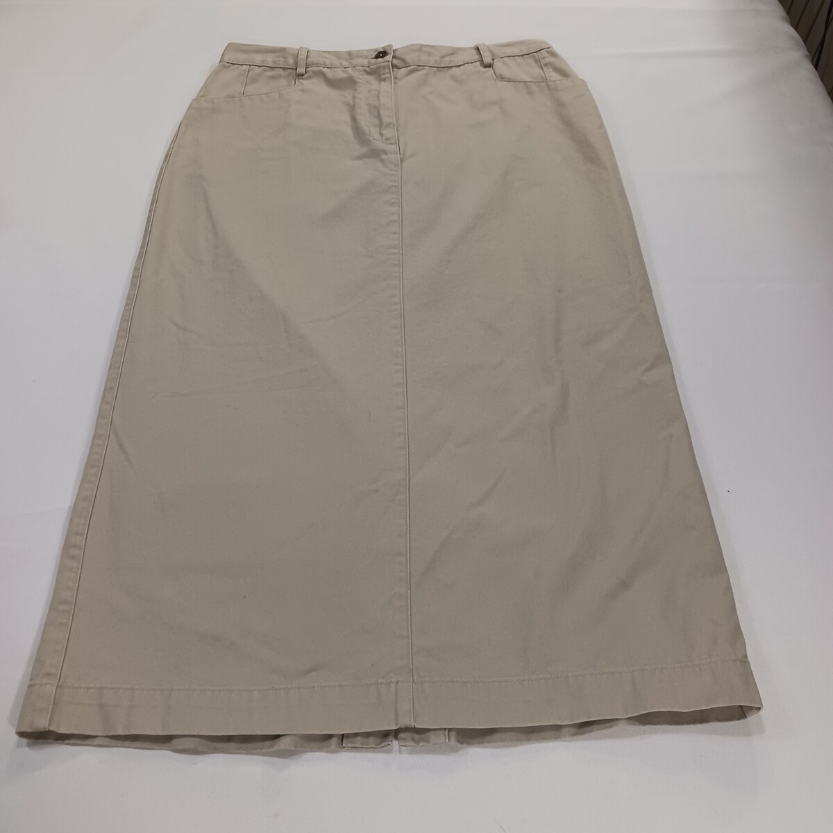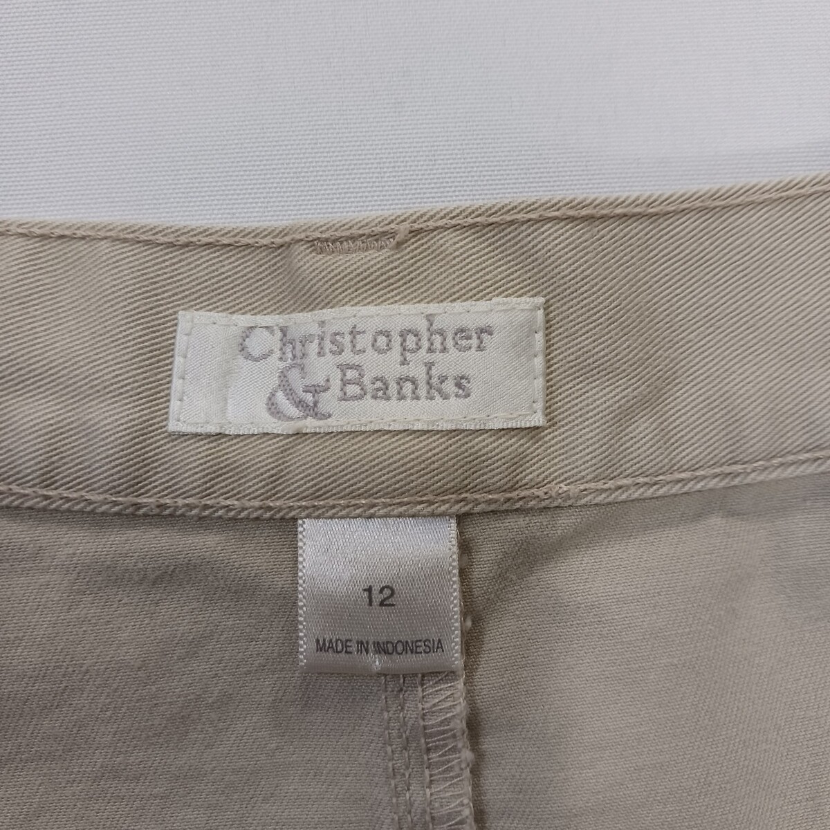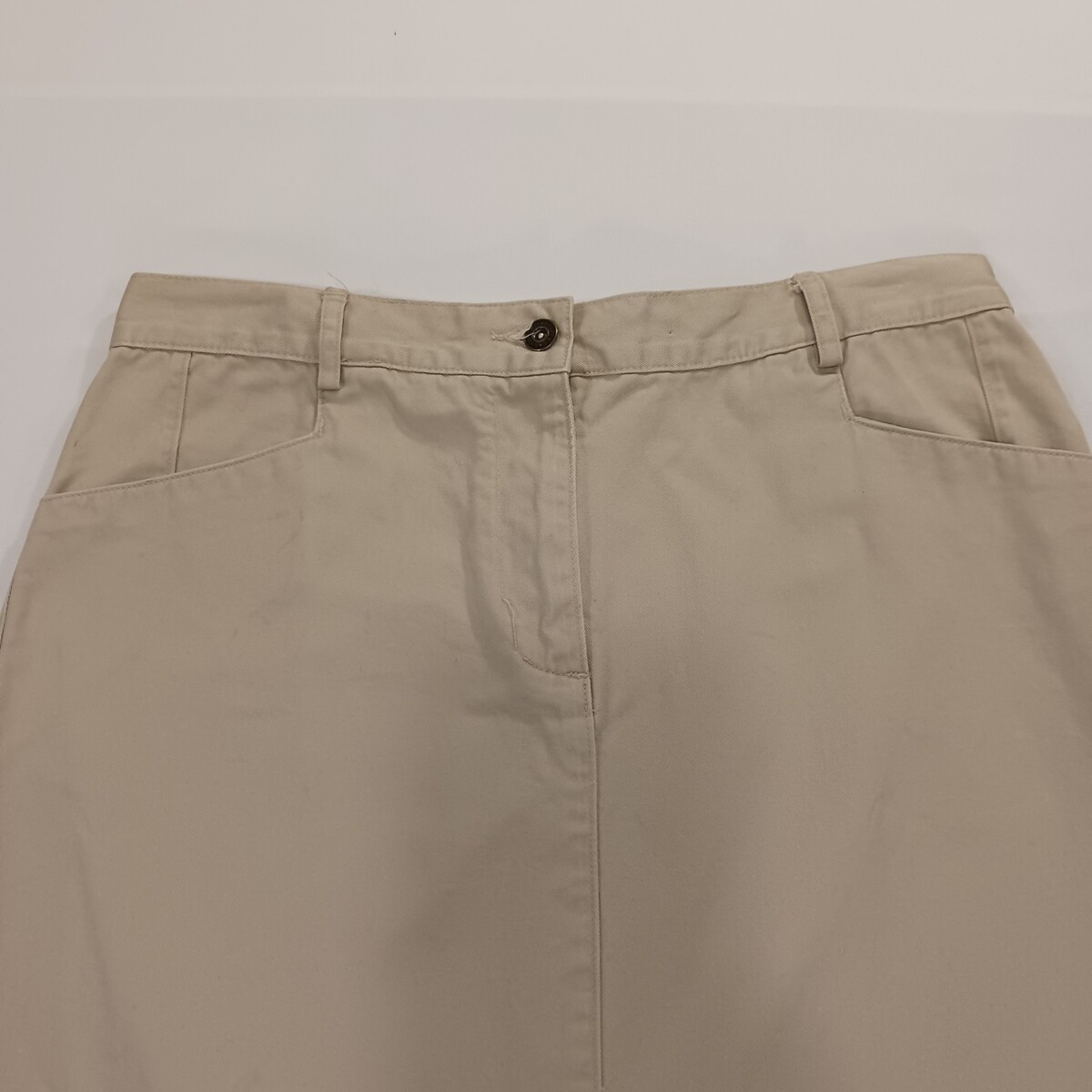 The Christopher & Banks RN#63823 Women's Tan/Khaki Cotton Denim Skirt in size 12 is a versatile and stylish piece perfect for various occasions such as travel, casual outings, or business meetings. Made of comfortable cotton denim fabric with a solid beige color, this A-line skirt features a zip closure and button accents. It has a length of 33 inches and comes with pockets for added functionality. Easy to care for with machine washable instructions, this skirt is ideal for the summer, fall, and spring seasons.