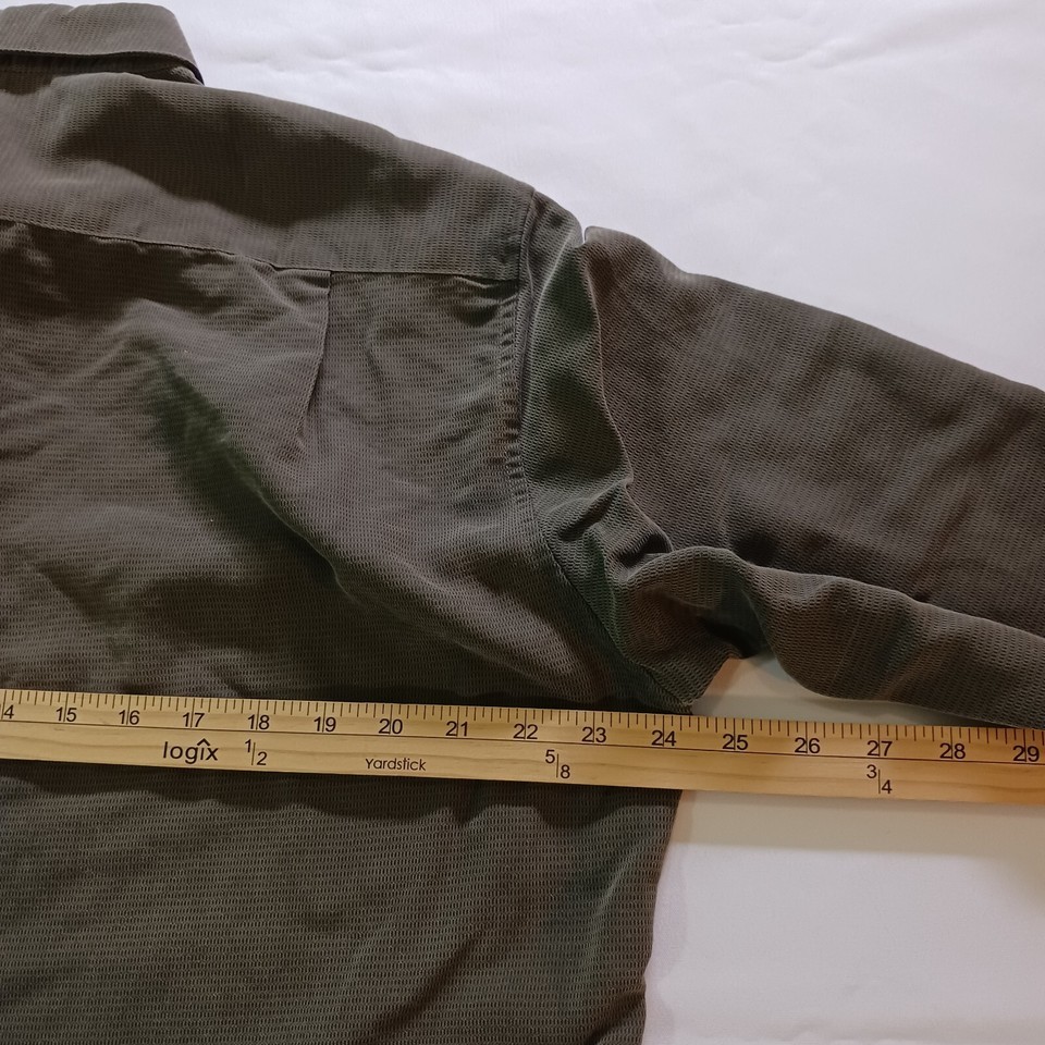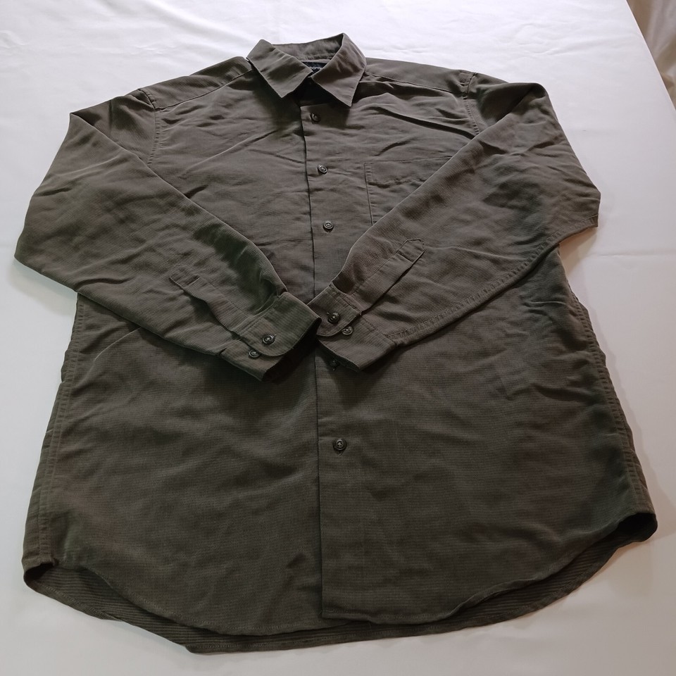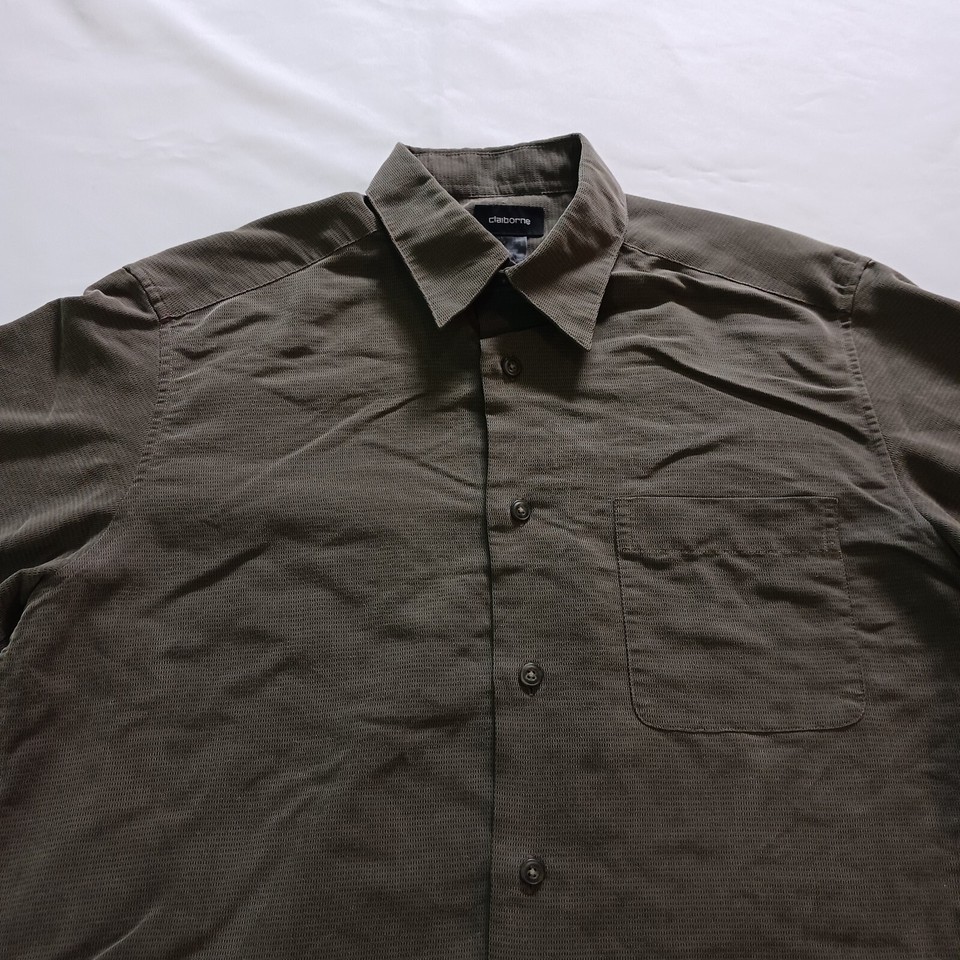 This Claiborne RN#52002 men's green button-up shirt is perfect for any occasion. With its solid pattern, long sleeves, and collared neckline, it exudes a classic and timeless style that can be dressed up or down. The shirt features a spread collar style and button closure, adding a touch of sophistication to its design.