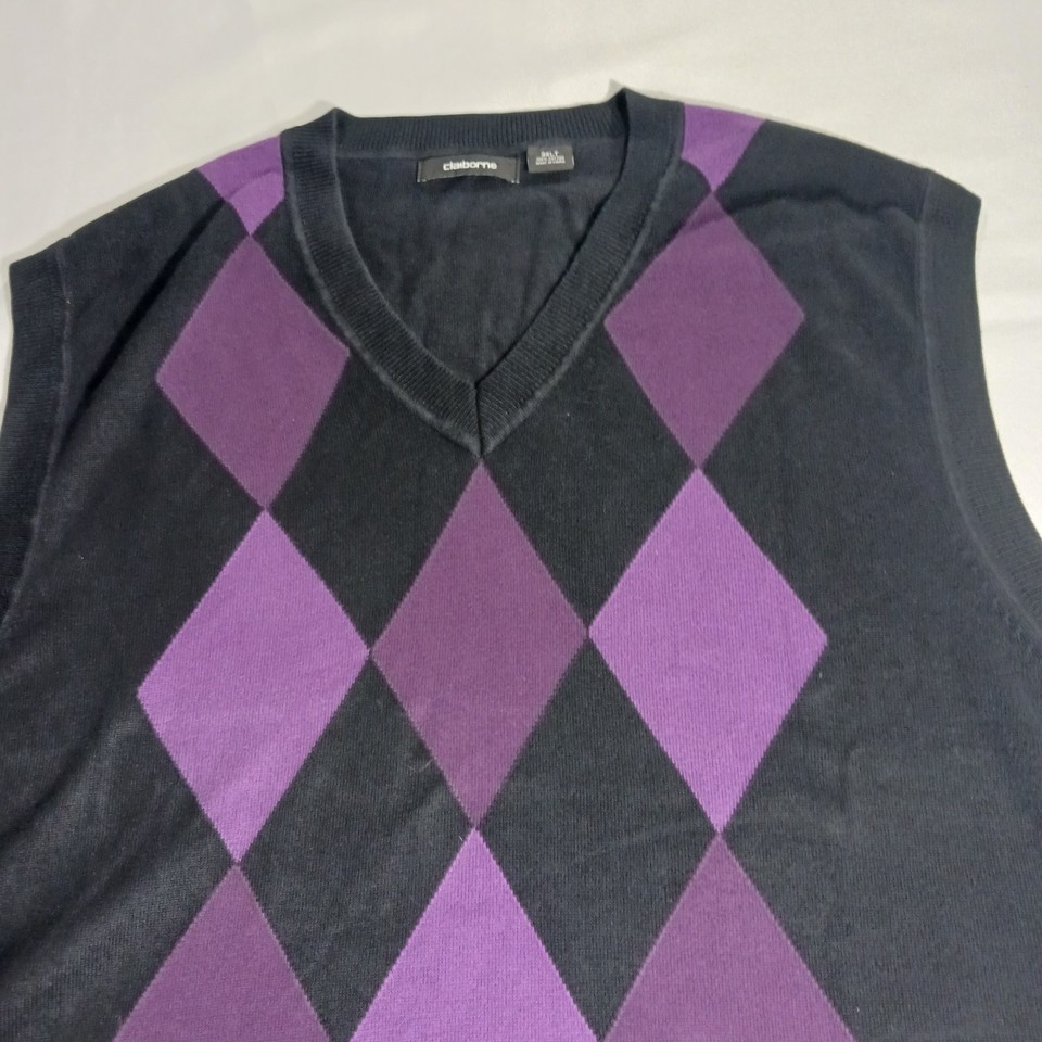 • Claiborne Women's Knit Black Cotton Vest Sweater Size 3XLT Black w/Purple Argyle image 1