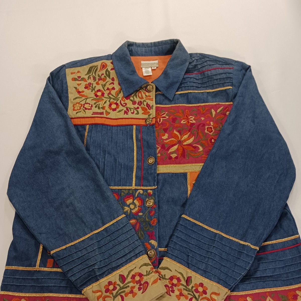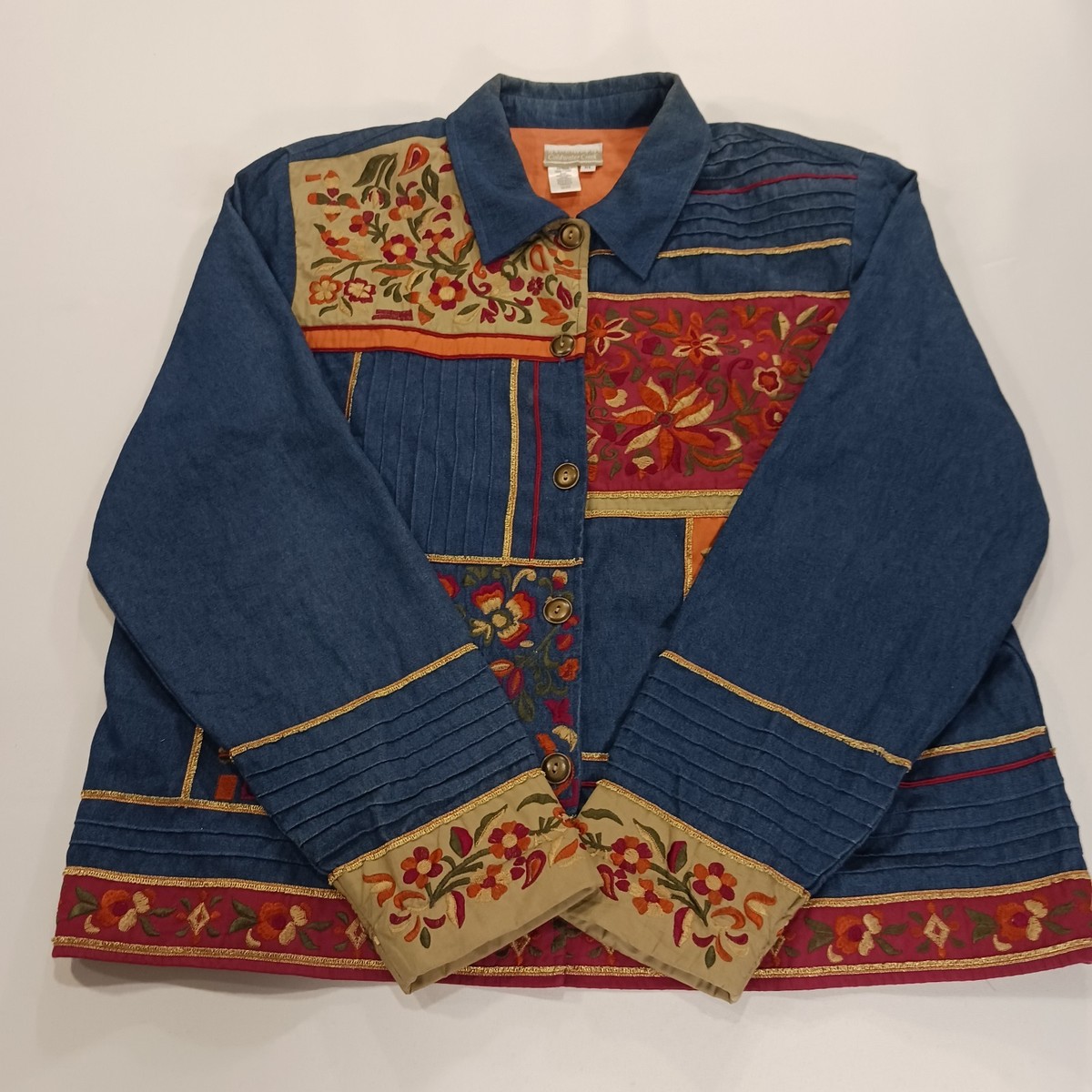 The Coldwater Creek RN#98516 Women's Blue Floral Applique Embroidered Jacket in size XL is a stylish and versatile outerwear piece perfect for various occasions. Made from cotton with a floral pattern, this jacket features long sleeves, button closure, and a lining made of acetate. The jacket embodies a bohemian theme with embroidered and applique accents, making it a unique addition to any wardrobe. With a regular fit and length of 26 inches, this jacket is ideal for wearing in the summer, fall, and spring seasons. Originating from India, this jacket offers a blend of art to wear style with a touch of colorful flair.