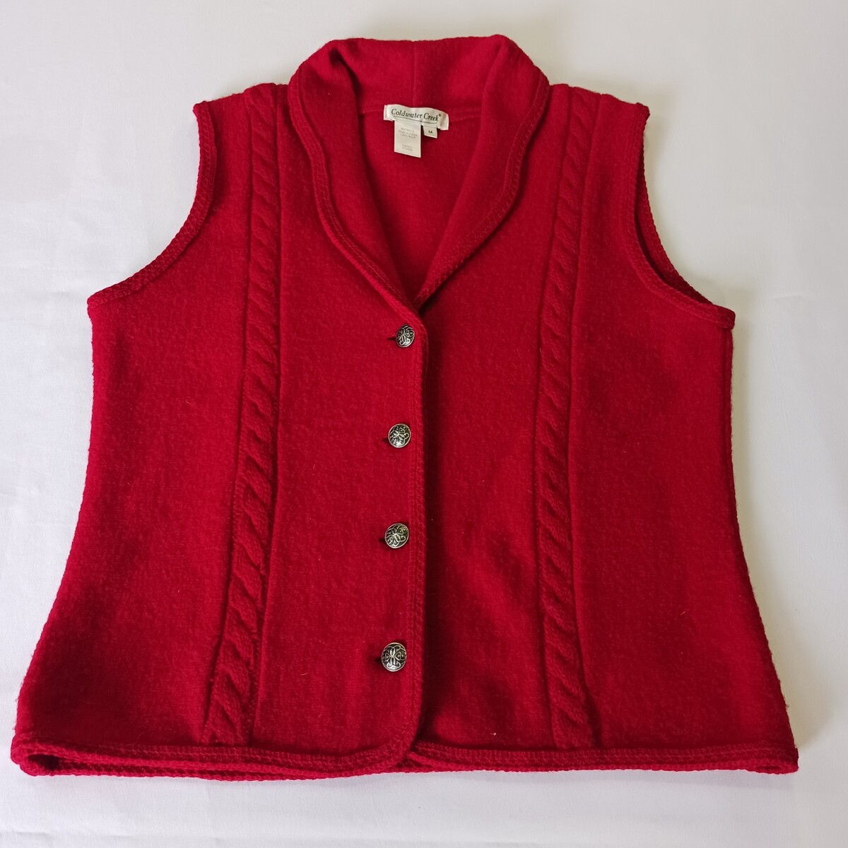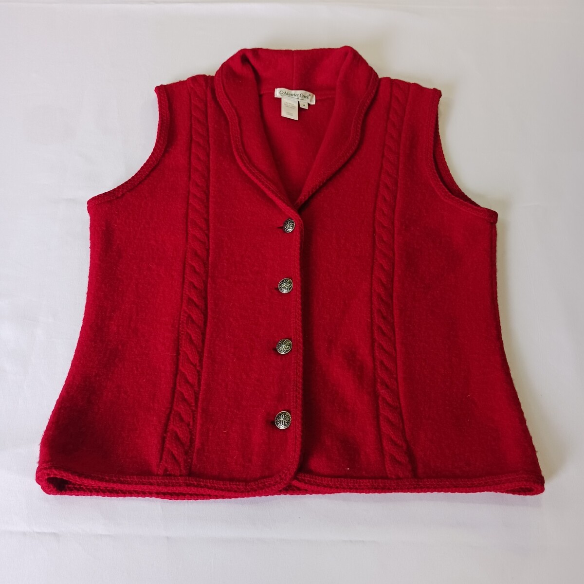 The Coldwater Creek RN#98516 Women's Red Front Button 100% Wool Sleeveless Vest in size M is a stylish and versatile outerwear piece suitable for various occasions. Made of high-quality wool and featuring a solid red color, this vest has a classic design with a front button closure and a sleeveless style. Perfect for travel, parties, casual outings, or business meetings, this vest is both fashionable and practical, adding a pop of color to your winter, fall, or spring wardrobe. With a regular fit and a knit fabric type, this vest is sure to be a go-to piece for any season.